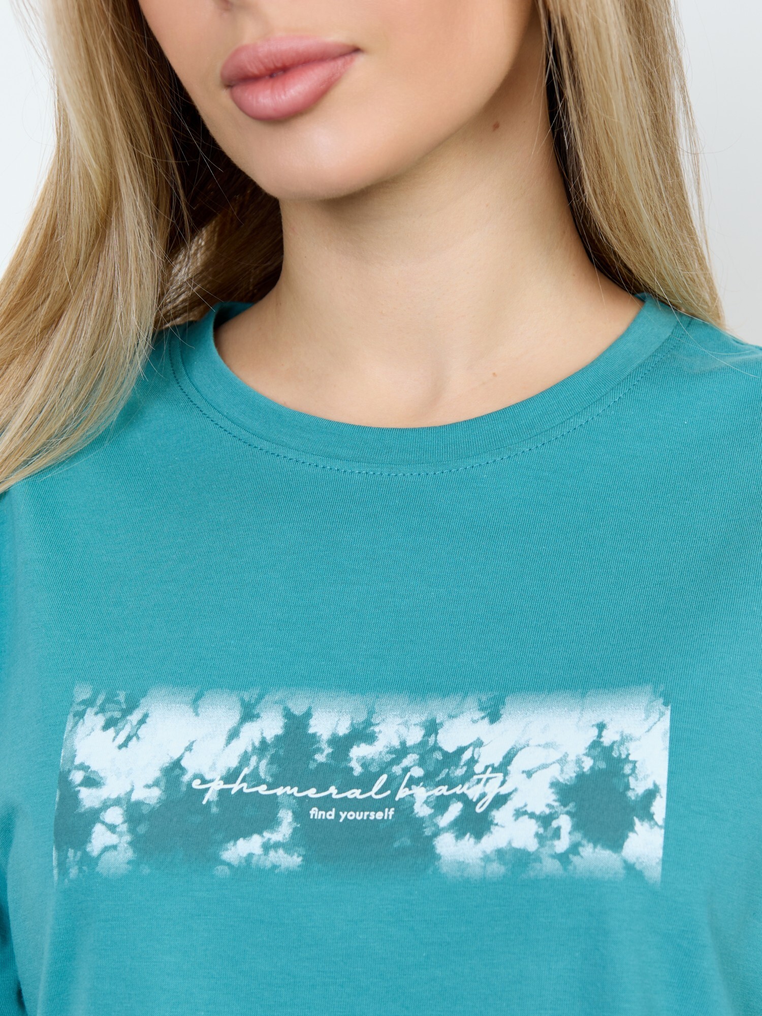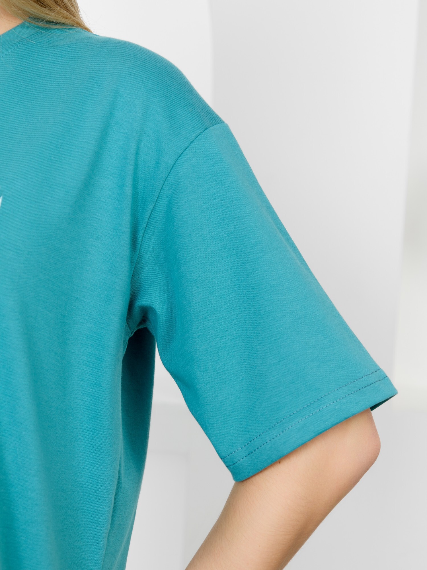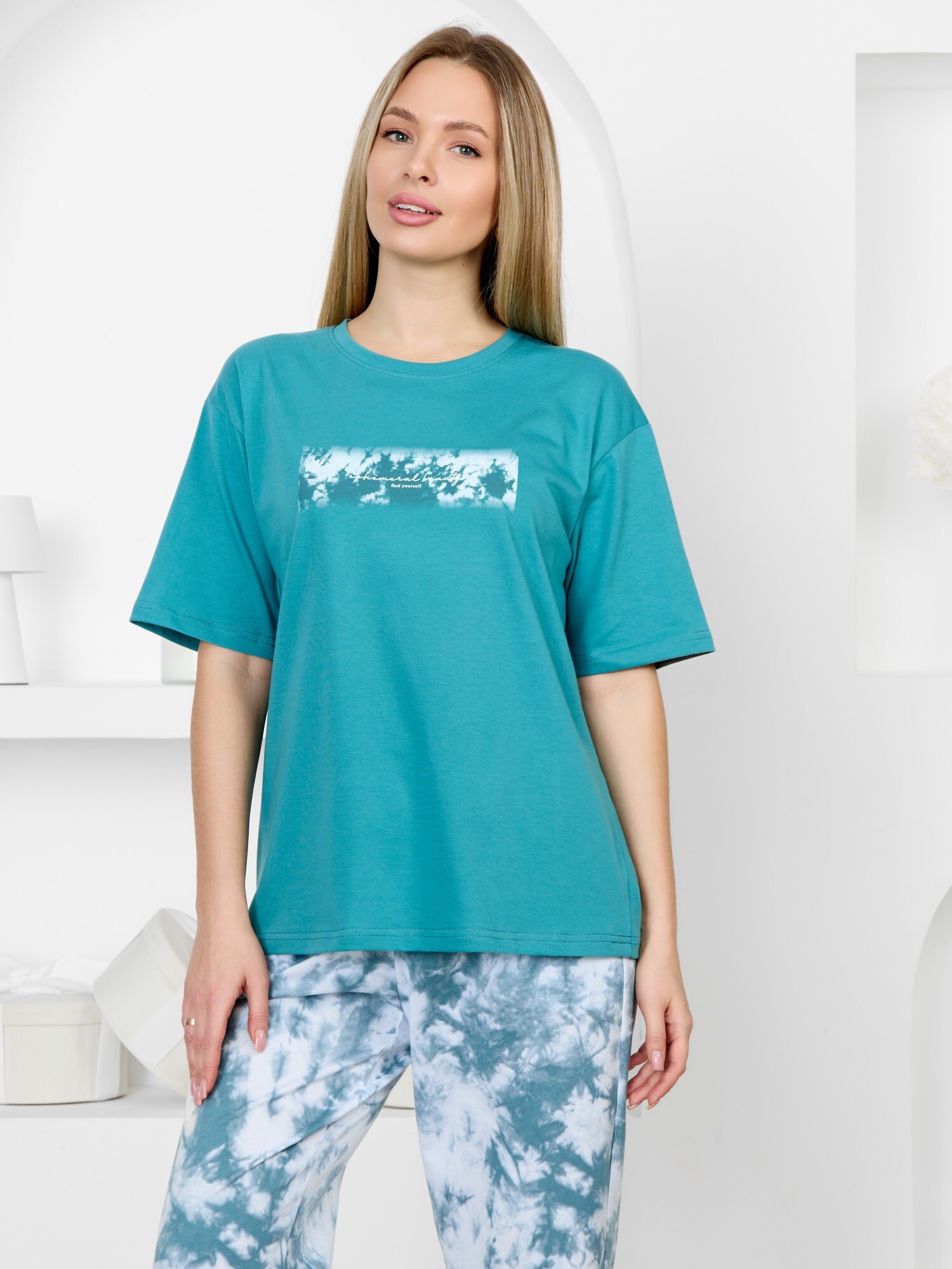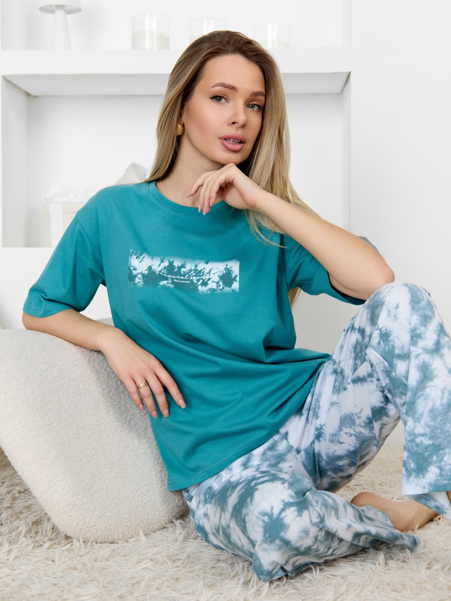 Костюм молодежный из трикотажного полотна «кулирка» в сочетании двух видов тканей гладкокрашеной и с набивным рисунком, состоящий из футболки и брюк.Футболка – свободного покроя из гладкокрашеного полотна, с короткими втачными рукавами, горловиной овальной формы, обработанной притачной бейкой, выполненным в технике «шелкографии».Брюки - из полотна с набивным рисунком, прямые, длинные, с карманами в боковых швах, на притачном поясе с эластичной тесьмой внутри.
