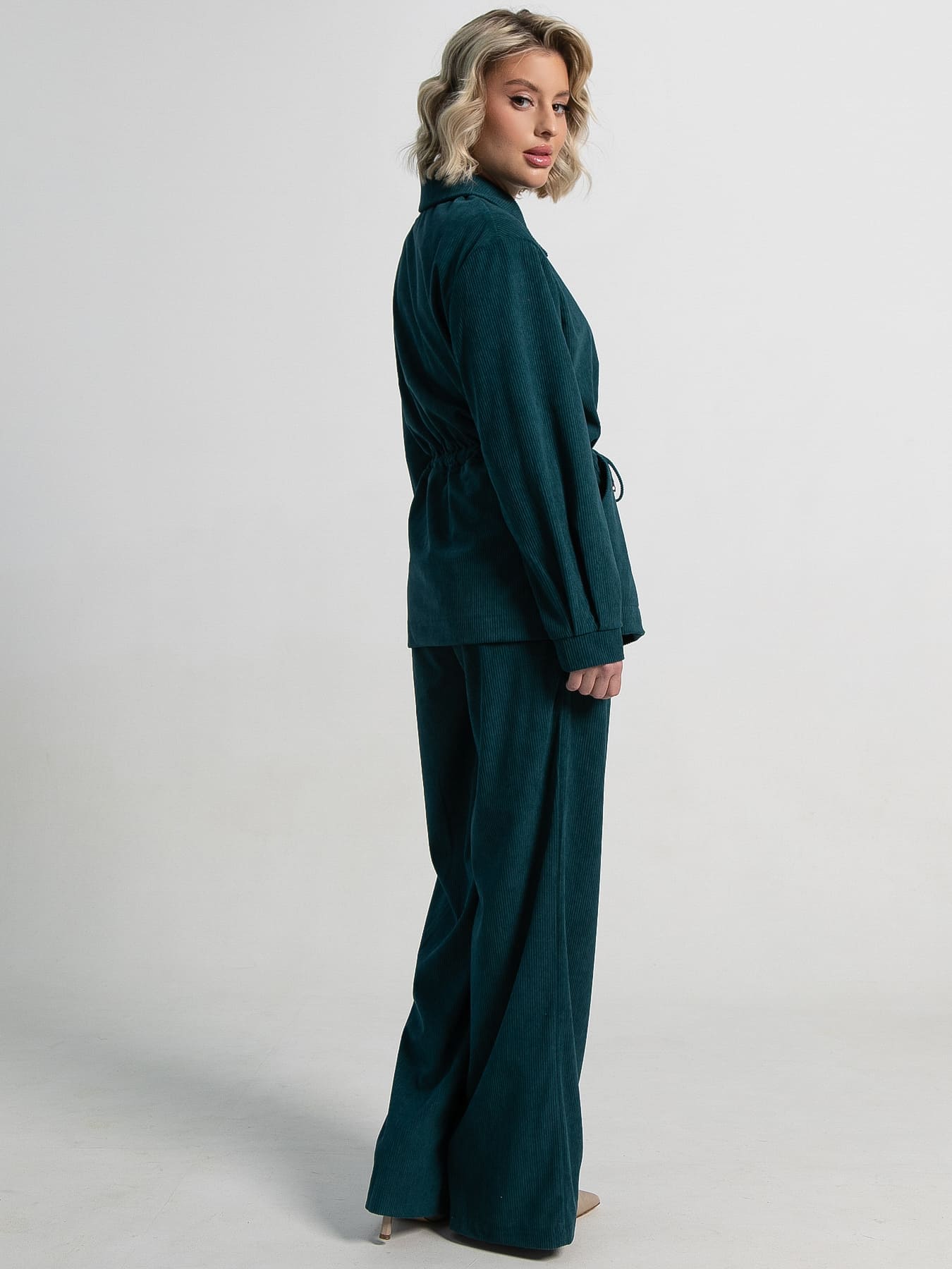 Стильный и комфортный брючный женский костюм из вельвета в изумрудном цвете. Этот костюм создан для тех, кто ценит безупречный городской стиль и непревзойденный комфорт. Костюм включает в себя прямые широкие брюки на комфортной резинке по талии, которые создают актуальный силуэт. Верхняя часть костюма имеет длинные рукава, карманы и воротник рубашечного типа. Добавьте этот изумрудный вельветовый костюм в свой гардероб, чтобы каждый день наслаждаться сочетанием стиля, комфорта и элегантности!