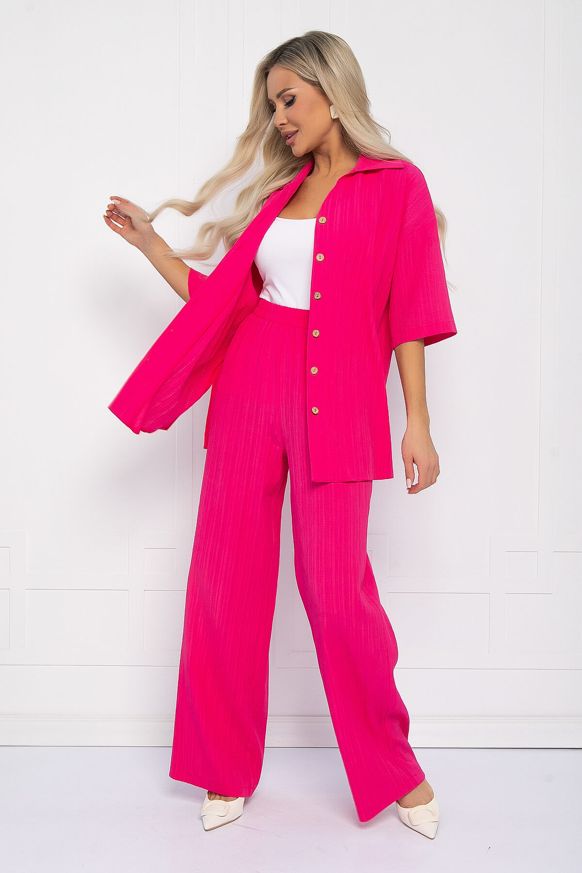 Лёгкость, воздушность и оригинальность – это всё про стильный брючный костюм из приятной ткани с жатым эффектом. Невероятная удлиненная блуза имеет свободный крой, комфортный приспущенный рукав и разрезы по бокам. Оригинальные пуговицы подчеркнут индивидуальность вашего образа. Свободные брюки в стиле палаццо придают костюму лёгкость и особый шик. Брюки имеют пояс на комфортной резинке, что позволяет чувствовать себя свободно и не сомневаться при выборе размера. Свободный силуэт костюма подходит абсолютно для любой фигуры. Костюм актуален как для деловых встреч, праздничных мероприятий, так и для романтических свиданий.