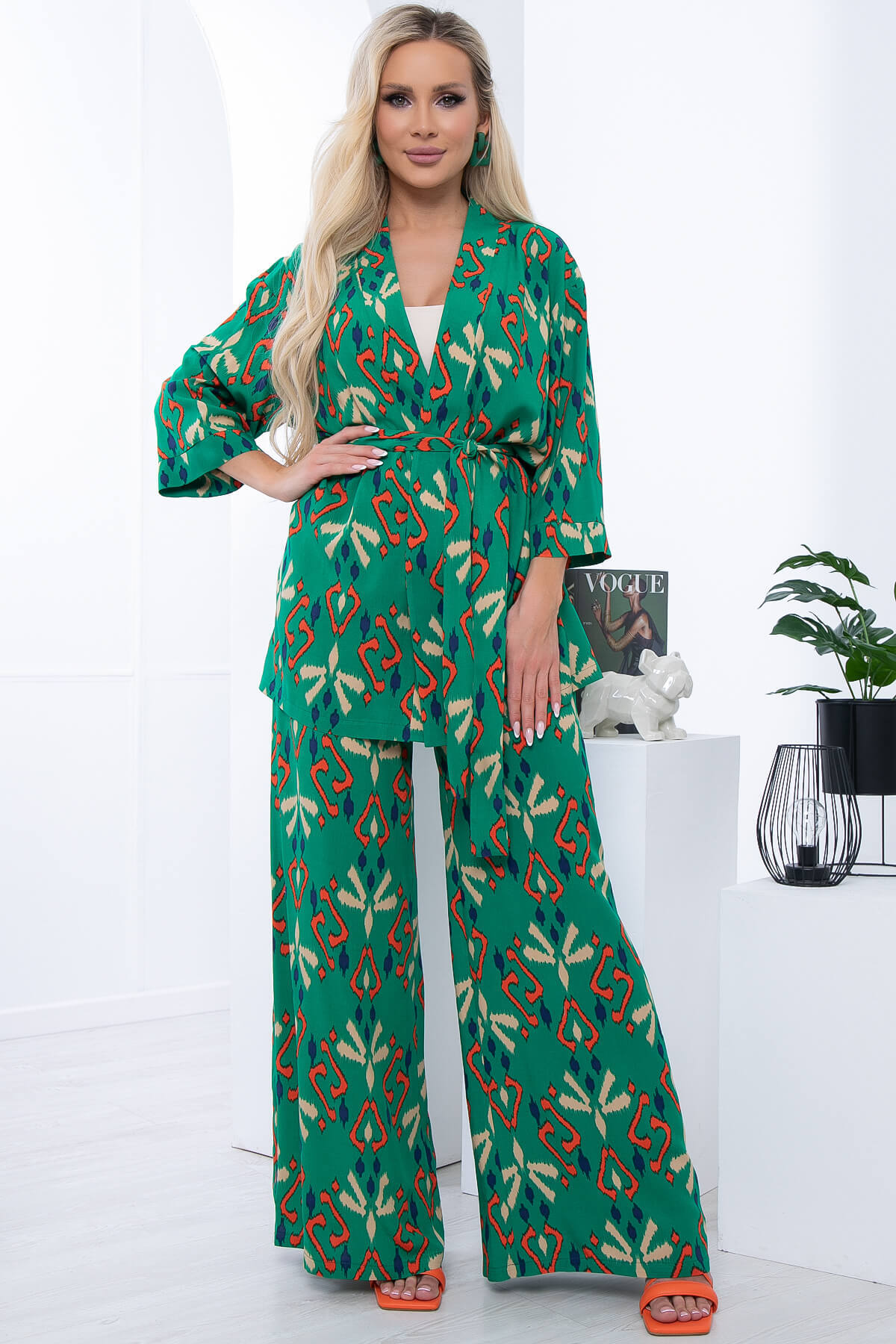 Костюм из лёгкой ткани идеально подойдёт для летнего расслабленного образа. Свободный крой не сковывает движений и дарит комфорт. Рукав укороченный со спущенным плечевым швом.В комплект входит пояс из основной ткани, который позволит подчеркнуть преимущества фигуры.