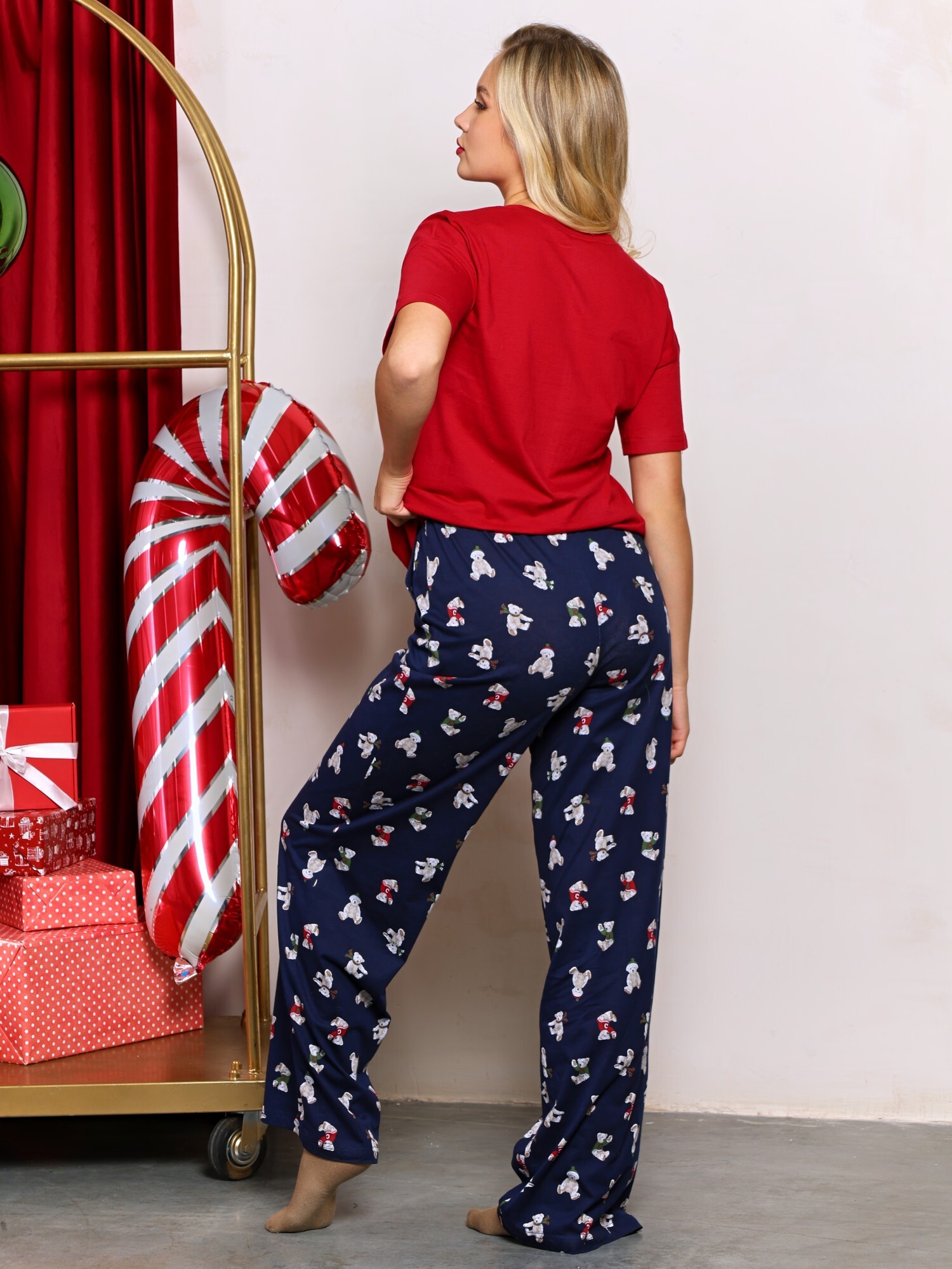 Костюм женский из трикотажного полотна "кулирка" в комбинации двух видов: гладкокрашеного и набивного с тематическим рисунком, состоящий из футболки и брюк. Футболка из гладкокрашеного полотна, классического покроя, с коротким втачными рукавами, горловиной овальной формы, обработанной втачной планкой и отделочной строчкой. В центре переда - принт, выполненгный в технике шелкографии. Брюки из полотна с набивным рисунком длинные, прямые, на притачном поясе с эластичной тесьмой внутри и карманами в боковыых швах.