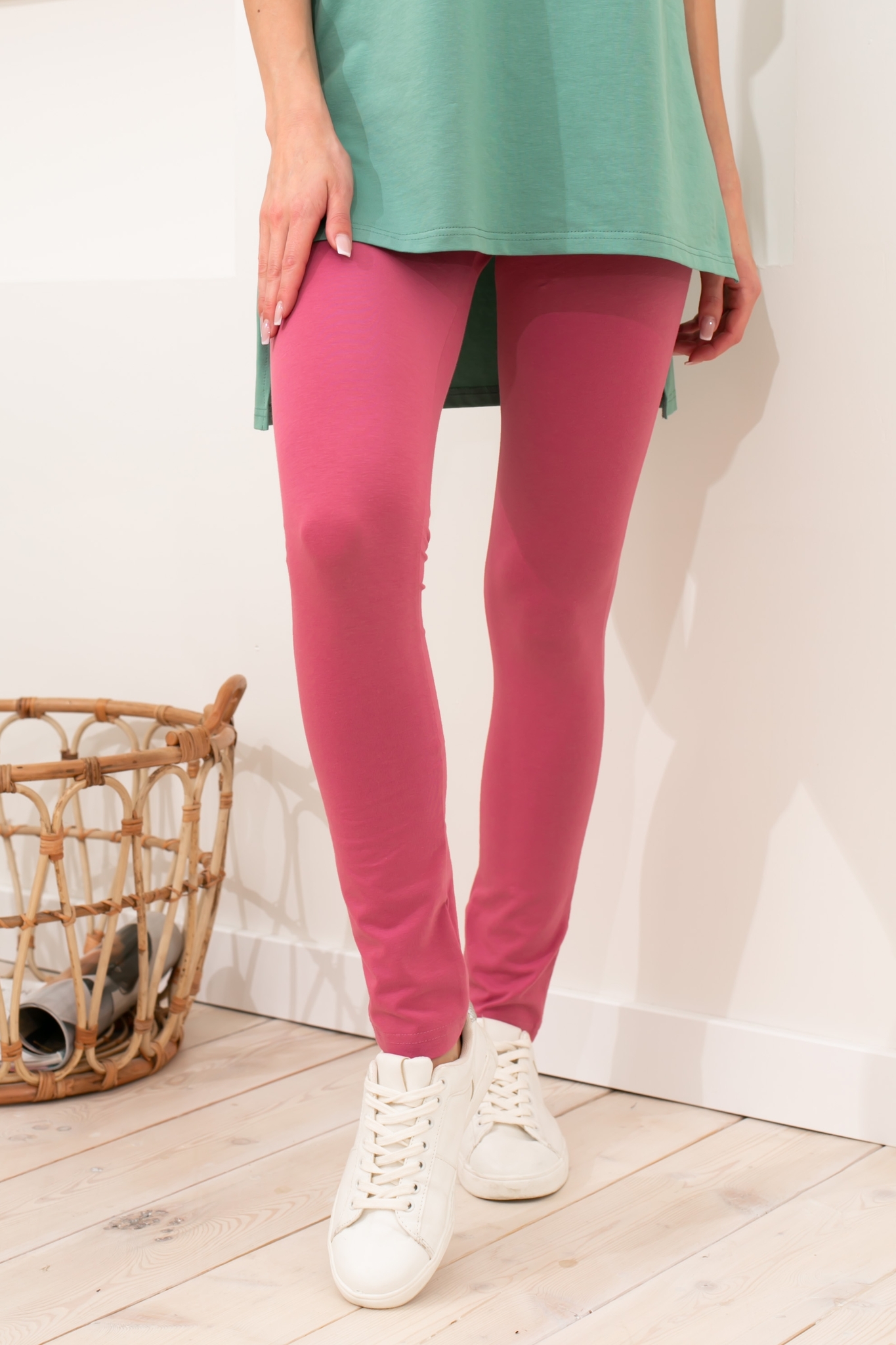 Универсальные легинсы прилегающего силуэта выполнены из трикотажного полотна - кулирка. Втачной пояс на широкой резинке обеспечивает удобную посадку на талии. Модель без застежек и карманов.