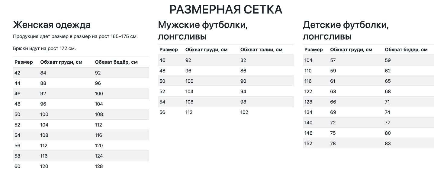| Обхват груди, см | 98 | 102 | 106 | 110 |