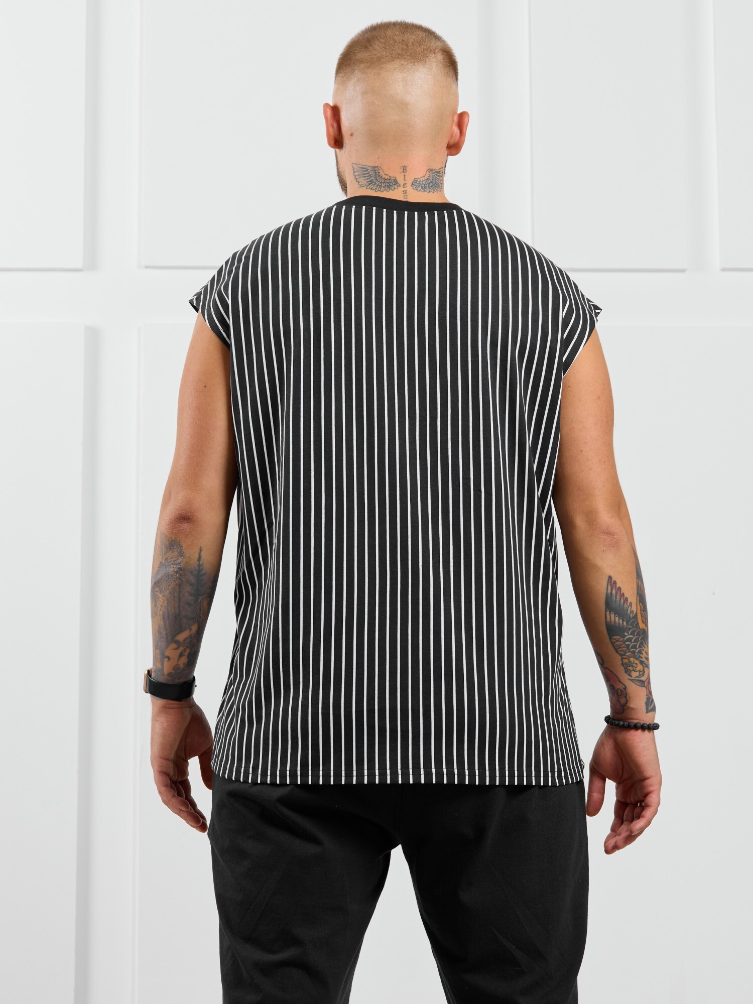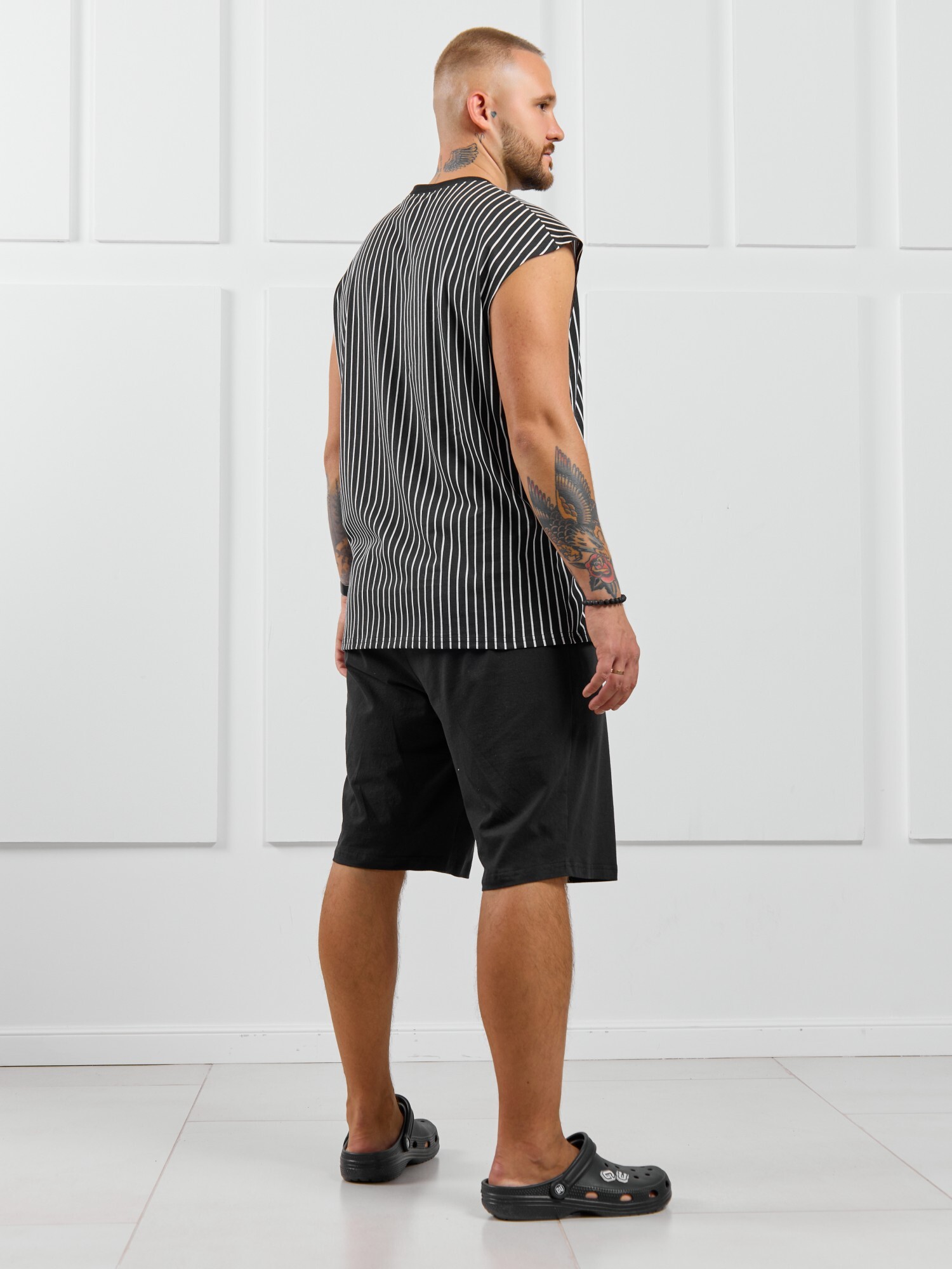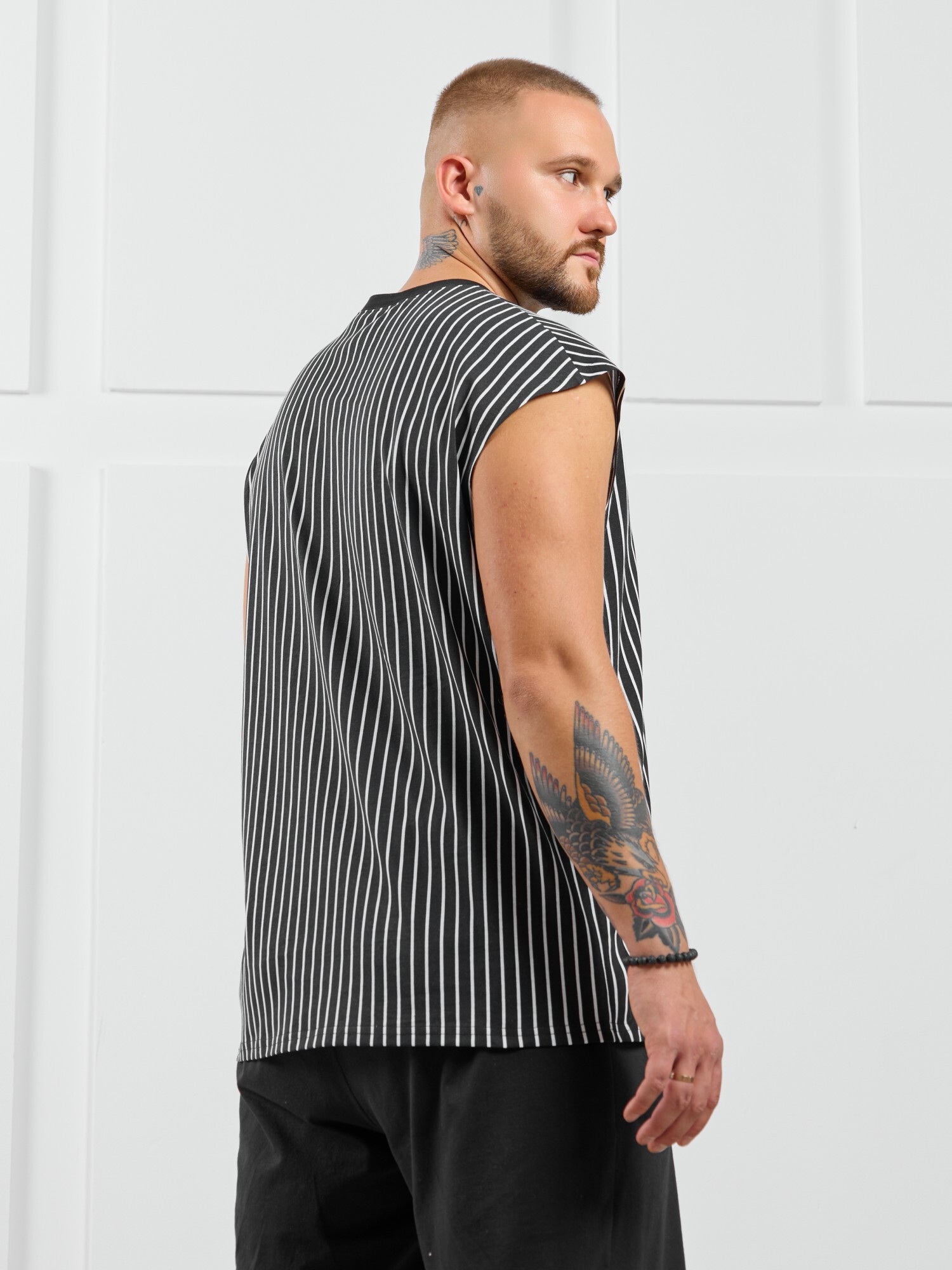 Майка мужская из трикотажного полотна с набивным рисунком в узкую черно-белую полоску. Модель свободная, со спущенной линией плеч, с принтом на груди. Овальная горловина обработана однотонно деталью.