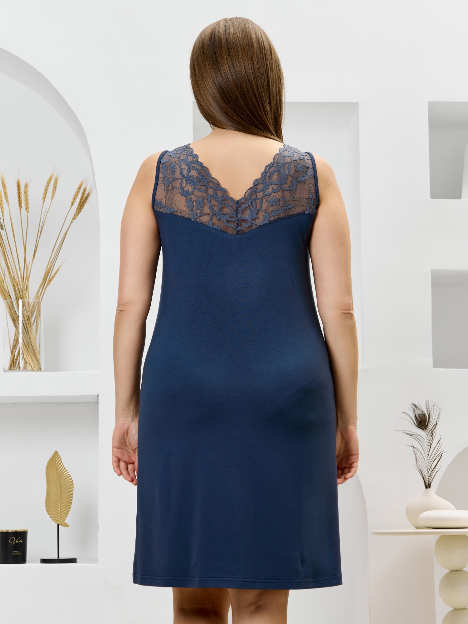Сорочка женская из гладкокрашеного трикотажного вискозного полотна, без рукавов, полуприталенного силуэта, слегка расширенная книзу. V-образная горловина полочки и спинки отделана кружевными кокетками треугольной формы. Проймы окантованы основным материалом.