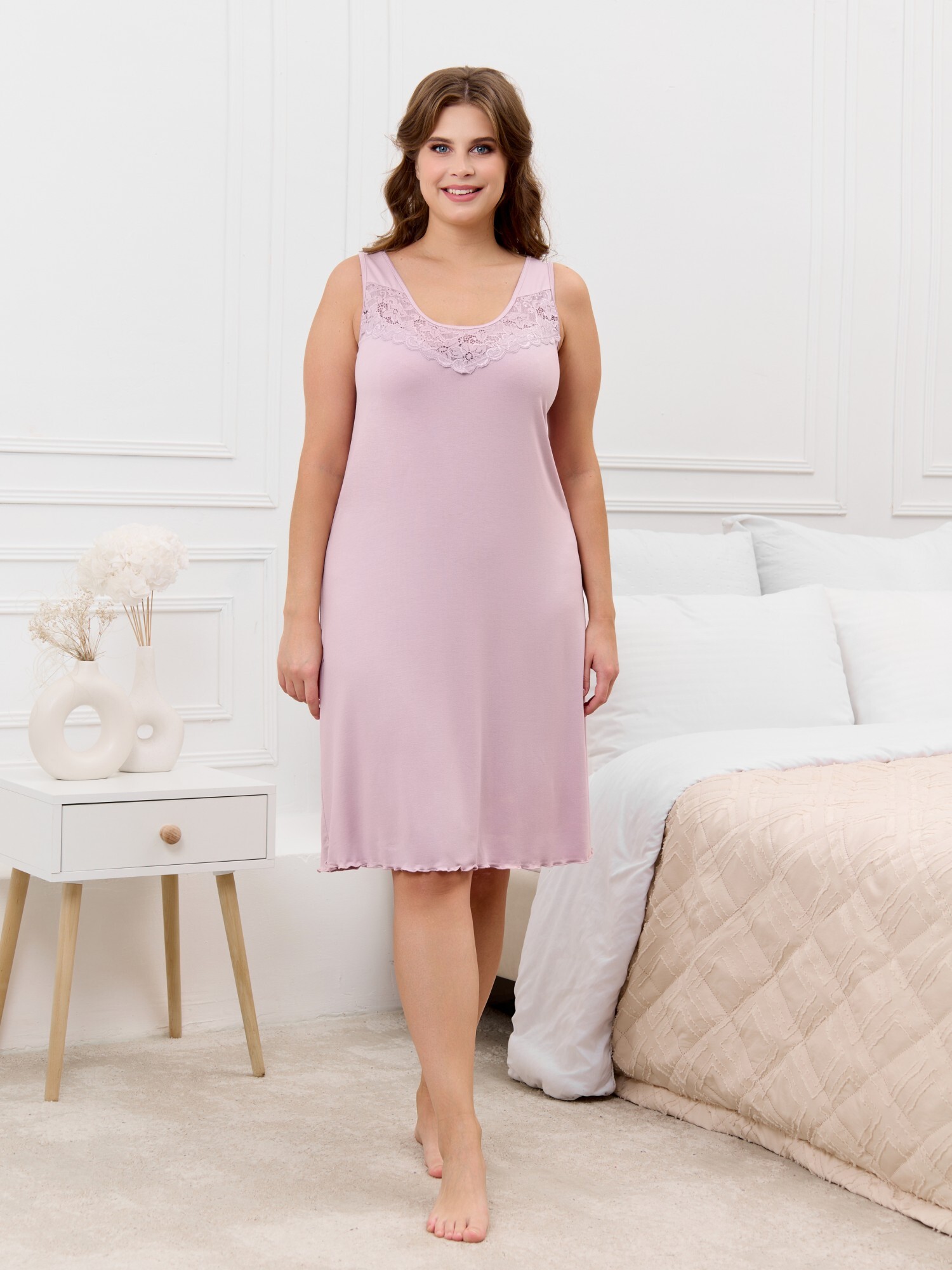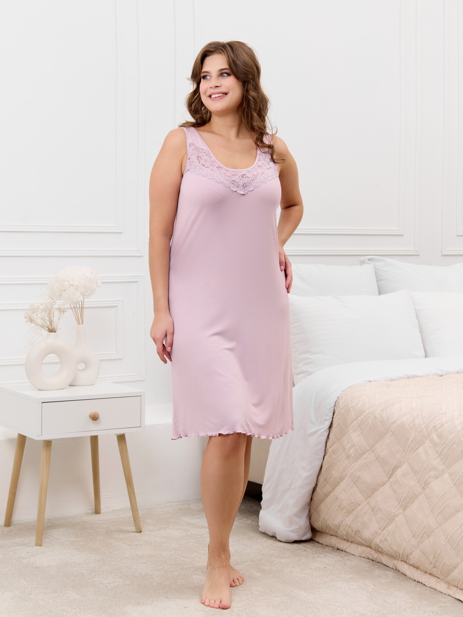 Сорочка женская из гладкокрашенного трикотажного вискозного полотна, слегка расширенная книзу, без рукавов на широких бретелях, с горловиной овальной формы. На полочке V- образная притачная кокетка из кружева, на спинке - углубленный вырез с кружевной поперечной вставкой. Горловина и проймы окантованы основным материалом, низ отделан узкой обметочной строчкой, создающей волнистый край.
