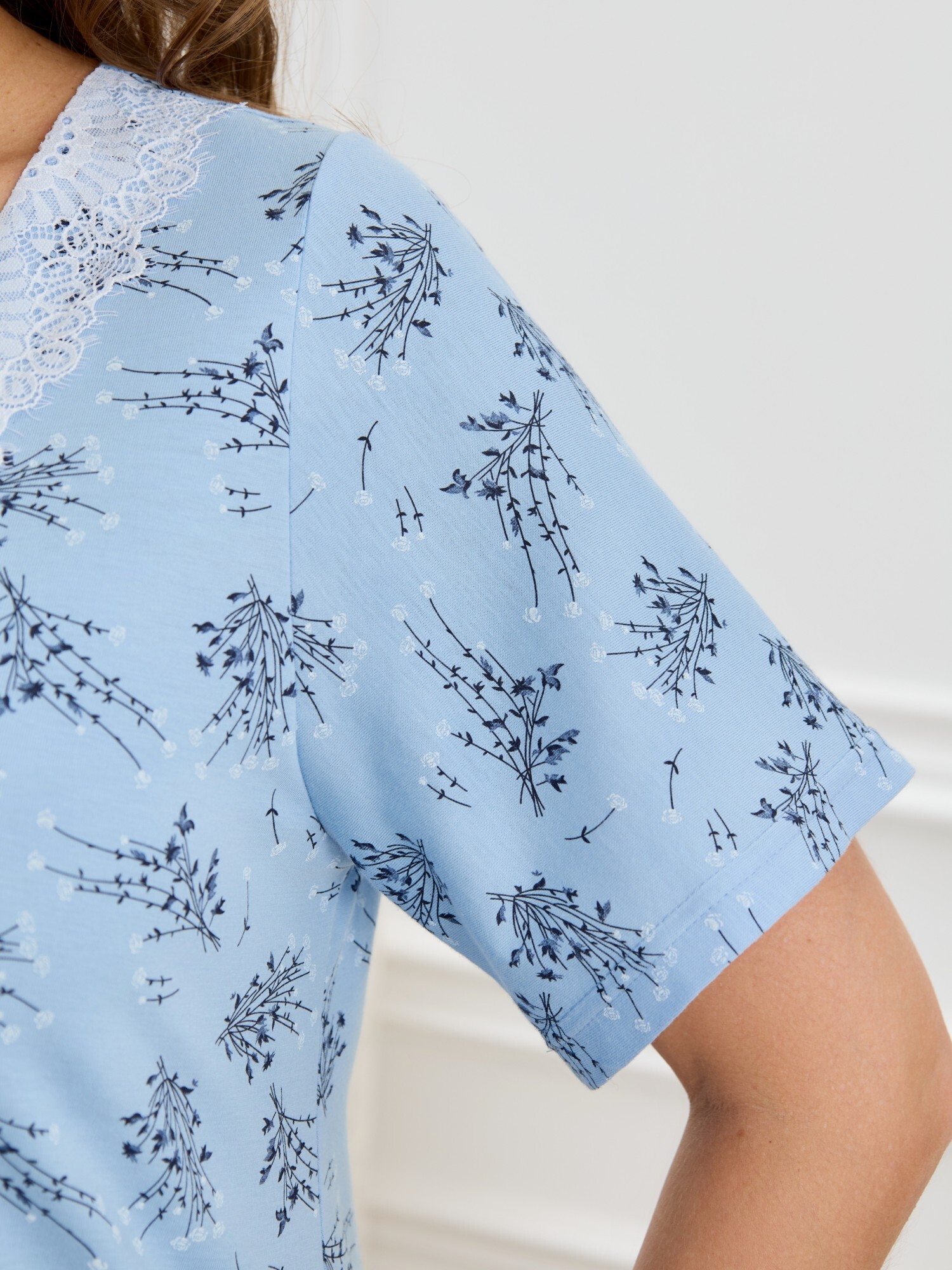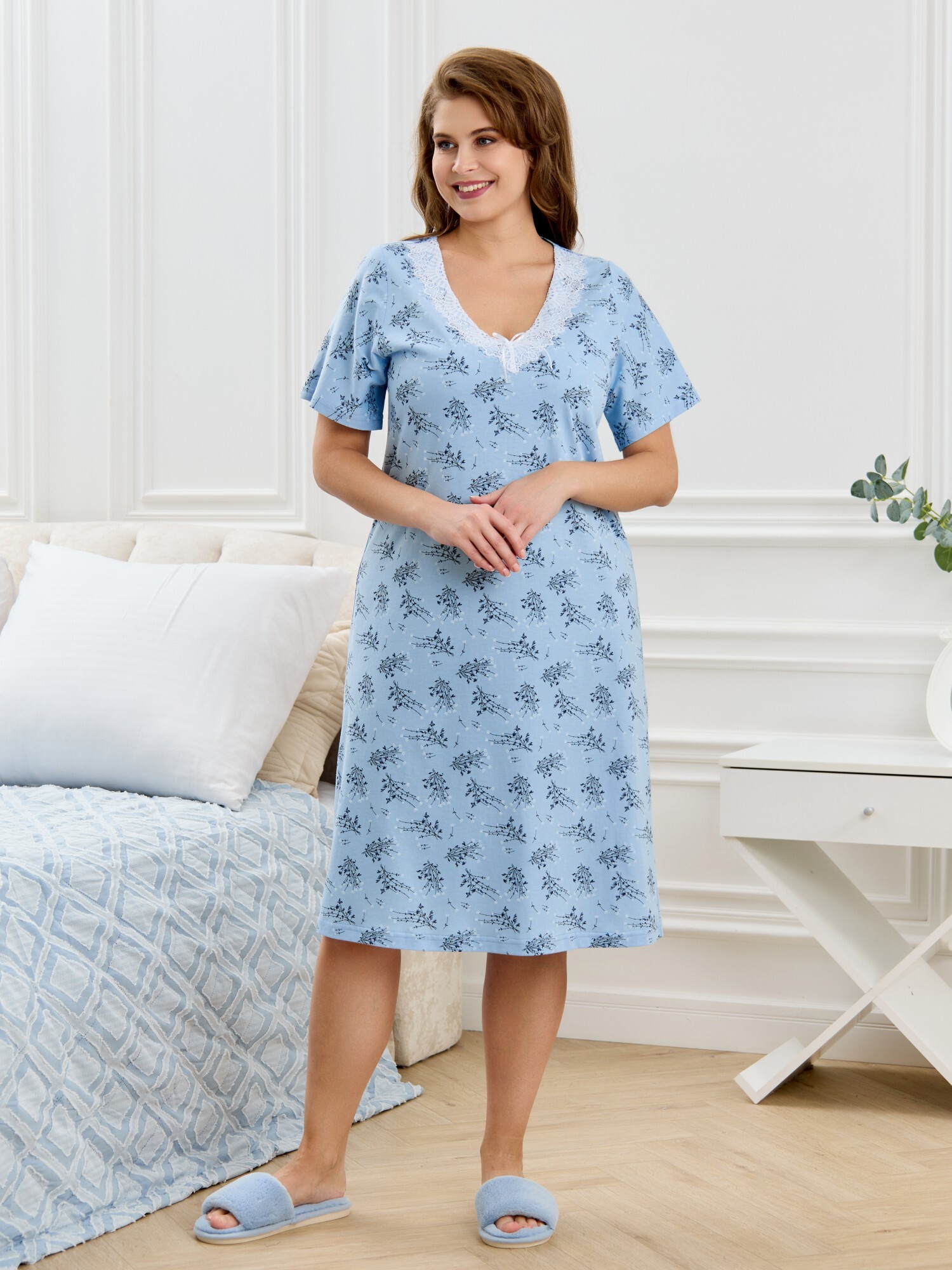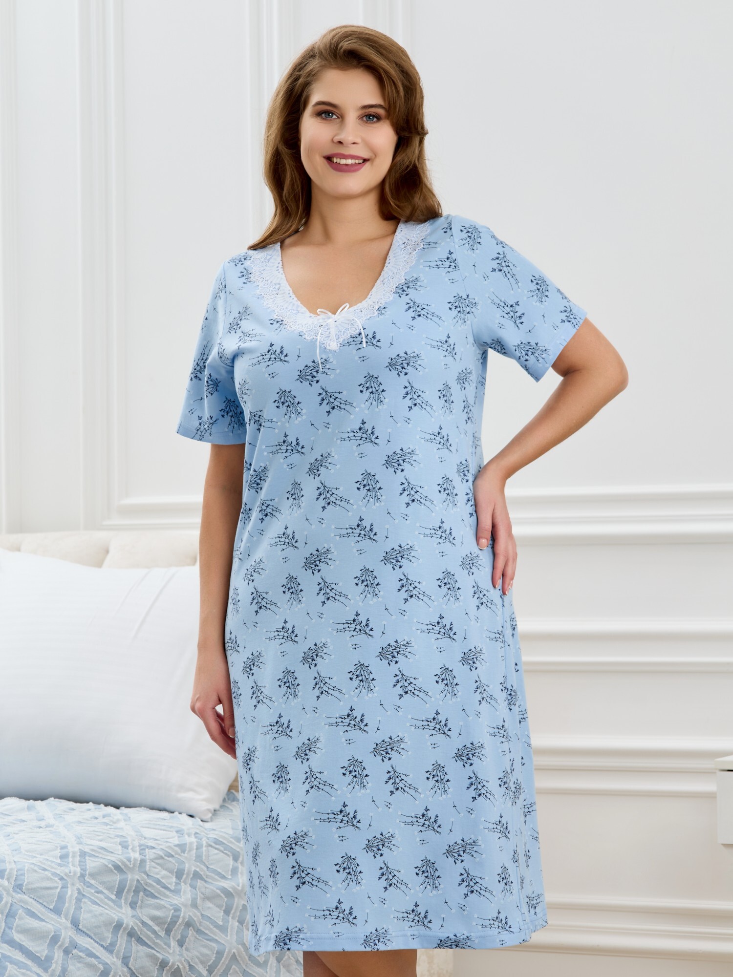 Сорочка женская из трикотажного полотна «кулирка» с набивным рисунком, полуприталенного силуэта, слегка расширенная к низу, с короткими втачными рукавами. Горловина V- образной формы, обработана кружевом с фестонным краем, по центру настрочен декоративный бантик из узкой атласной тесьмы.