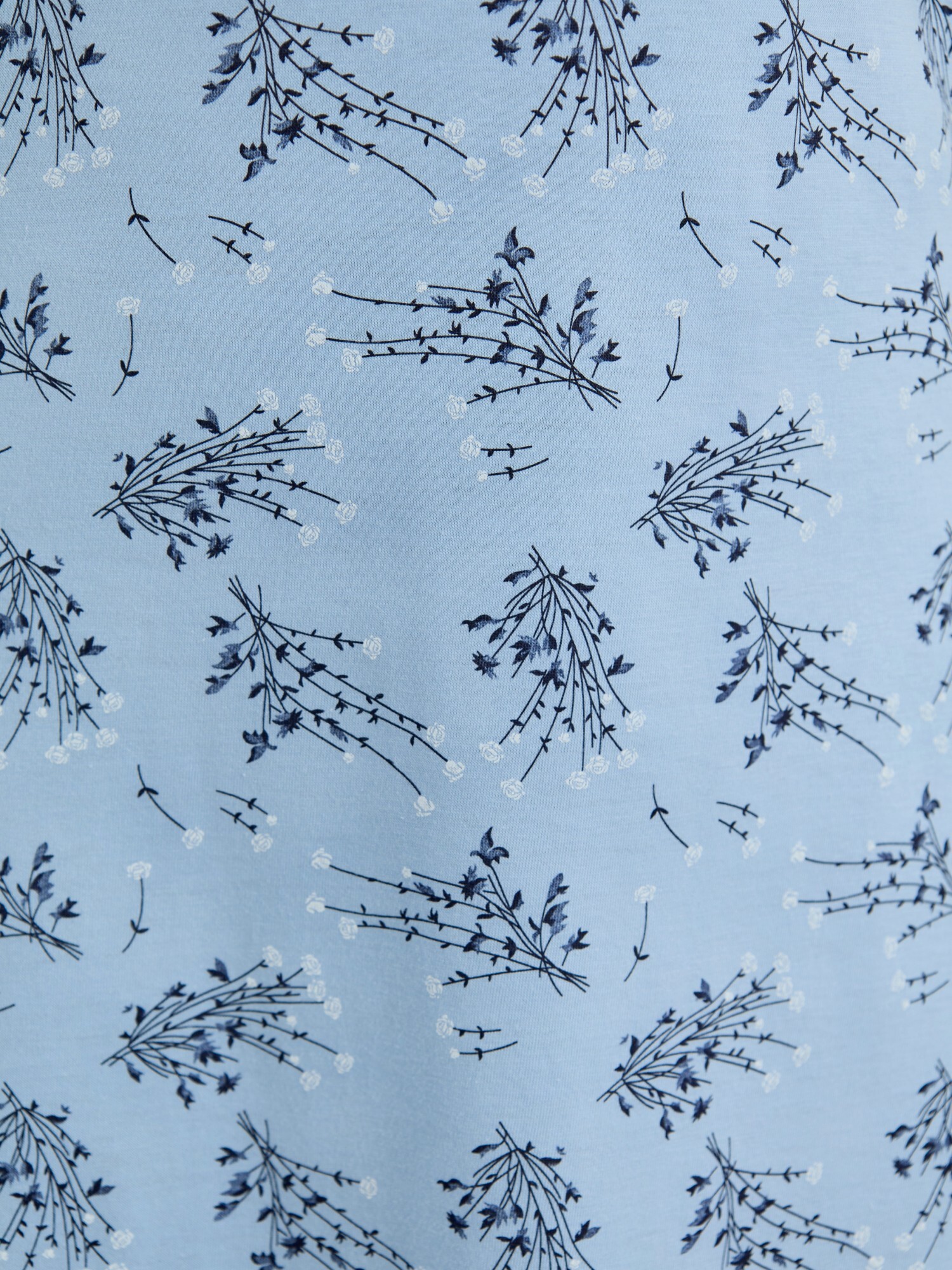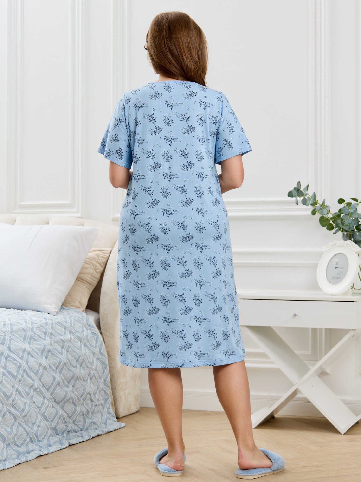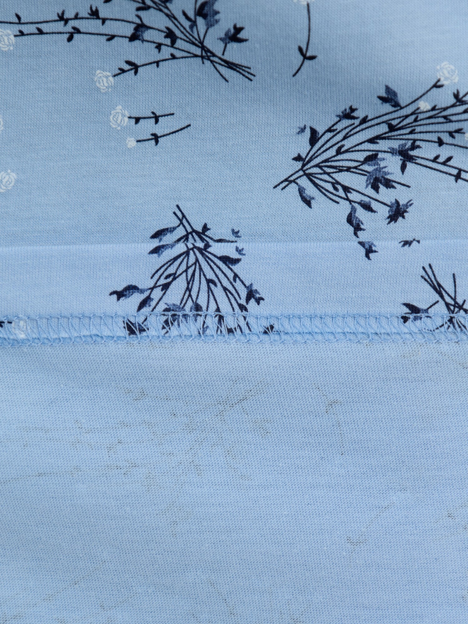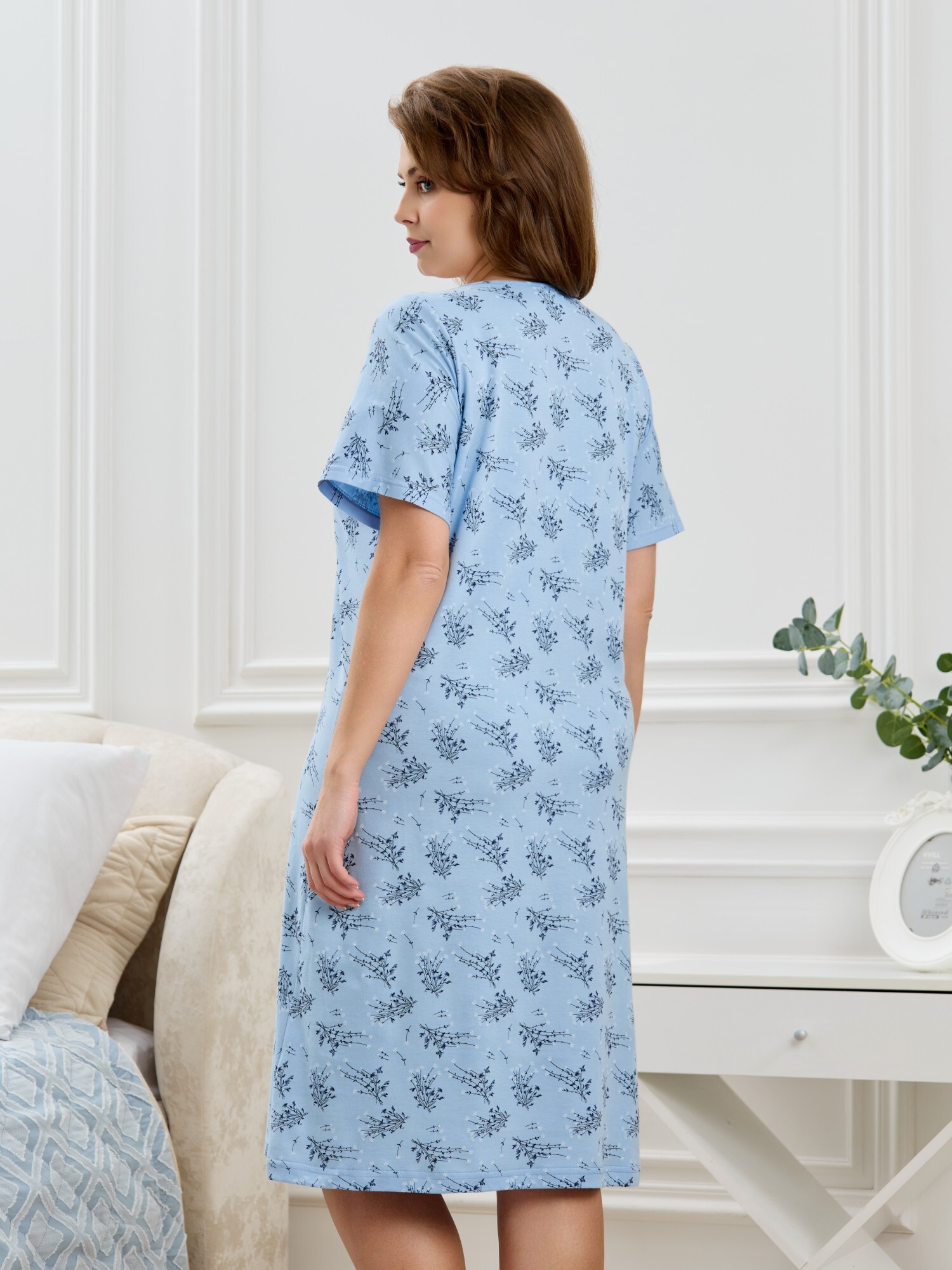 Сорочка женская из трикотажного полотна «кулирка» с набивным рисунком, полуприталенного силуэта, слегка расширенная к низу, с короткими втачными рукавами. Горловина V- образной формы, обработана кружевом с фестонным краем, по центру настрочен декоративный бантик из узкой атласной тесьмы.