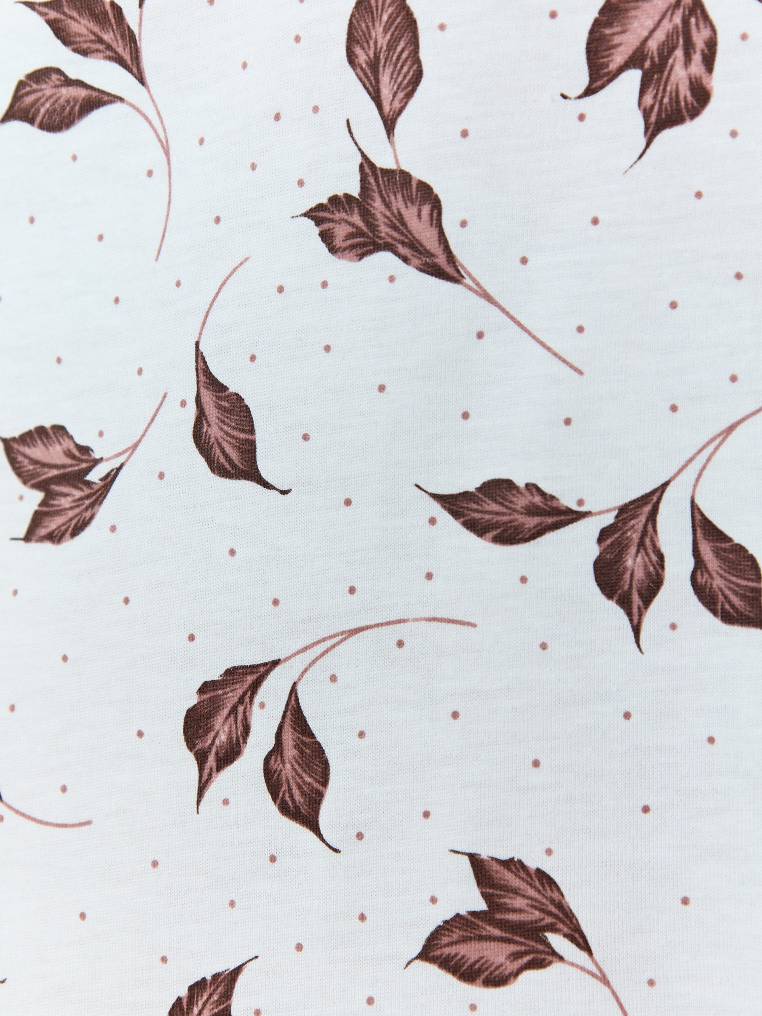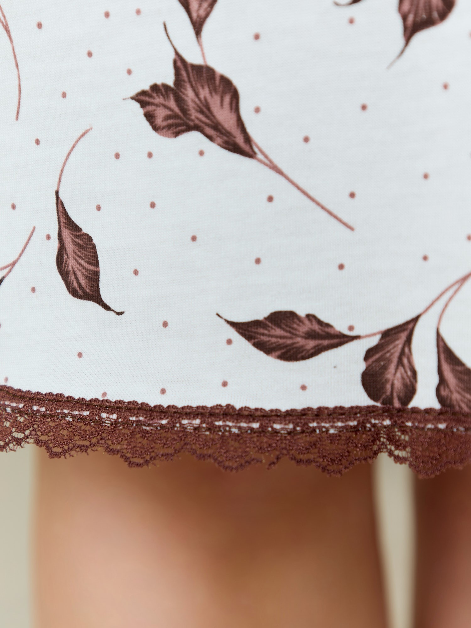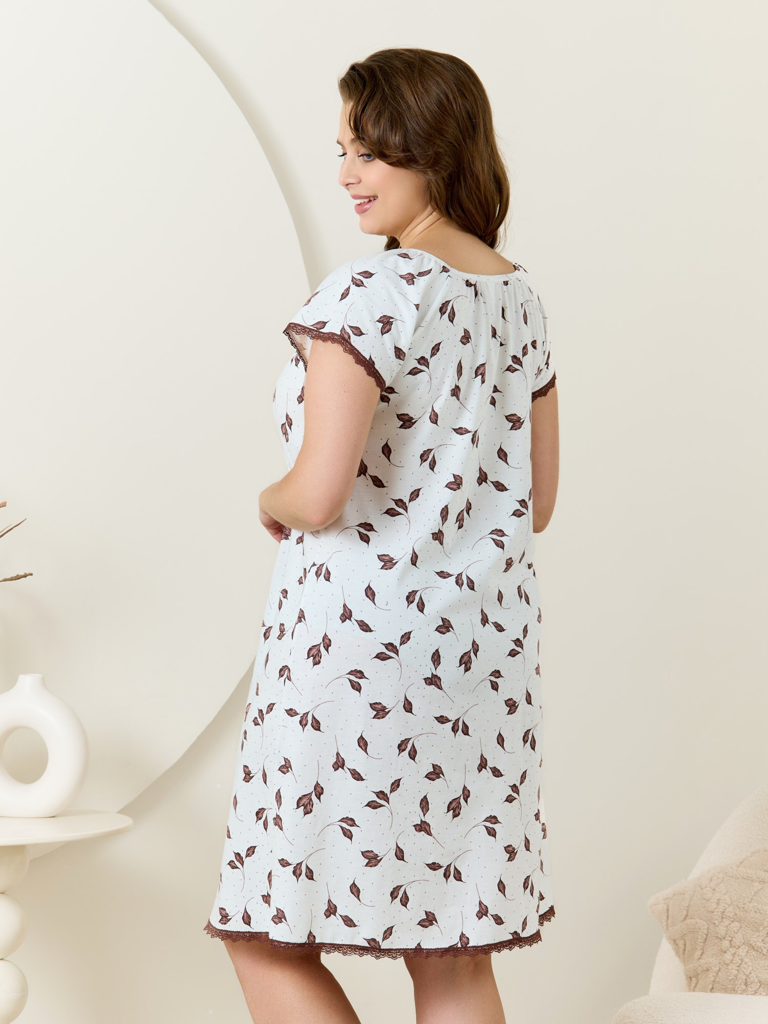 Сорочка женская из трикотажного полотна «кулирка» с набивным рисунком, свободного покроя, расширенная книзу, с короткими рукавами «реглан», овальной горловиной, окантованной основным материалом. Полочка, спинка и рукава присборены по горловине. Низ изделия и нижние срезы рукавов обработаны узким кружевом.