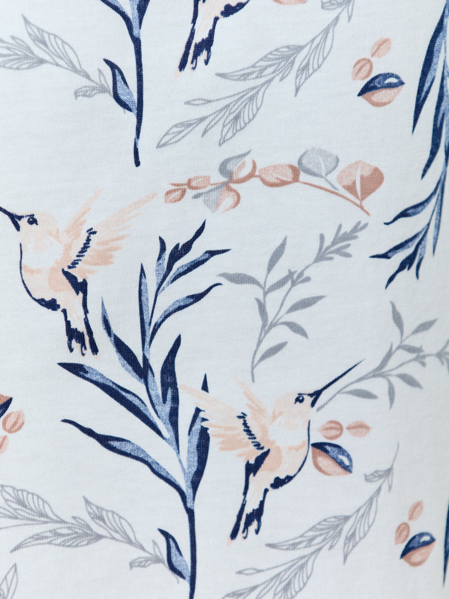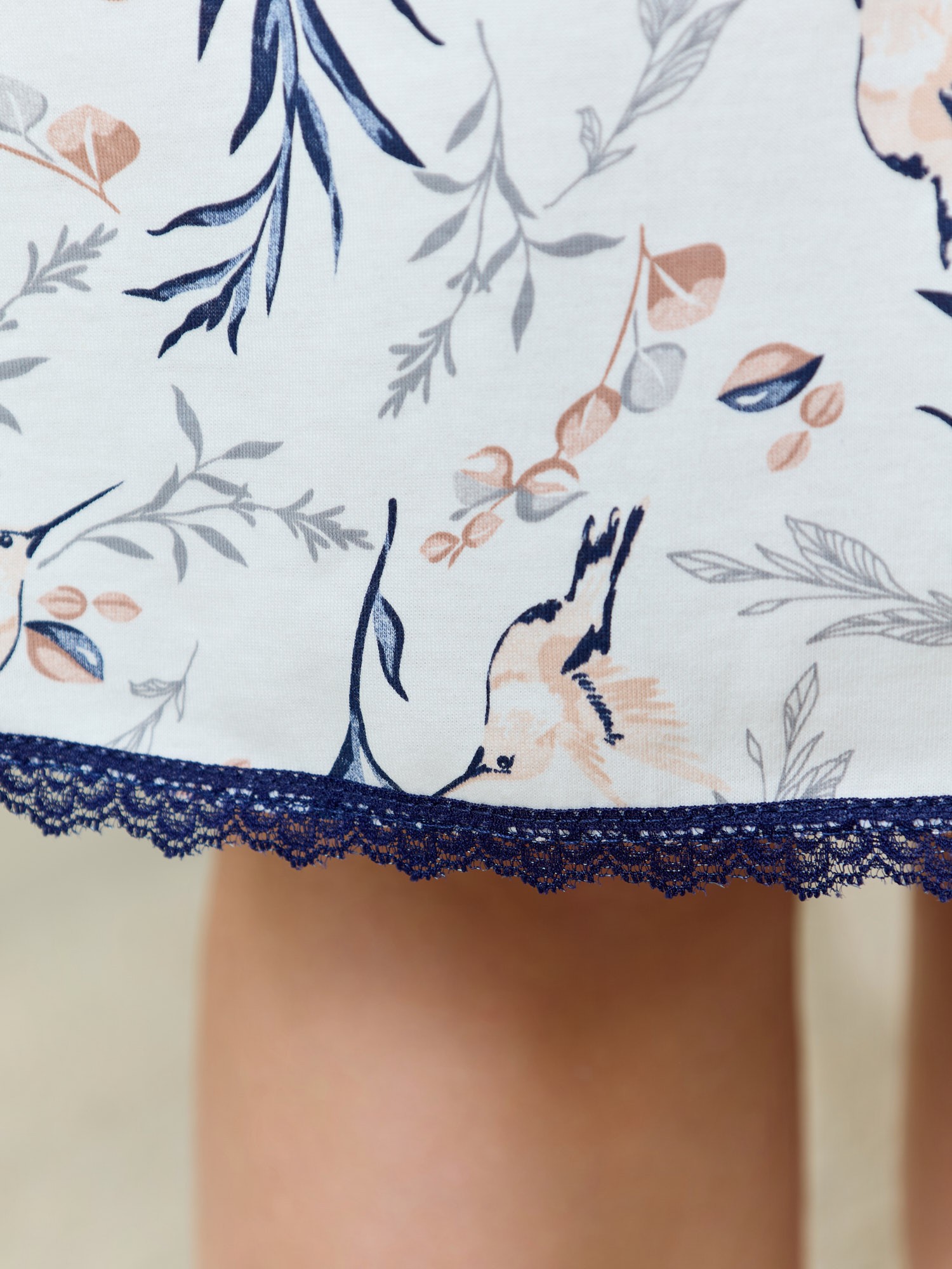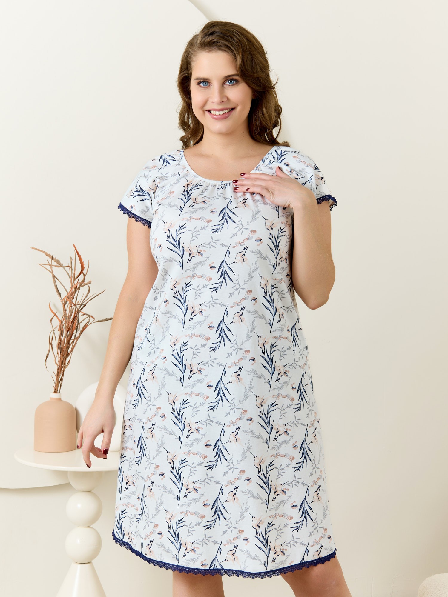 Сорочка женская из трикотажного полотна «кулирка» с набивным рисунком, свободного покроя, расширенная книзу, с короткими рукавами «реглан», овальной горловиной, окантованной основным материалом. Полочка, спинка и рукава присборены по горловине. Низ изделия и нижние срезы рукавов обработаны узким кружевом.