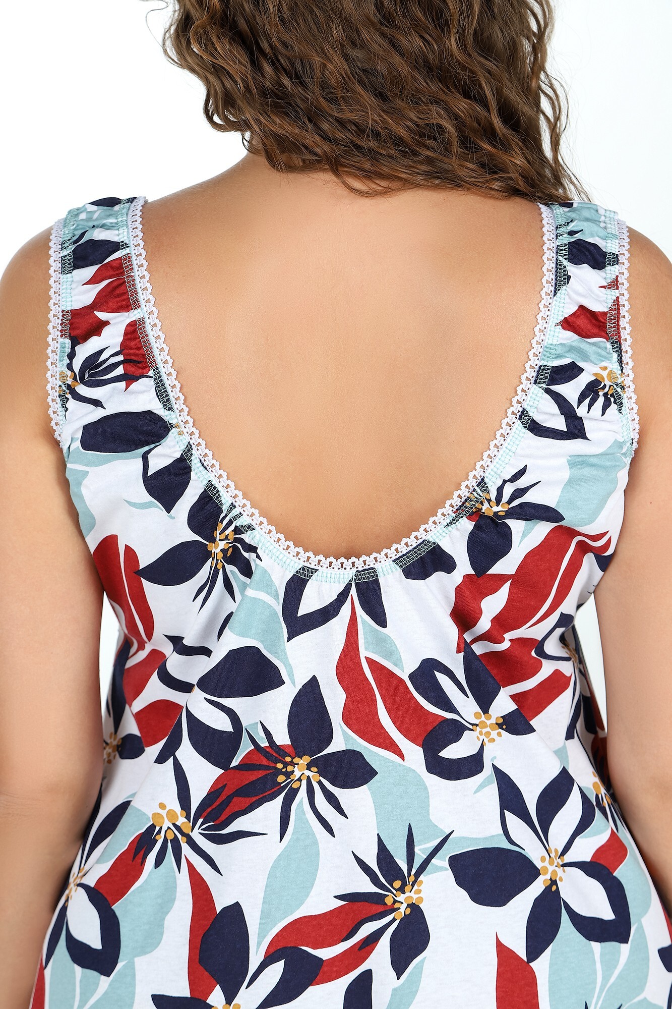 Сорочка женская из трикотажного полотна «кулирка» с набивным рисунком, расширенная книзу, без рукавов, с расширенной, углубленной горловиной овальной формы и притачной кокеткой по переду. Срезы пройм и горловины, а также шов притачивания кокетки, обработаны фасонной эластичной тесьмой с кружевным краем. Низ изделия обработан узкой обметочной строчкой.