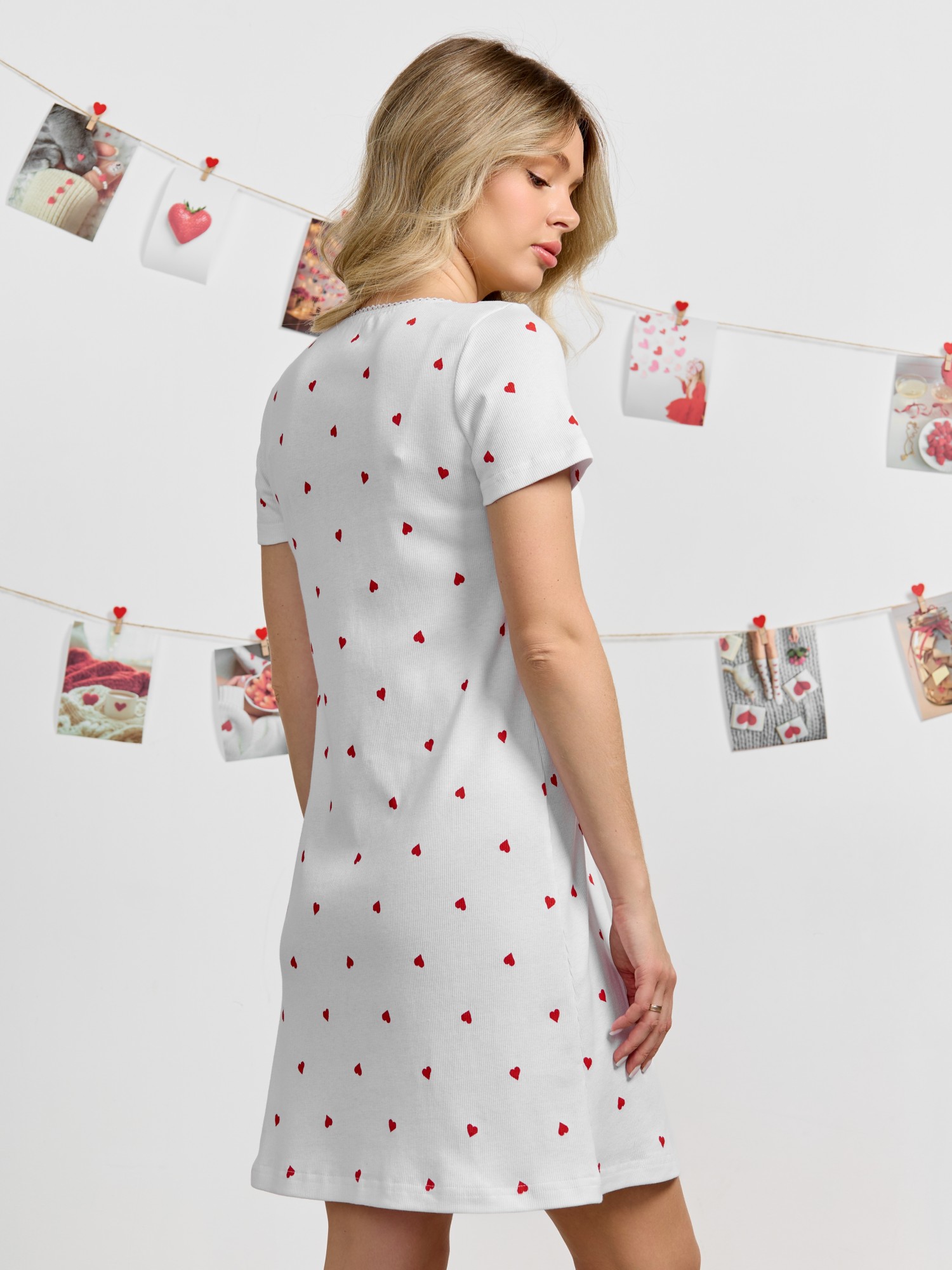Сорочка женская из трикотажного полотна «кашкорсе» с набивным рисунком, полуприталенного силуэта, с короткими втачными рукавами, углубленной формой горловины, по центру которой выполнена небольшая сборка. Низ изделия и нижние срезы рукавов обработаны подгибкой, срез горловины - эластичной тесьмой с фасонным краем, в центре настрочен узкий декоративный бантик.