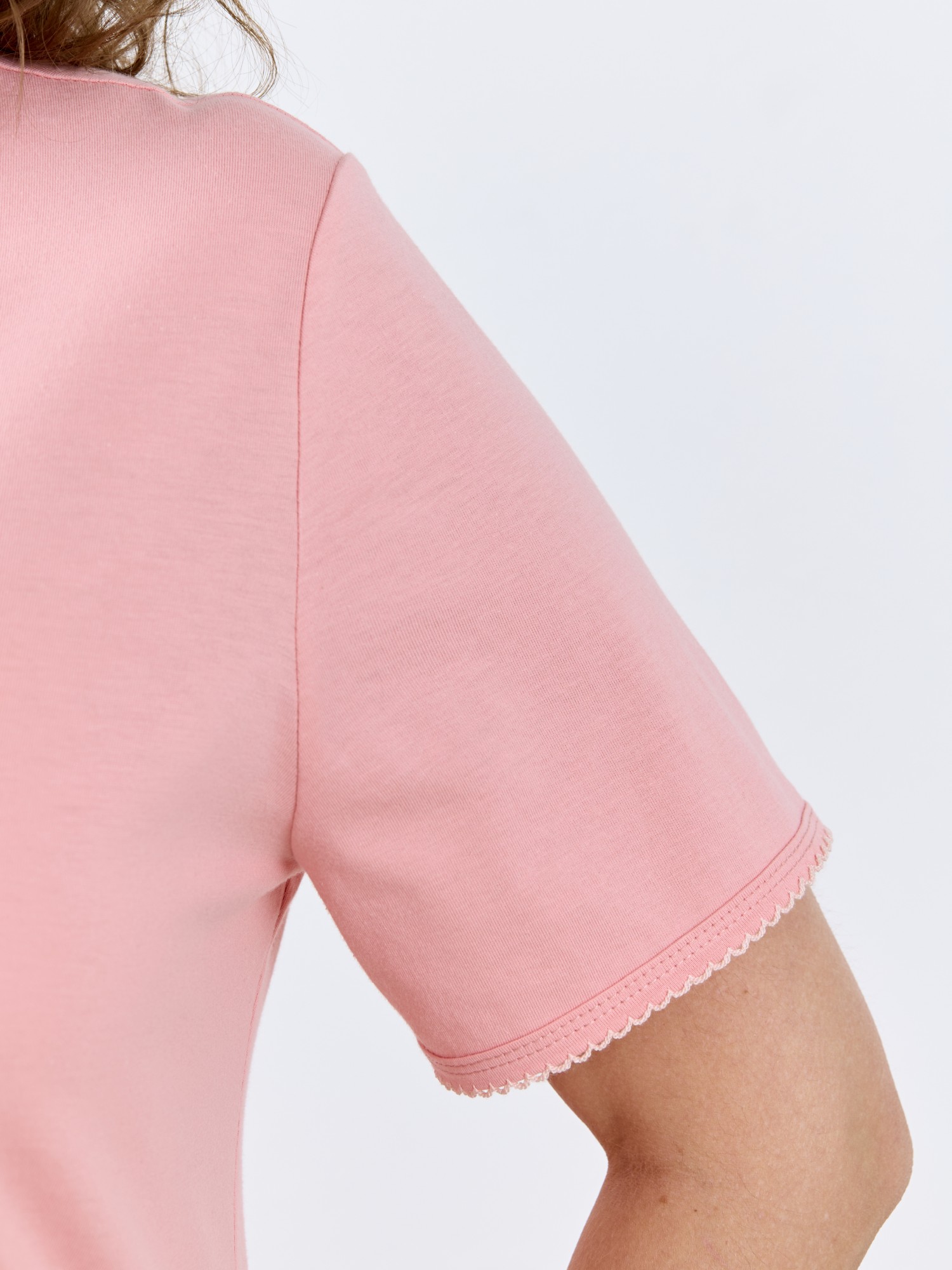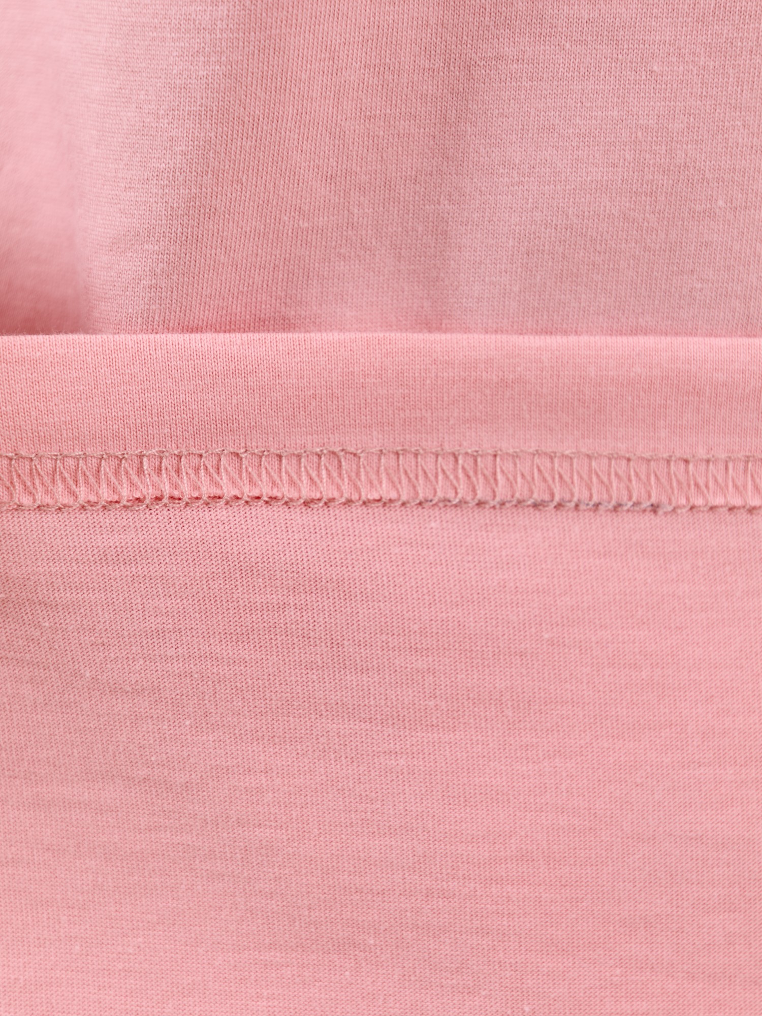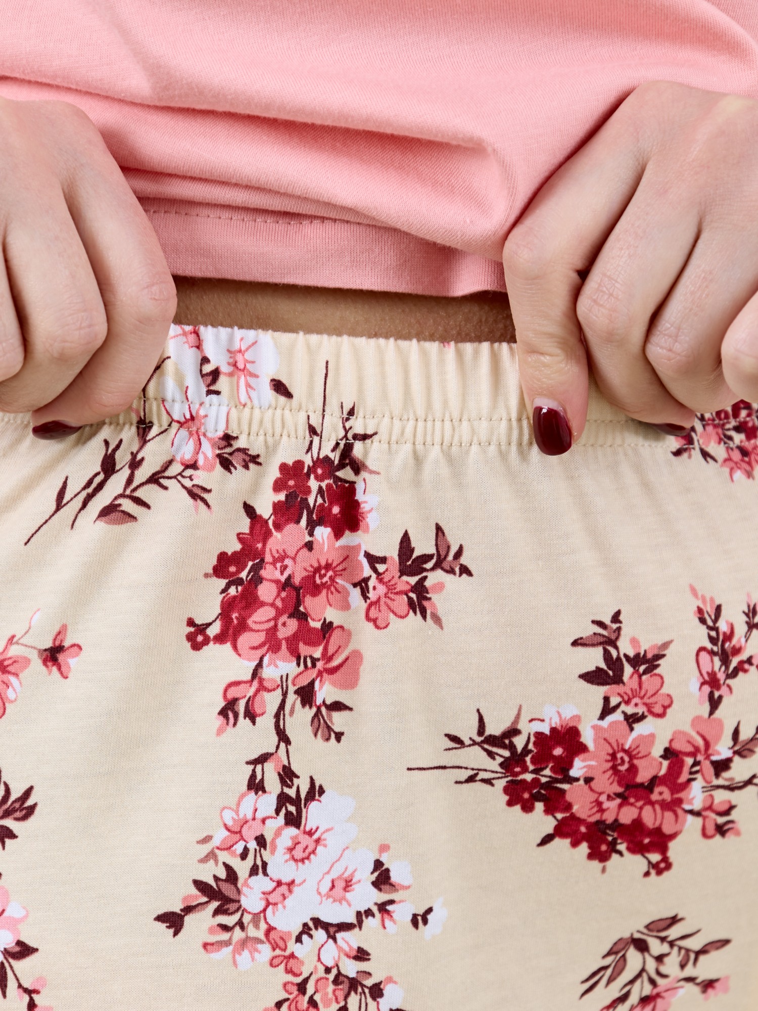 Пижама женская из трикотажного полотна «кулирка» в комбинации двух видов: гладкокрашеного и с набивным рисунком, состоящая из футболки и шорт. Футболка – из гладкокрашеного полотна, с короткими цельнокроеными рукавами, горловиной V-образной формы. Низ рукавов и горловина обработаны декоративной строчкой «кроше», на полочке печать, выполненная в технике «шелкографии».Шорты – из полотна с набивным рисунком, удлиненные, свободного покроя, с эластичной тесьмой по талии.
