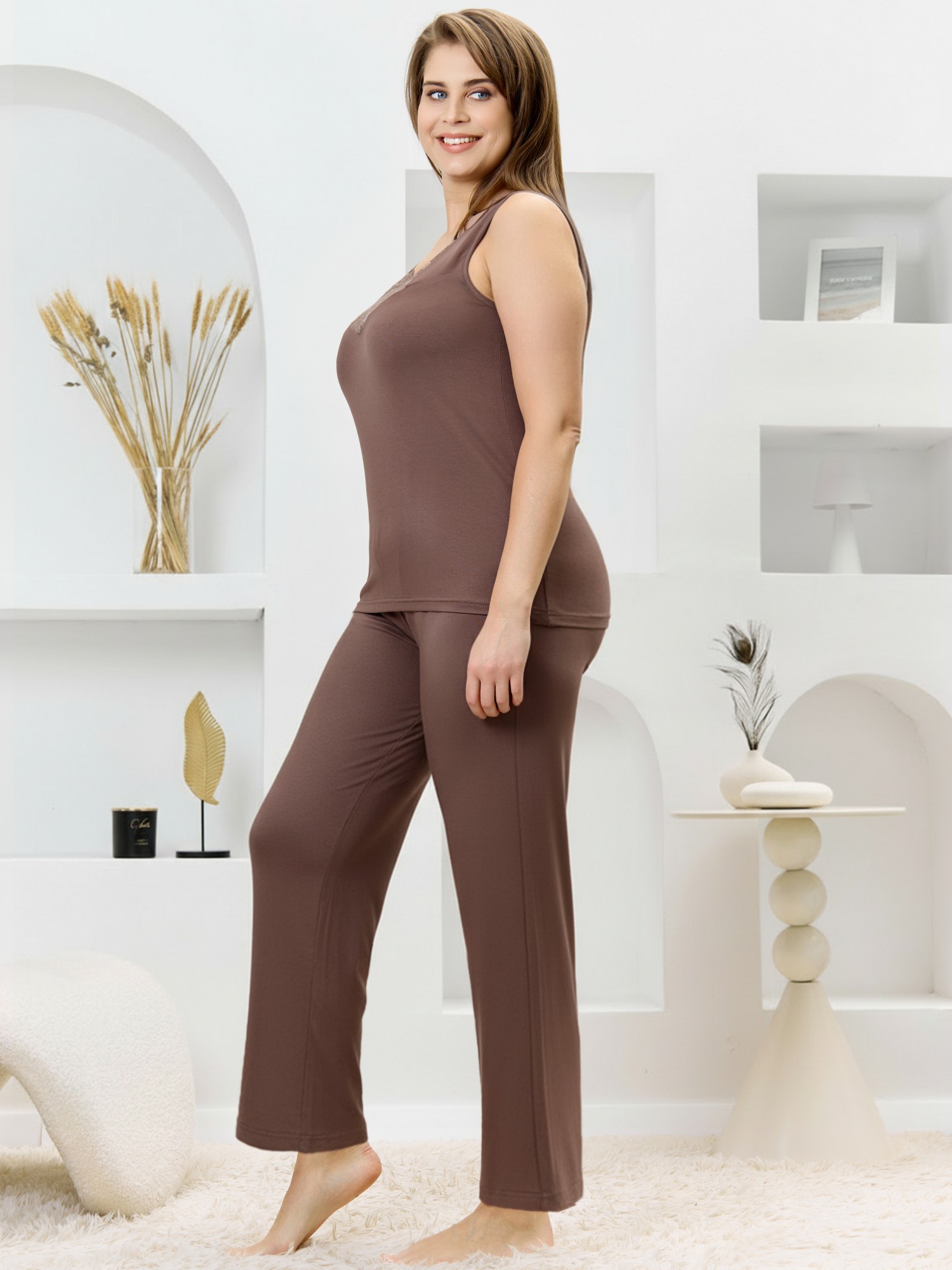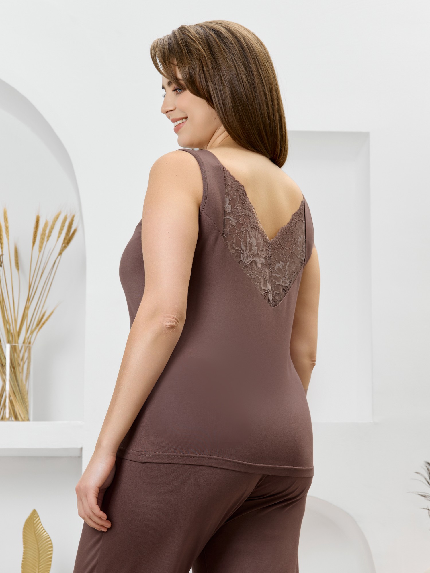 Пижама женская из гладкокрашеного трикотажного вискозного полотна с отделкой кружевом, состоящая из майки и брюк. Майка - свободного кроя, на широких двойных бретелях, с V-образным вырезом горловины. Полочка и спинка состоят из двух деталей с отрезной кружевной кокеткой. Проймы окантованы основным материалом.Брюки – свободные, средней длины, слегка зауженные книзу, с эластичной тесьмой по талии.