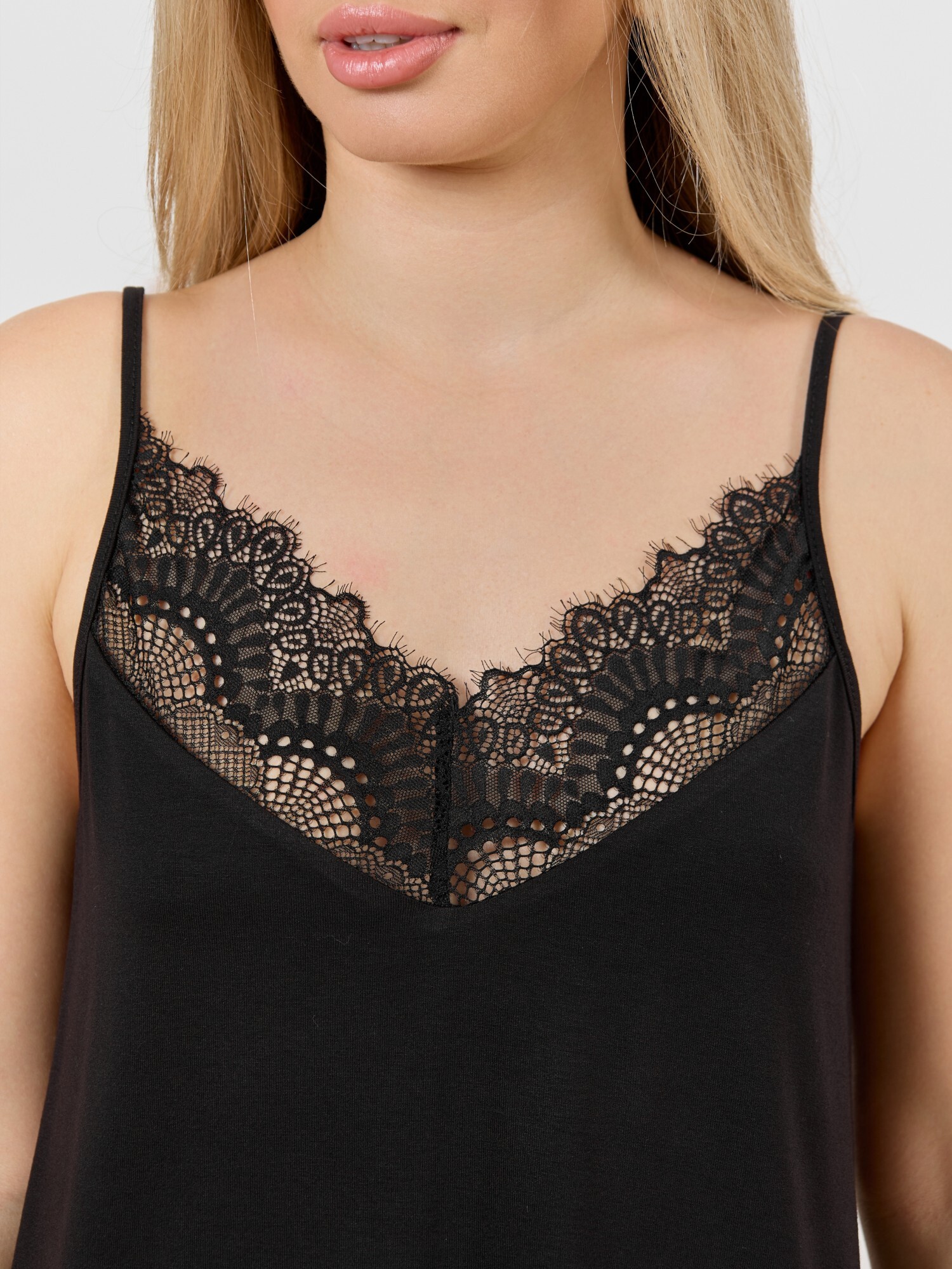 Пижама молодежная гладкокрашеного трикотажного вискозного полотна с отделкой кружевом, состоящая из топа и шорт. Топ - на узких бретелях, слегка расширенный книзу. V-образная горловина полочки и спинки отделана кружевными вставками треугольной формы. Проймы окантованы основным материалом. Шорты – свободные, средней длины, с эластичной тесьмой по талии.