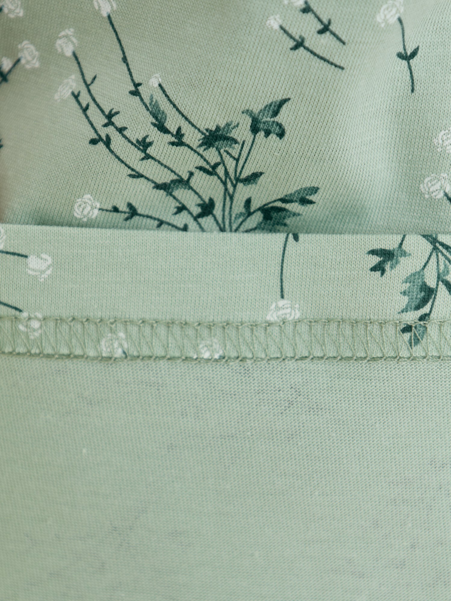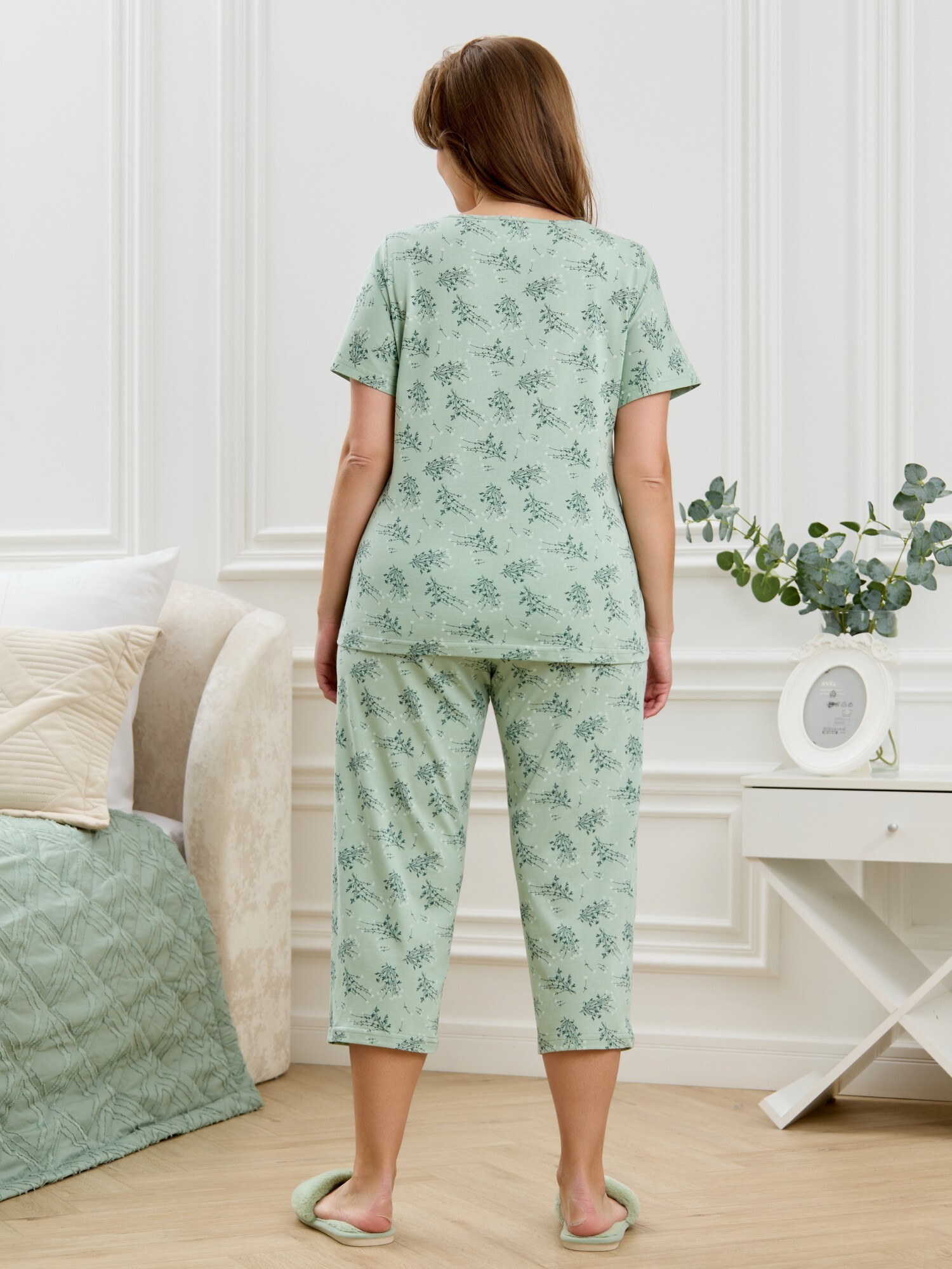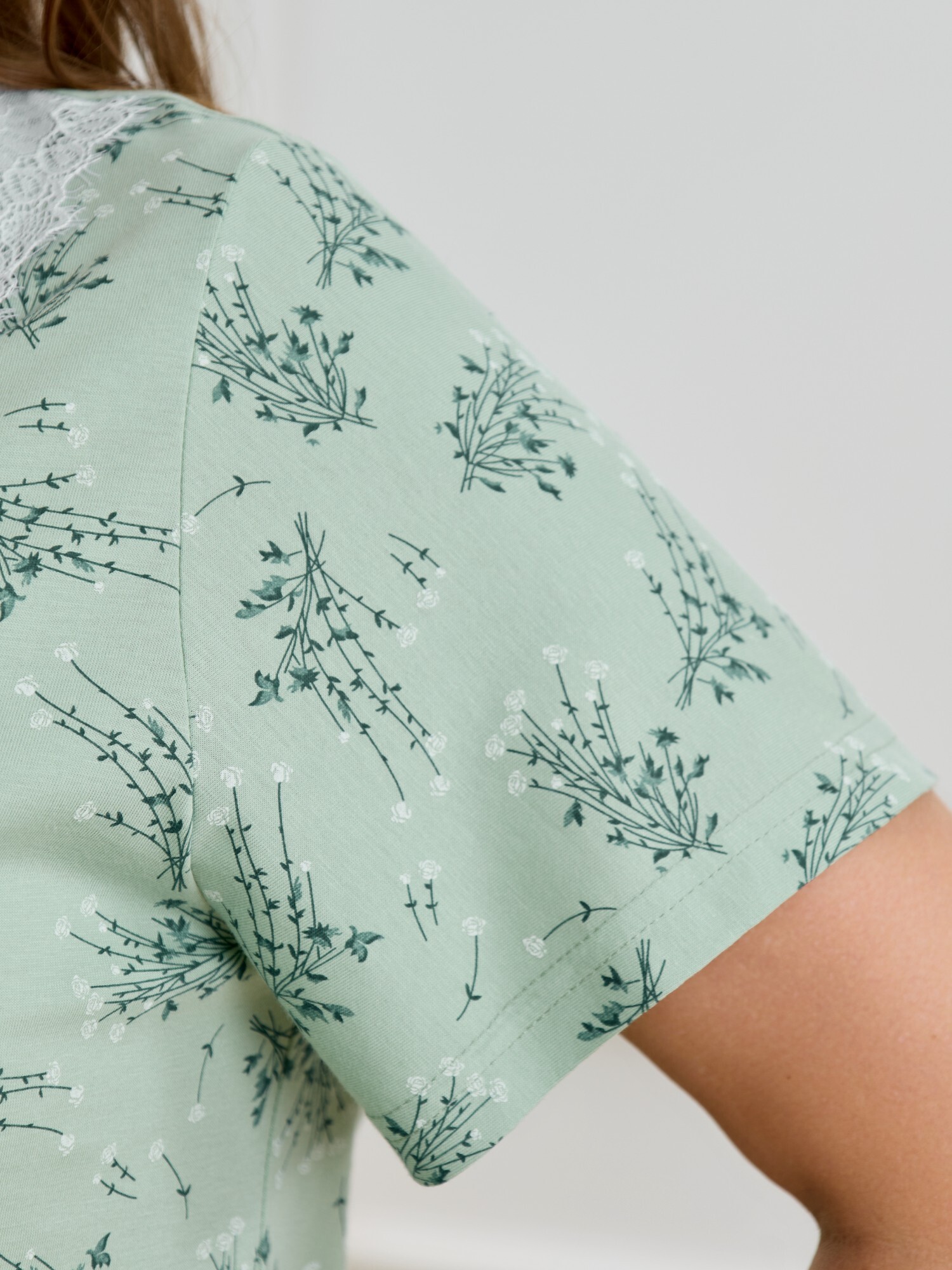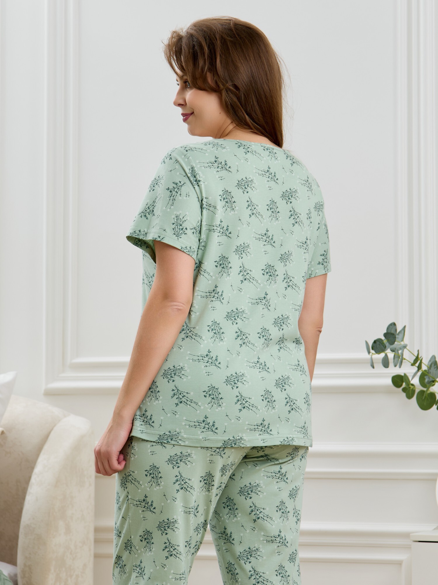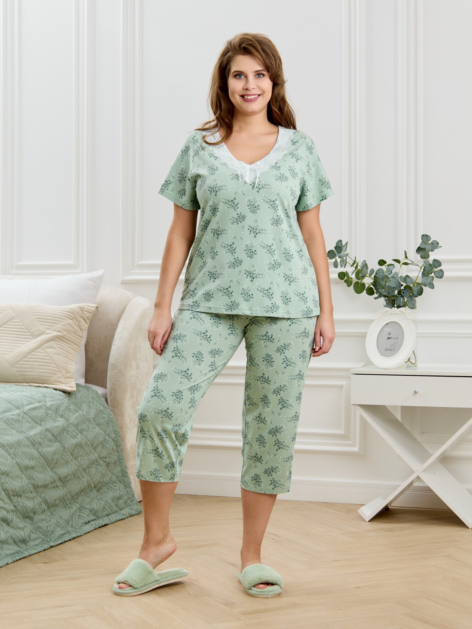 Пижама женская из трикотажного полотна «кулирка» с набивным рисунком, состоящая из футболки и бридж. Футболка прямого кроя, с короткими втачными рукавами. Горловина V- образной формы, обработана кружевом с фестонным краем, по центру настрочен декоративный бантик из узкой атласной тесьмы.Бриджи свободные, длиной до середины икры, с эластичной тесьмой по талии.