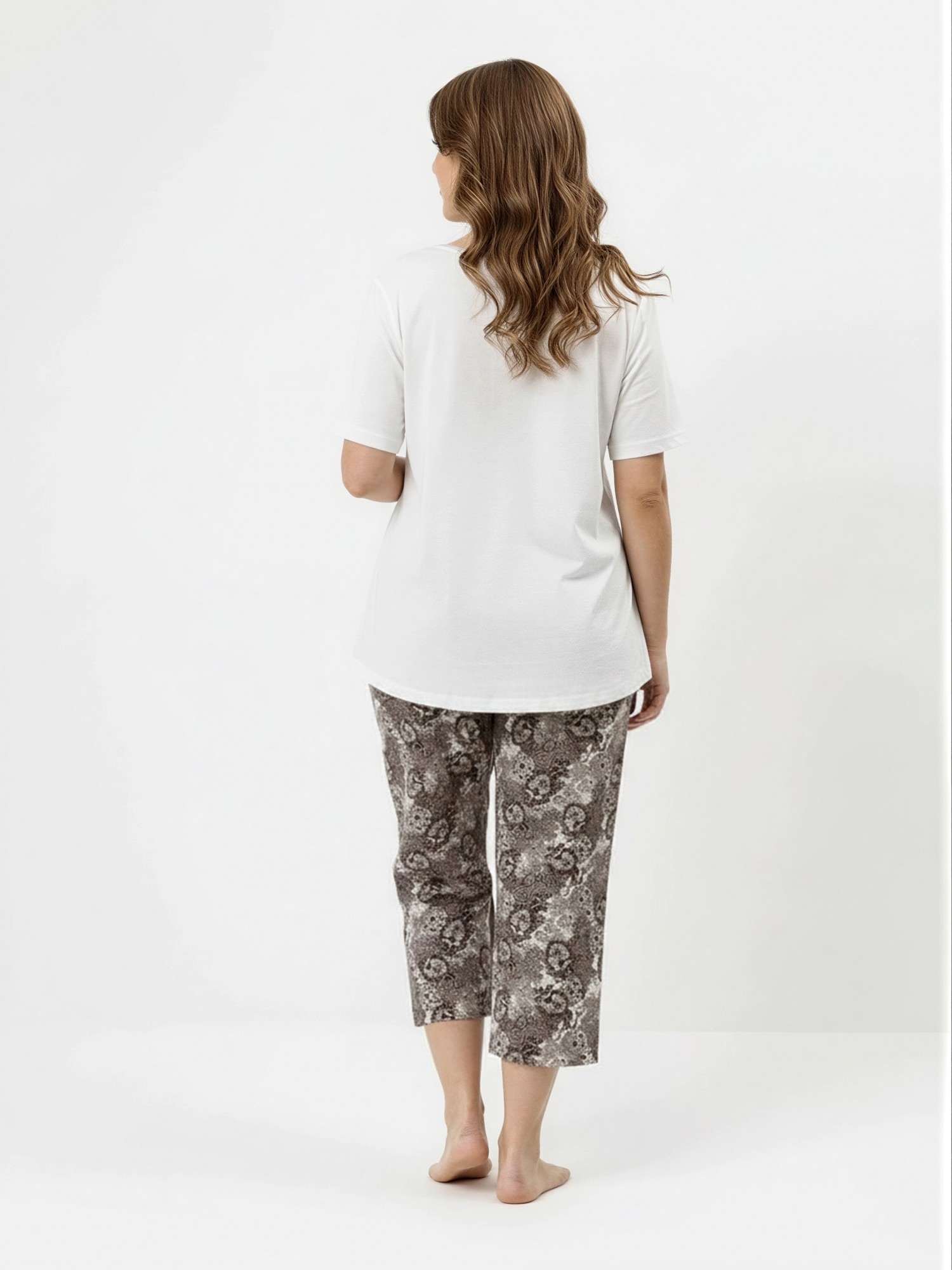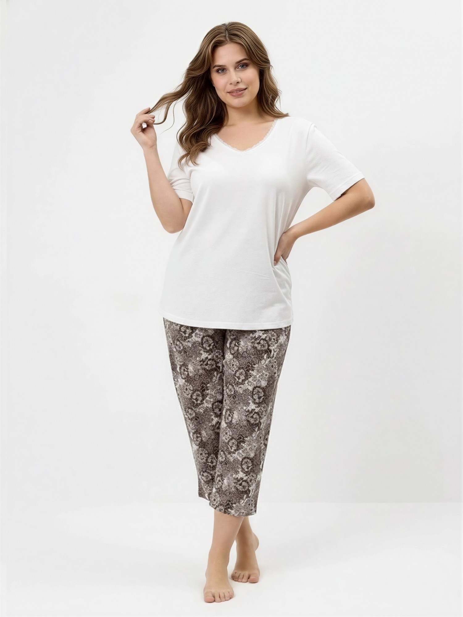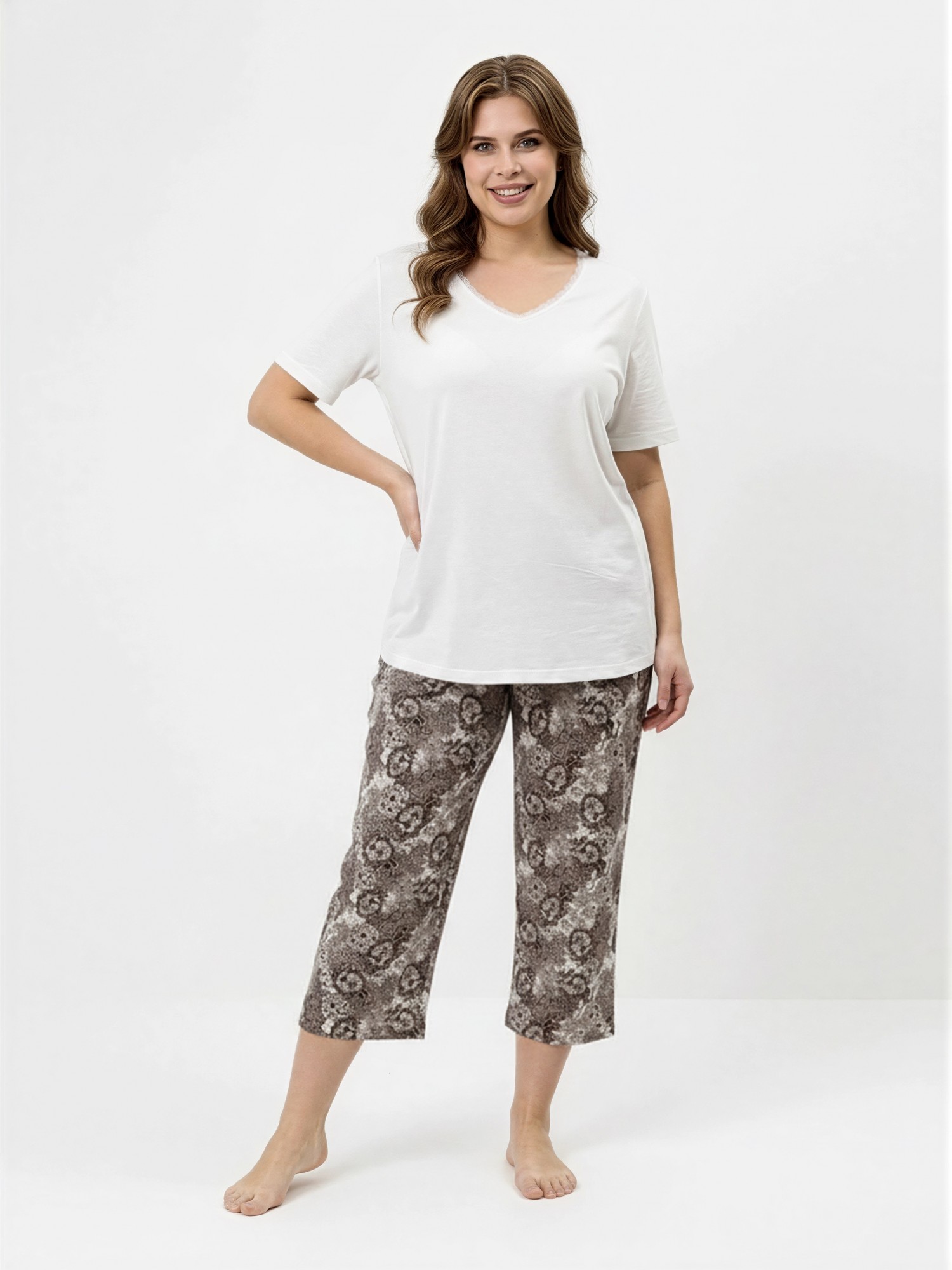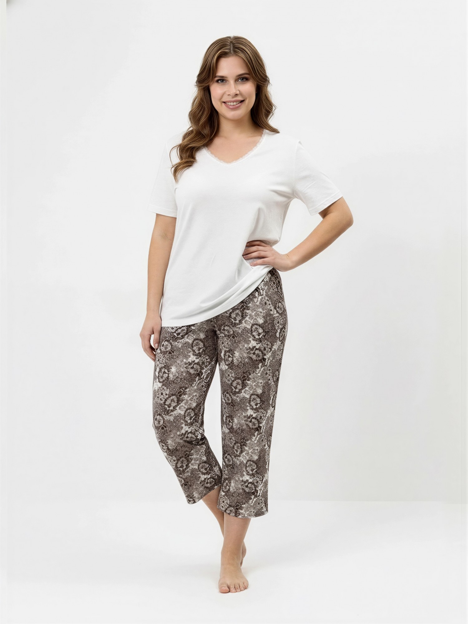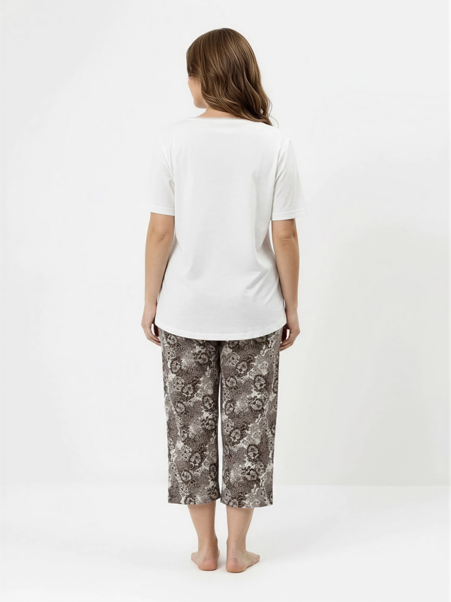 Пижама женская из трикотажного полотна «кулирка» в комбинации двух видов: гладкокрашеного и с набивным рисунком, состоящая из футболки и бридж. Футболка – из гладкокрашеного полотна, с короткими втачными рукавами и горловиной V-образной формы. Срезы горловины обработаны узким кружевом.Бриджи – из полотна с набивным рисунком, свободные классического покроя, с эластичной тесьмой по талии.