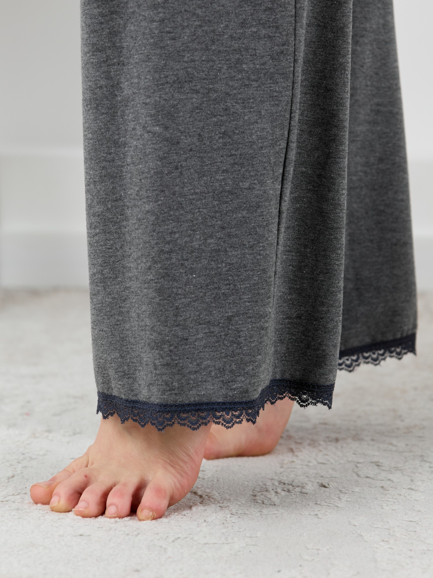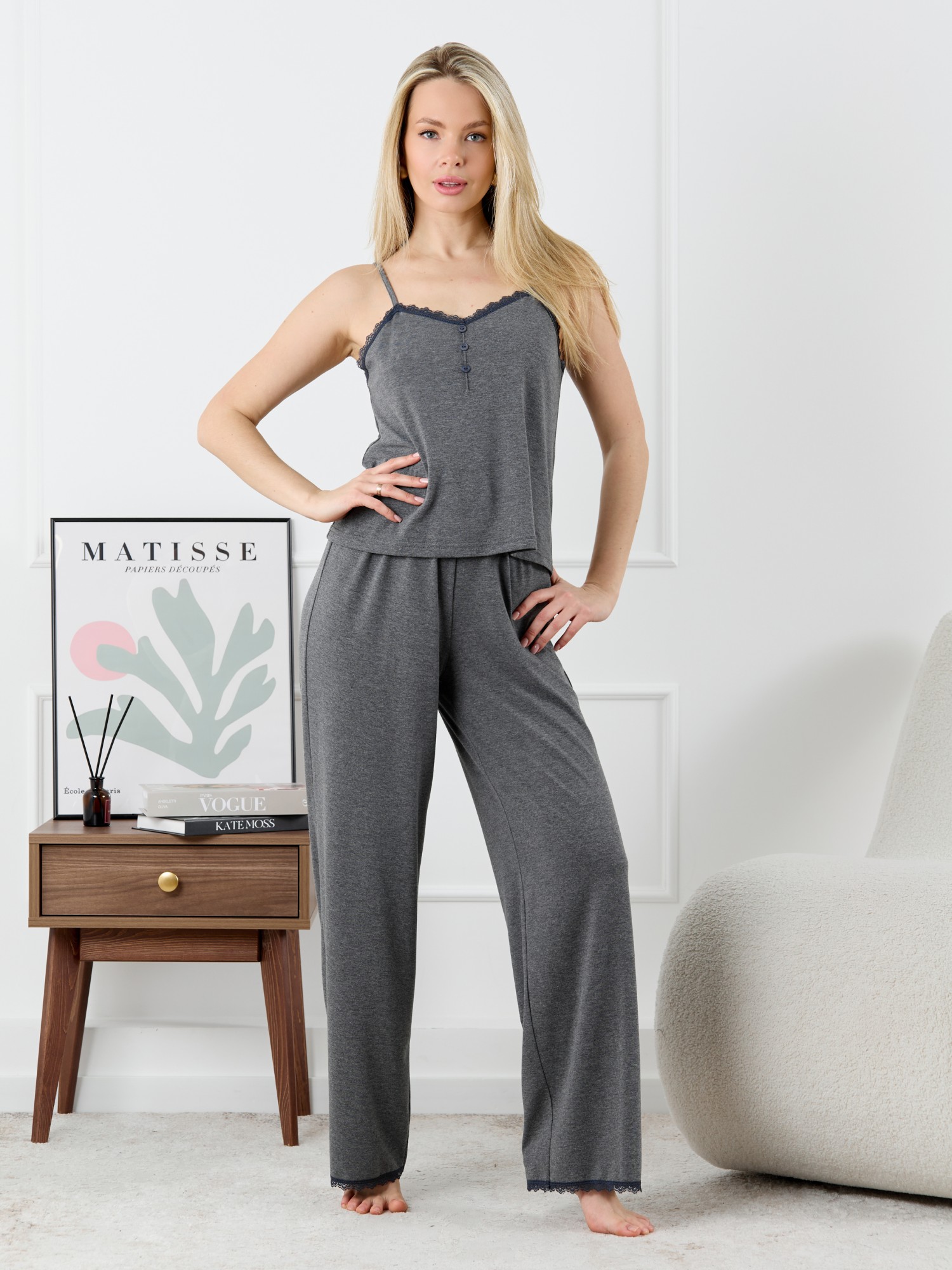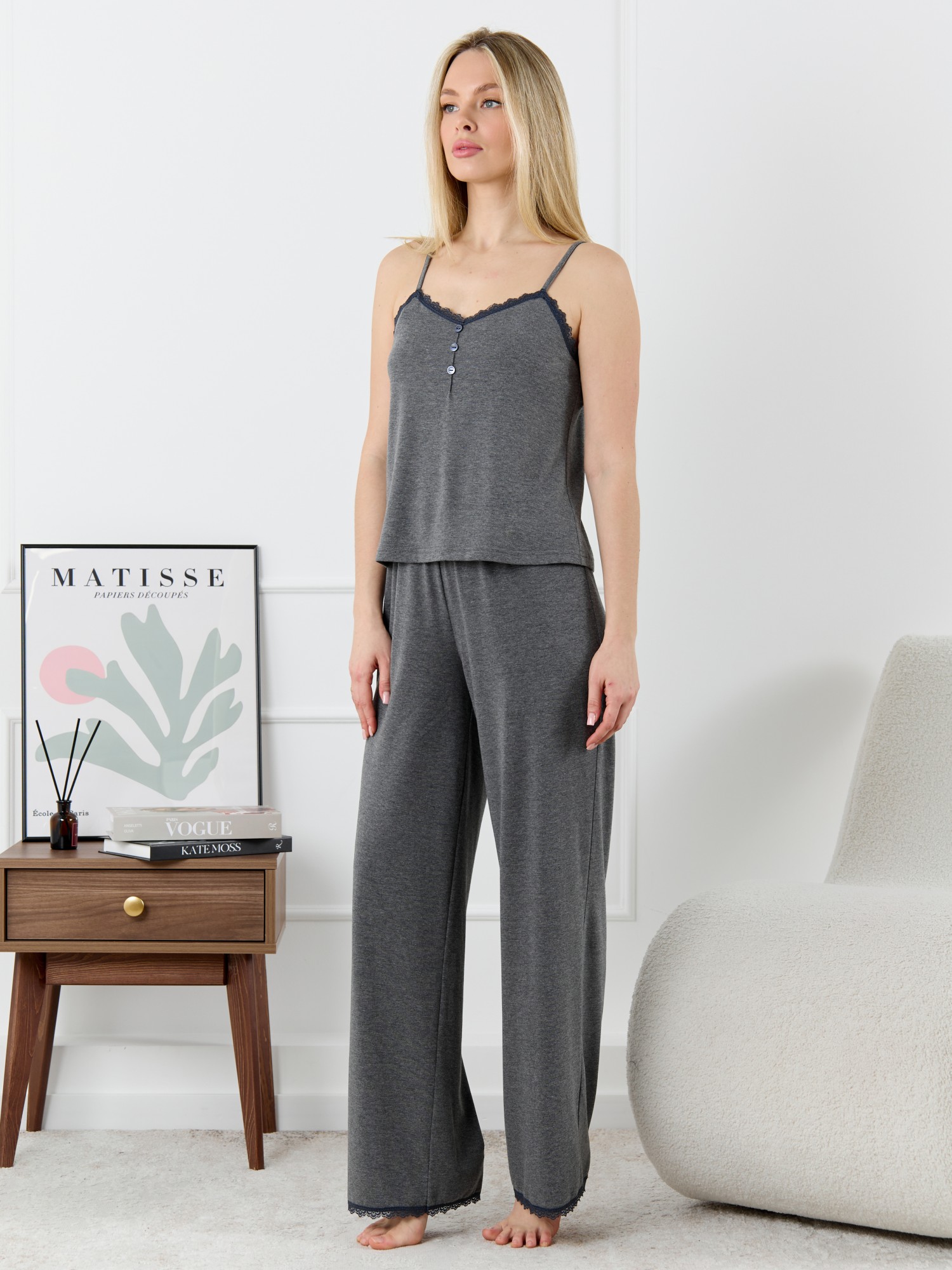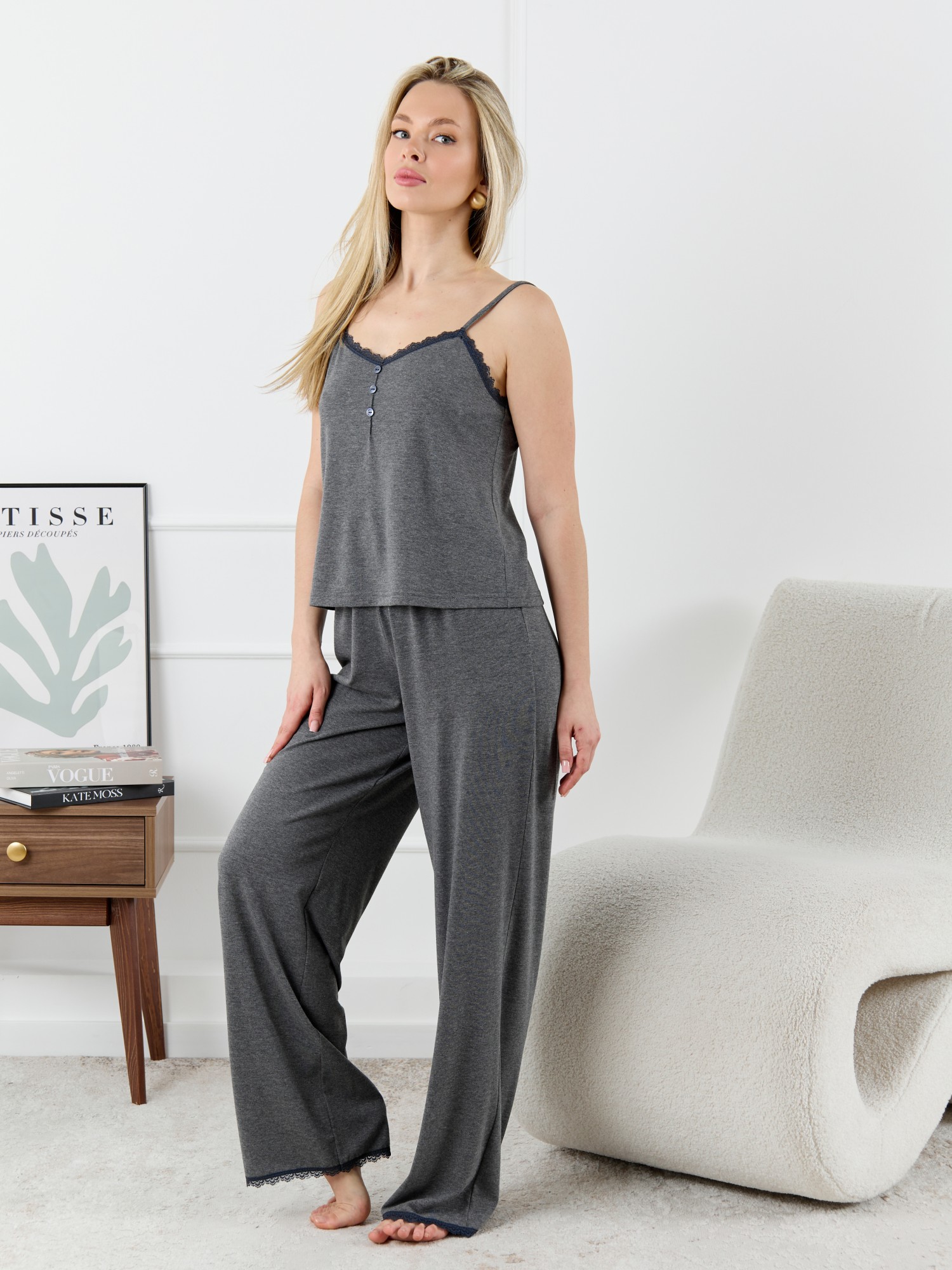 Пижама молодежная из трикотажного полотна «кулирка» с набивным рисунком, состоящая из майки - топа и шорт. Майка-топ – слегка расширенная книзу, на узких бретелях, вытачанных из окантовки. Для регулирования длины бретелей предусмотрены пластмассовые кольца-держатели и фиксаторы. По центру переда застрочен «защип» и пришиты три декоративные пуговицы имитирующие застежку. Вырез горловины переда, спинки отделаны кружевом.Брюки – полуприлегающие, с эластичной тесьмой по талии и нижними срезами отделанными узким кружевом.