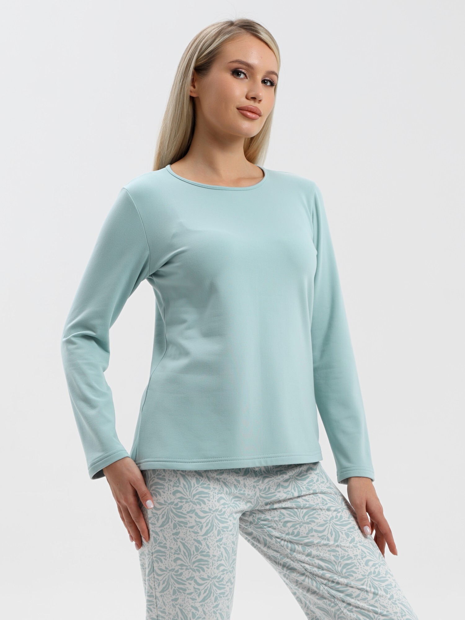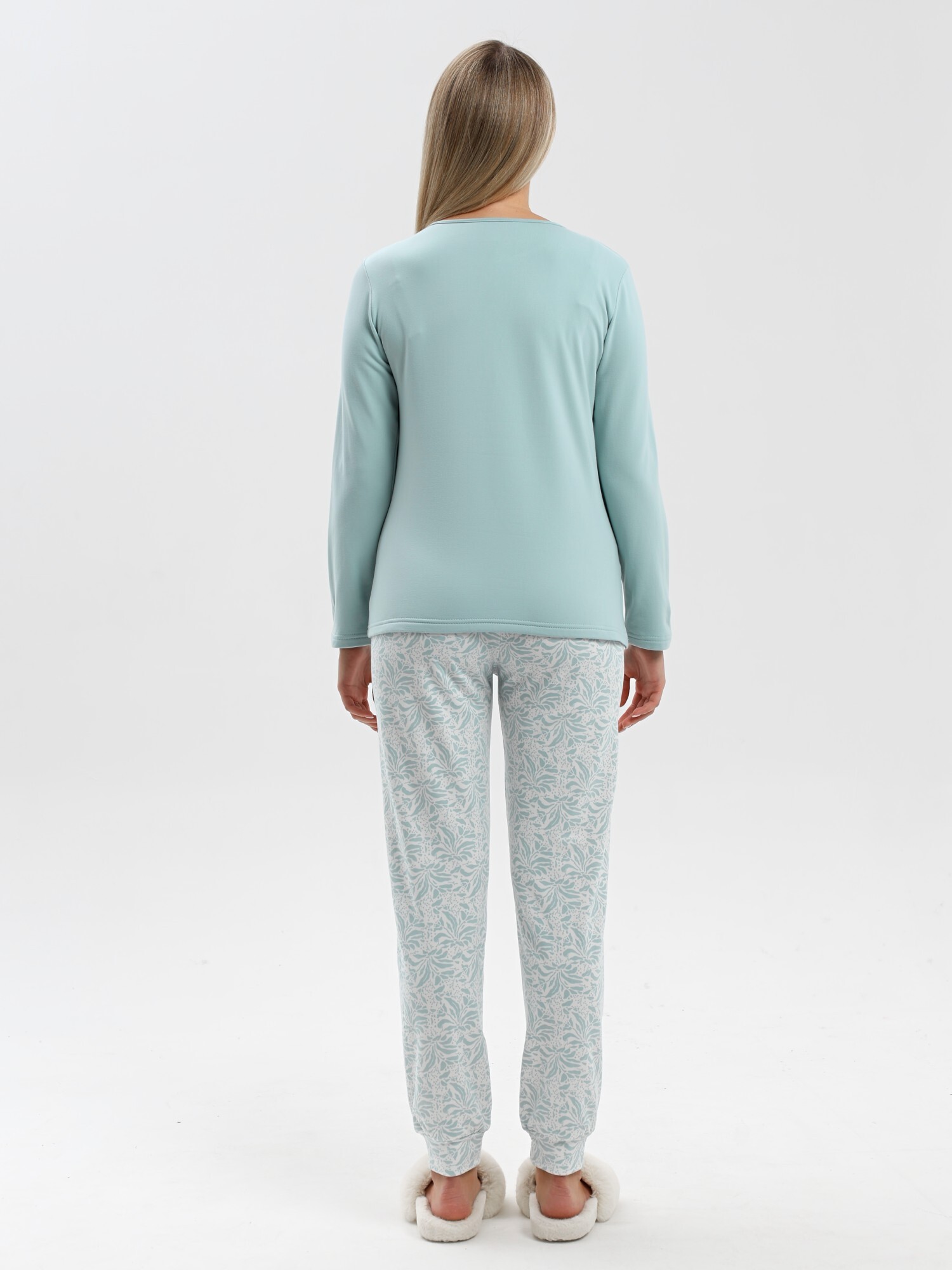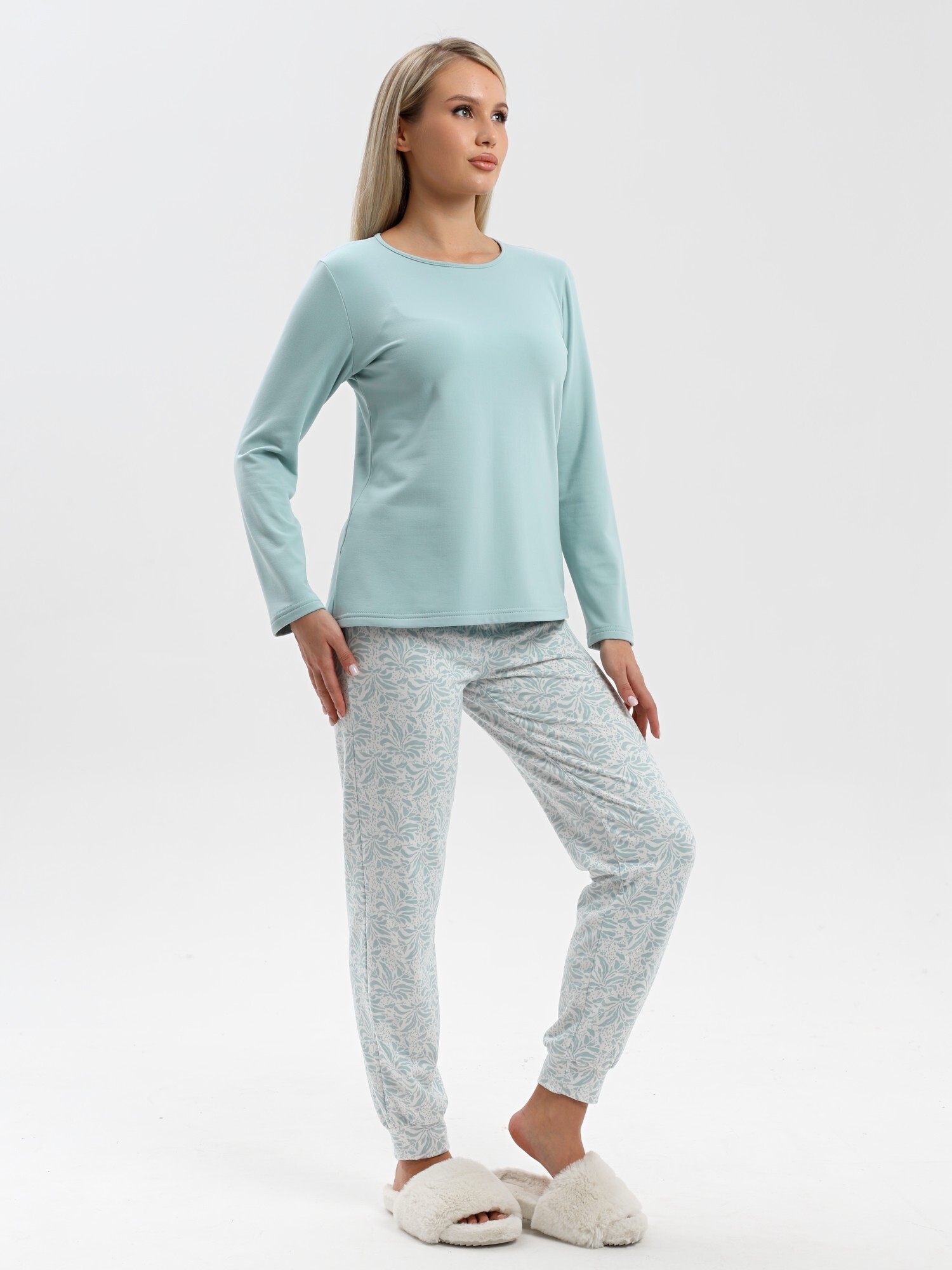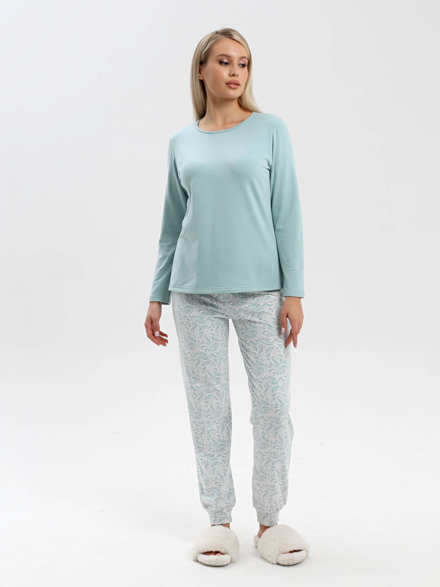 Пижама молодежная из трикотажного полотна «микрофлис» в комбинации двух видов: с набивным рисунком и гладкокрашеного в единой цветовой гамме, состоящая из футболки и брюк. Футболка - из гладкокрашенного полотна, классического покроя, с длинными втачными рукавами, горловиной овальной формы, окантованной основным материалом.Брюки – из полотна с набивным рисунком, свободного покроя, с эластичной тесьмой по талии и притачными манжетами по нижним срезам.