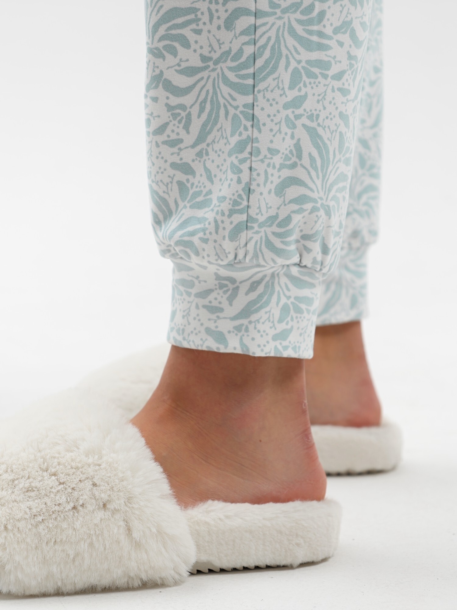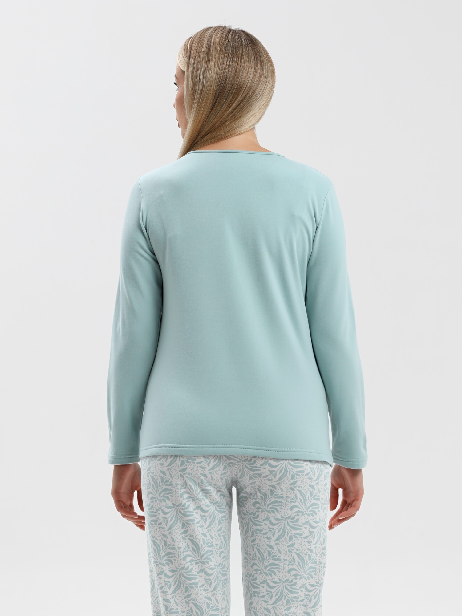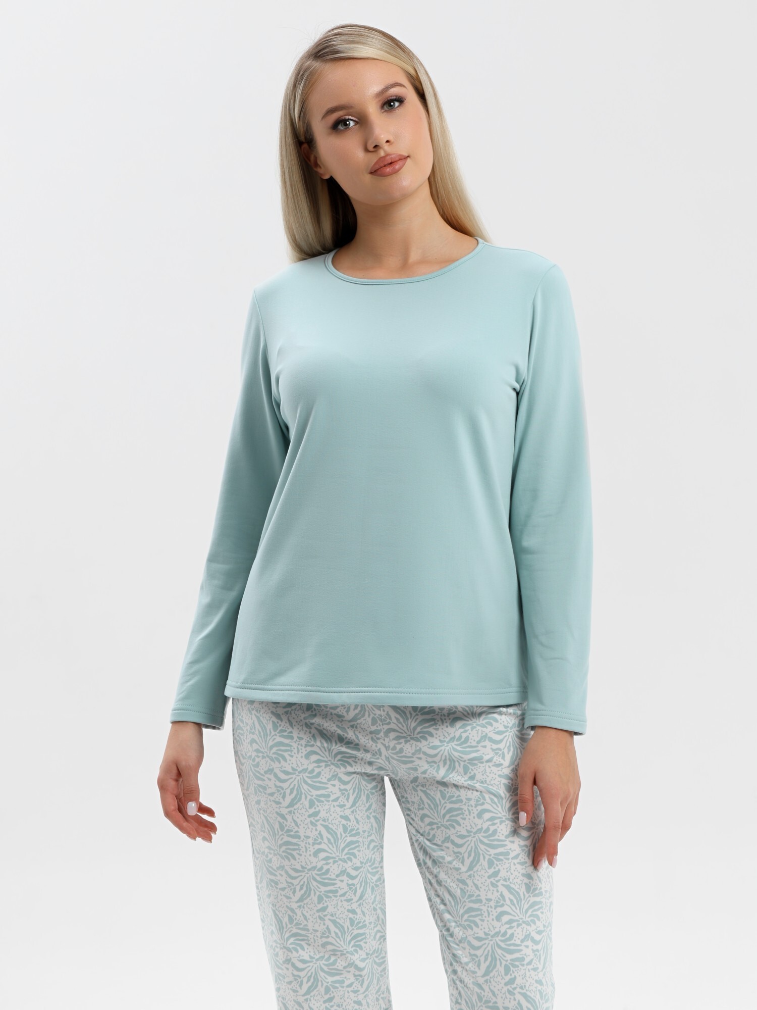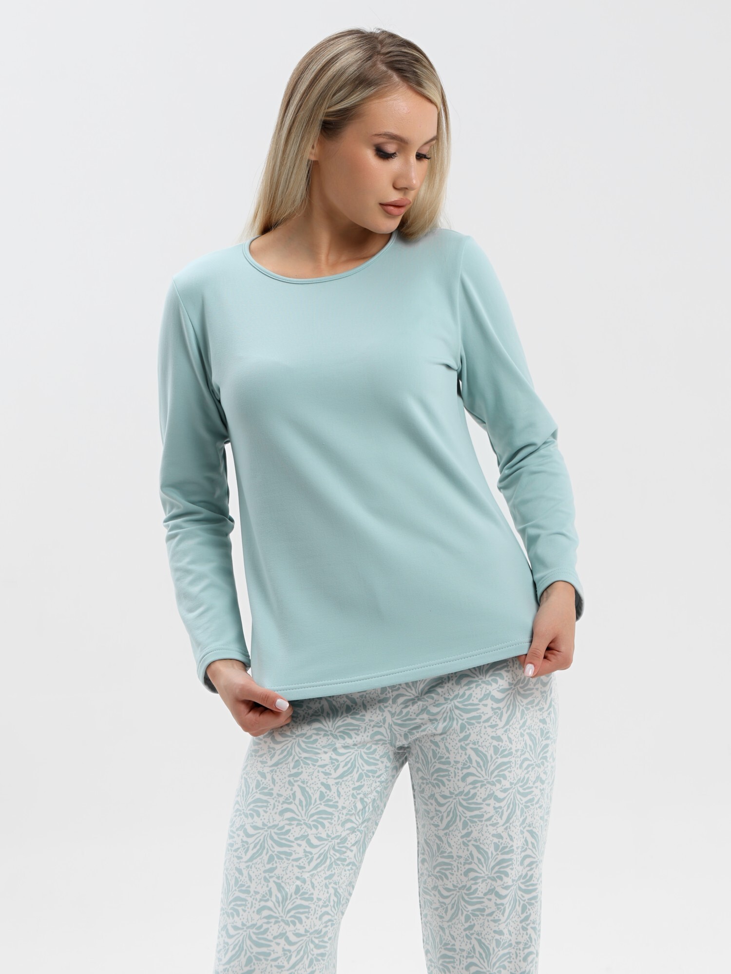 Пижама молодежная из трикотажного полотна «микрофлис» в комбинации двух видов: с набивным рисунком и гладкокрашеного в единой цветовой гамме, состоящая из футболки и брюк. Футболка - из гладкокрашенного полотна, классического покроя, с длинными втачными рукавами, горловиной овальной формы, окантованной основным материалом.Брюки – из полотна с набивным рисунком, свободного покроя, с эластичной тесьмой по талии и притачными манжетами по нижним срезам.