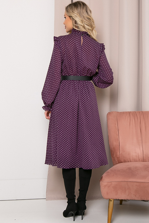 Платье из трикотажного полотна в горох,отрезное по линии талии. Ремень в комплект не входит.