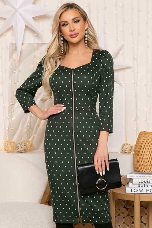 Платье из жаккардового трикотажного полотна полуприлегающего силуэта с центральной застежкой на молнию.