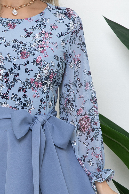 Комбинированное платье.Лиф из трикотажного полотна с втачными рукавами из шифона компаньона (трикотаж и шифон производство Ю.Корея)и застежкой молния в среднем шве спинки,юбка летящая расклешенная из костюмной ткани.В комплекте длинный пояс.