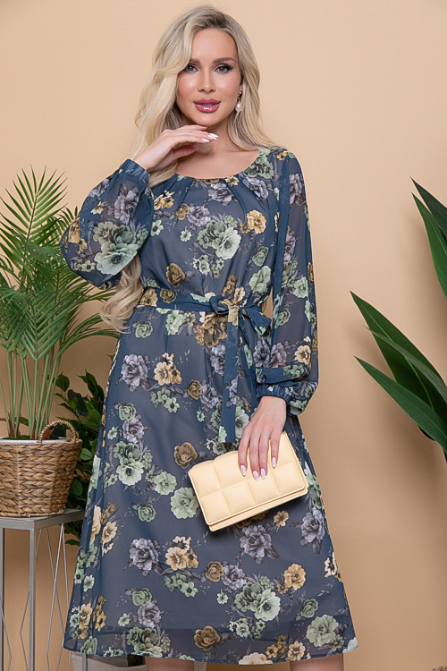 Платье свободного А-образного силуэта из шифона на трикотажном подкладе.Пояс в комплекте.