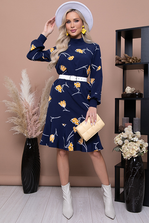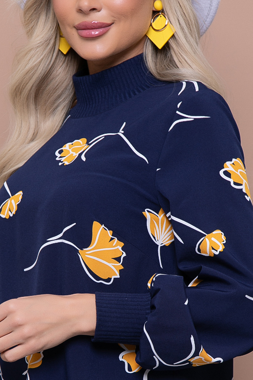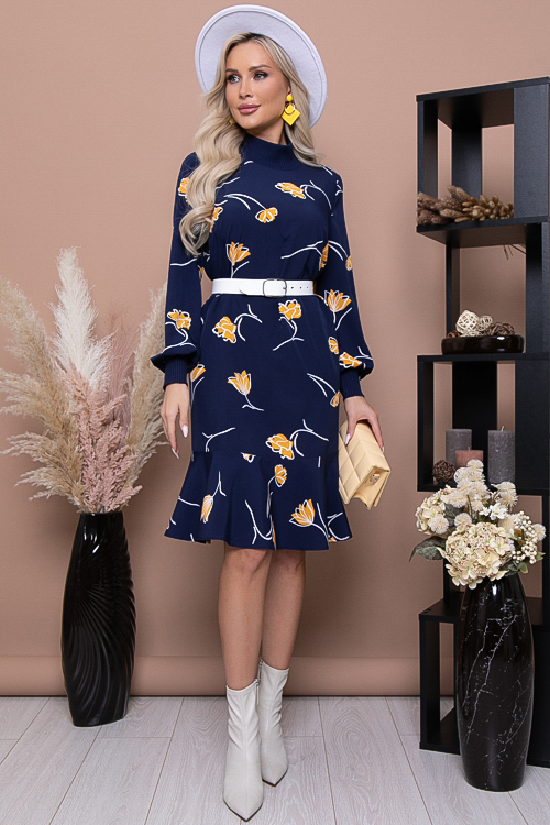 Платье свободного трапецевидного силуэта с притачным воланом по низу.Горловина и манжеты из вискозного трикотажного полотна рибана.Ремень в комплект не входит. 30% вискоза 65% п/э,5% эластан