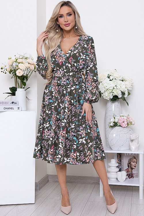 Платье из текстильного полотна,с красивым запахом по лифу,отрезное по линии талии,присобрано на эластичную резину, с летящей расклешенной юбкой с эффектным запахом по переду.Пояс из основной ткани в комплекте.