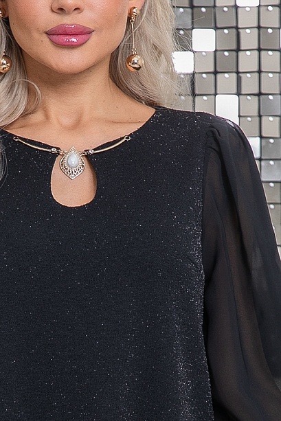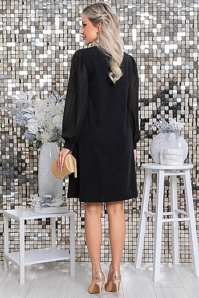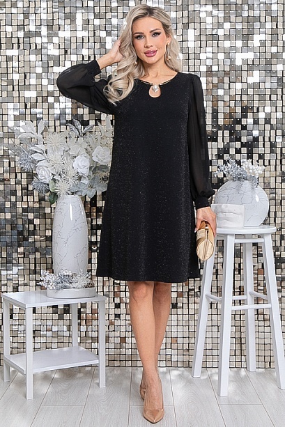Платье А-образного силуэта из трикотажного полотна с легким люрексом.Горловина оформлена изящной каплей и дополнена украшением с жемчужиной.