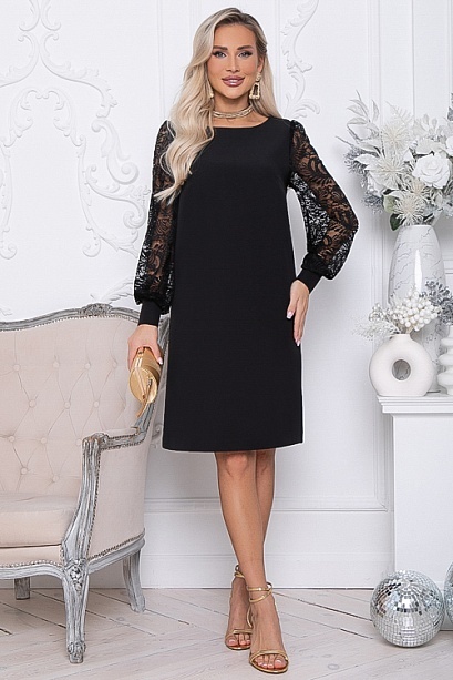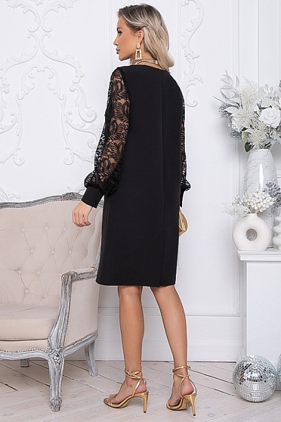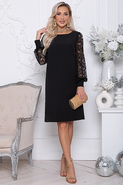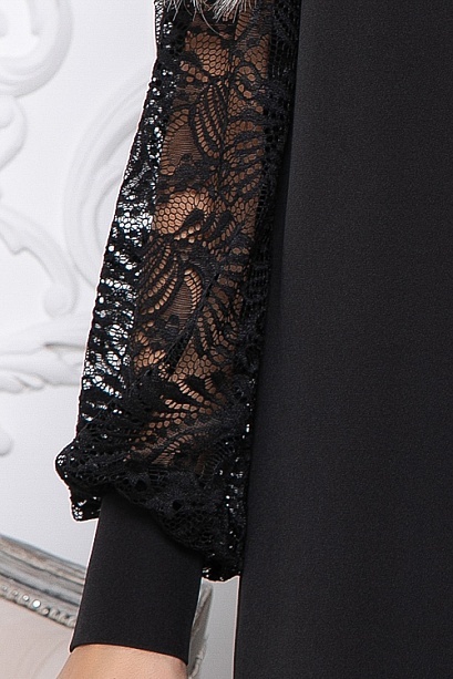 Платье А-образного силуэта из костюмной ткани.Рукава втачные из кружевного полотна посажены на манжеты из основной ткани с застежкой на две пуговицы.