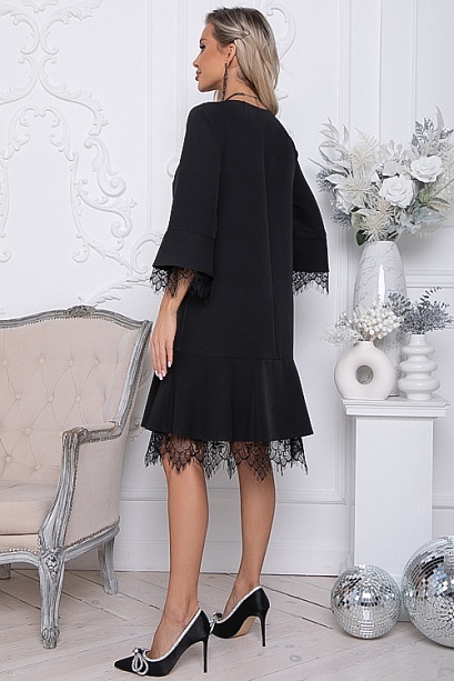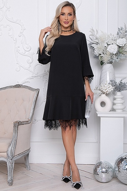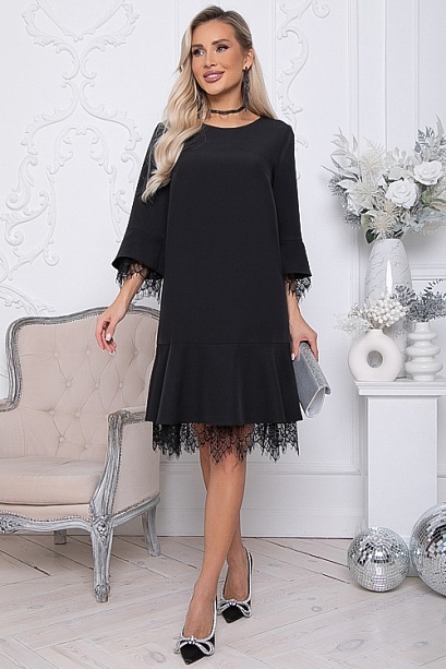 Платье из костюмной ткани А-образного силуэта с притачным воланом по низу.Изделие по рукавам и низу украшено французским кружевным полотном.