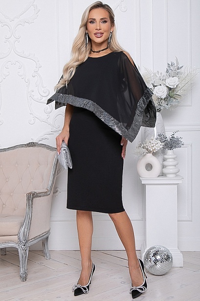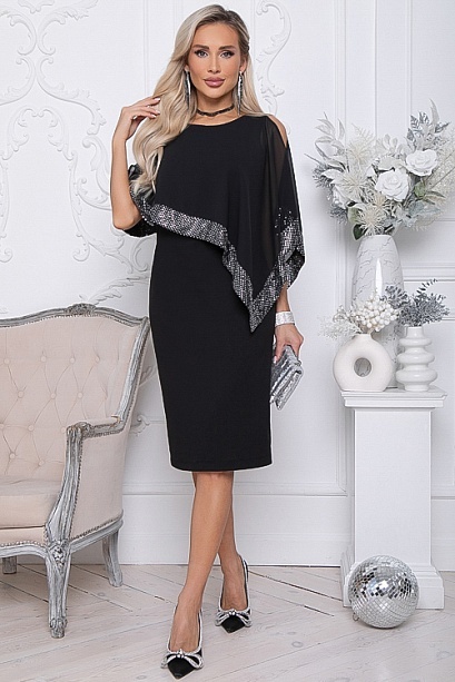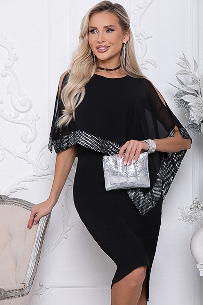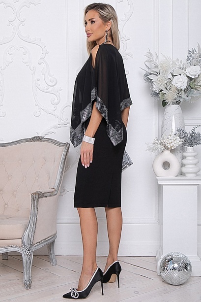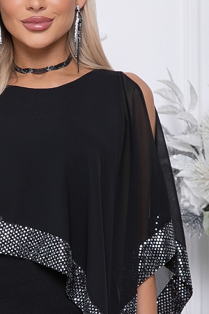 Нарядное двухслойное платье.Основное платье полуприлегающего силуэта из трикотажного полотна.Второй слой из шифона с ассиметричным кроем и эффектной отделкой пайетками.
