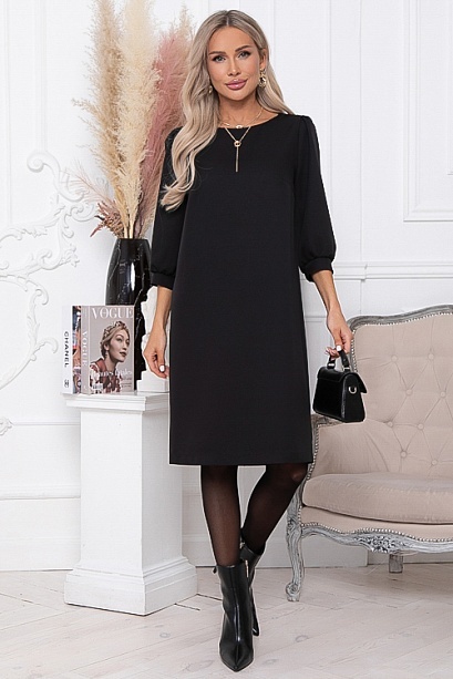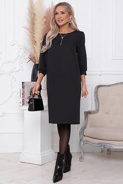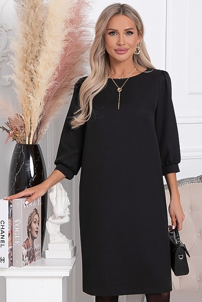 * Платье из костюмной ткани прямого, свободного силуэта. В среднем шве спинки шлица. Рукав втачной, по низу манжет частично собранный на резину.