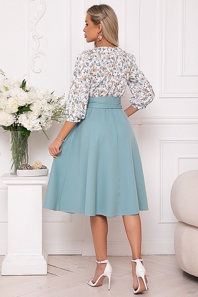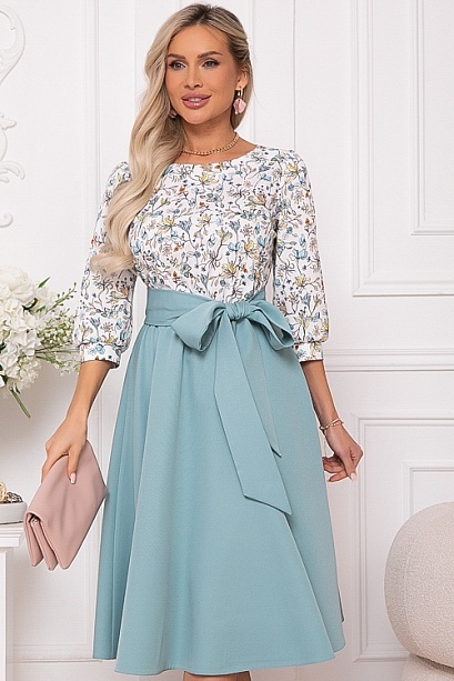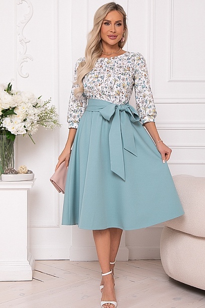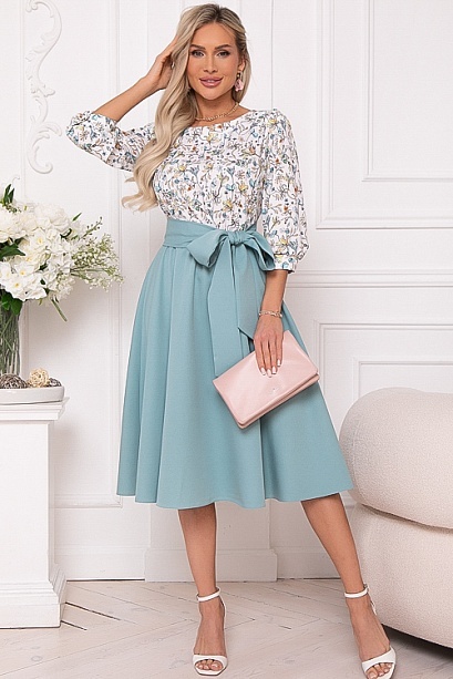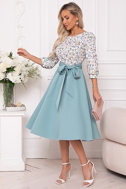 Комбинированное платье.Лиф из текстильного полотна,юбка летящая расклешенная из костюмной ткани присобрана на эластичную резину.В комплекте длинный пояс.