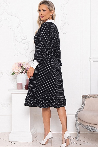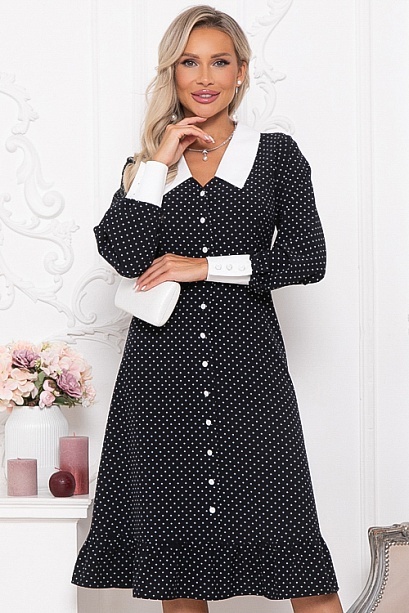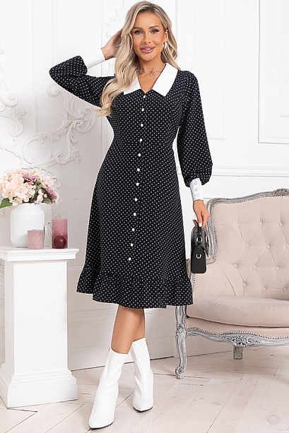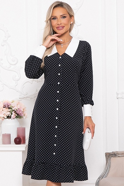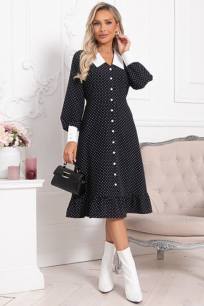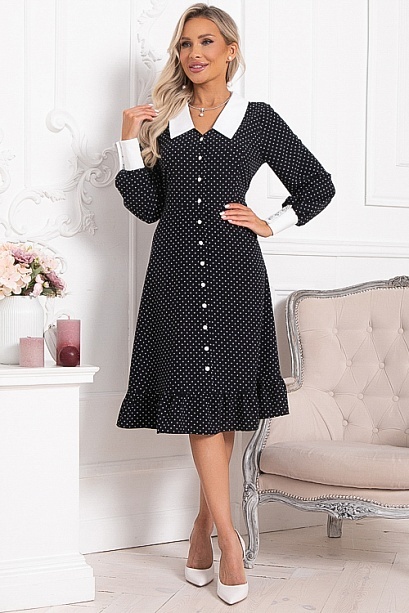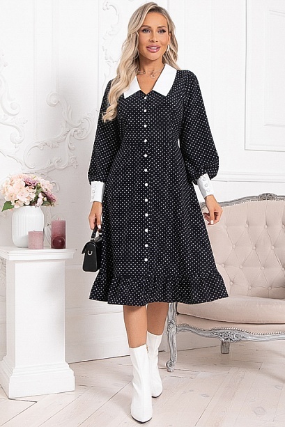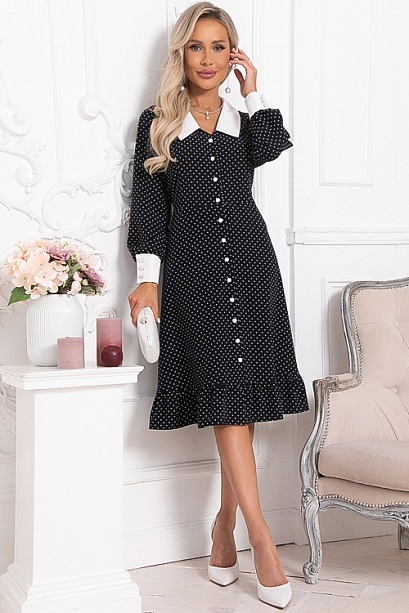 * Нарядное платье из текстильного полотна в горошек, в боковых швах талии пояски-завязки,можно завязать сзади и скорректировать талию.Отрезная юбка А-образного силуэта с воланом по низу.Изюминка платья-белый воротник ,манжеты и шикарные жемчужные пуговицы.По полочке центральная застежка до волана.