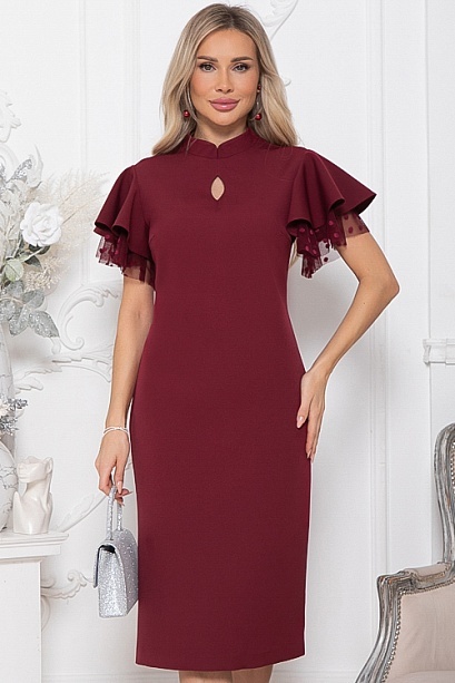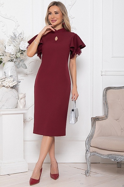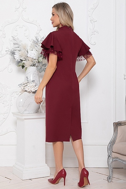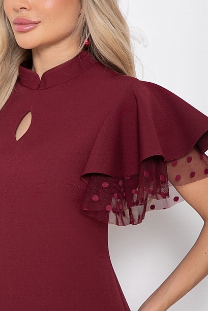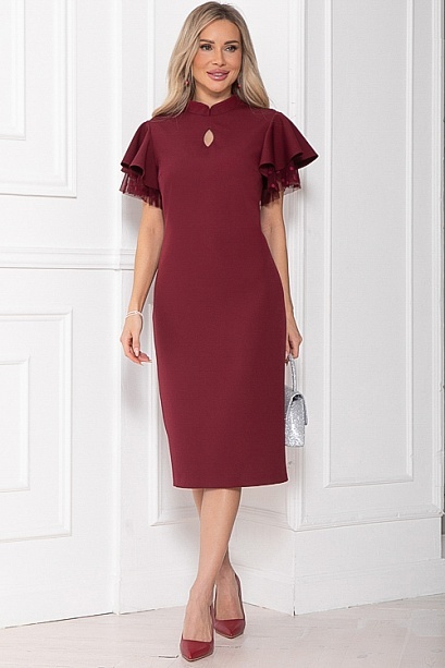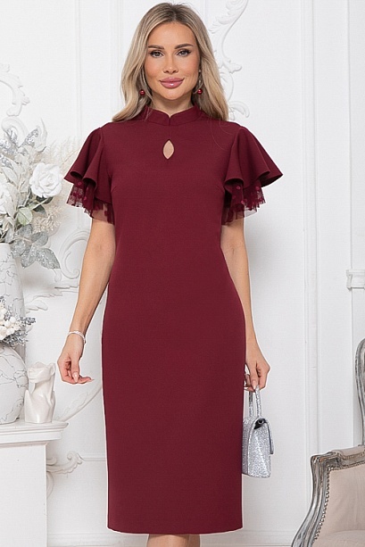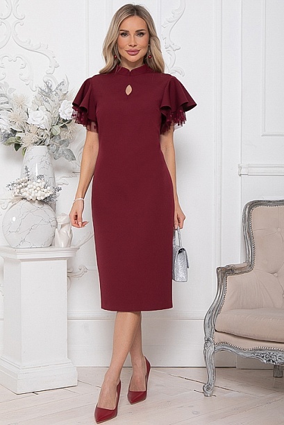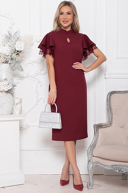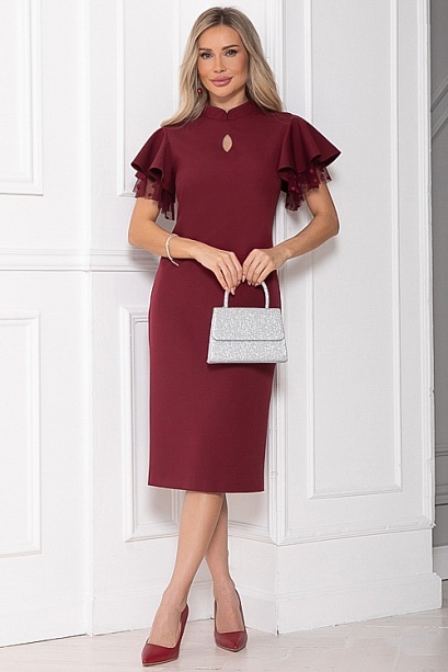 * Нарядное платье из костюмной ткани полуприлегающего силуэта.Горловина с фигурной стойкой.По полочке эффектная капля.Романтический образ дополняют двойные рукава воланы,верхний из основной ткани,нижний из сетки.В среднем шве спинки застежка молния и шлица по низу.