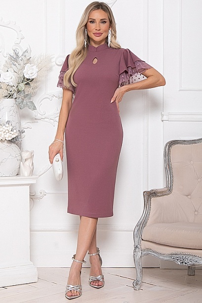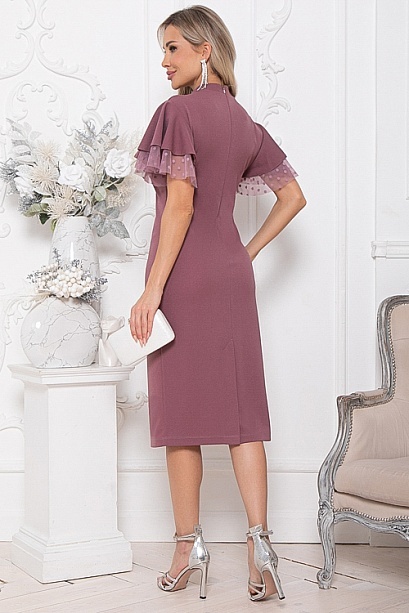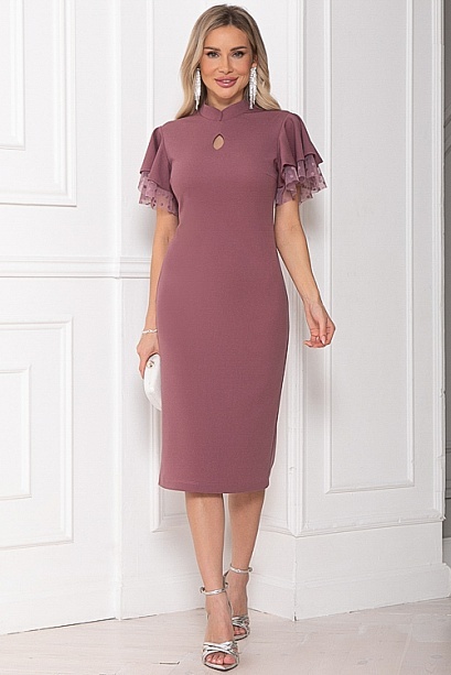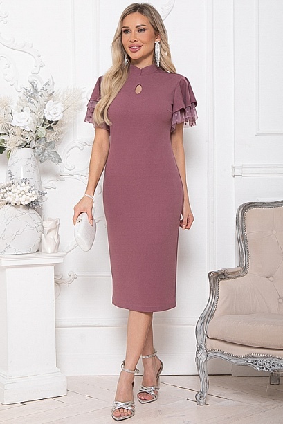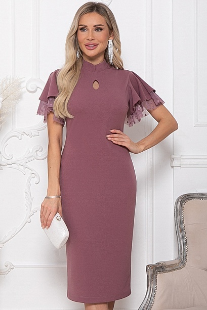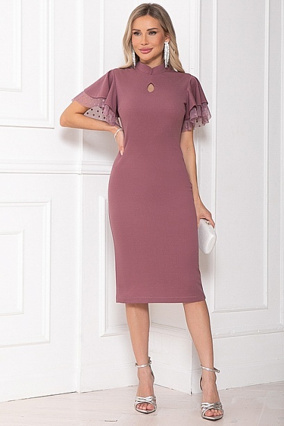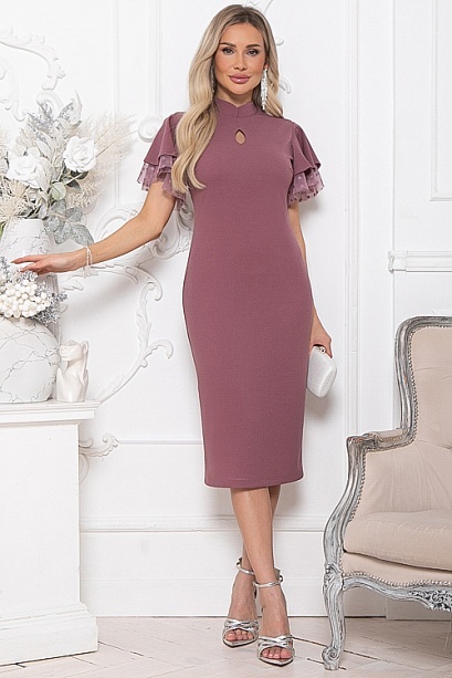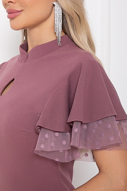 Нарядное платье из трикотажного полотна с легким люрексом полуприлегающего силуэта.Горловина с фигурной стойкой.По полочке эффектная капля.Романтический образ дополняют двойные рукава воланы,верхний из основного трикотажа,нижний из сетки.В среднем шве спинки застежка молния и шлица по низу.