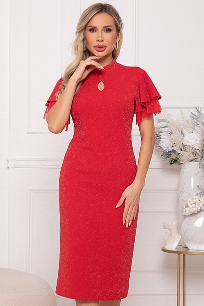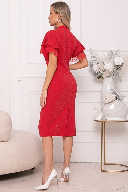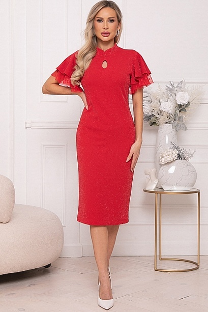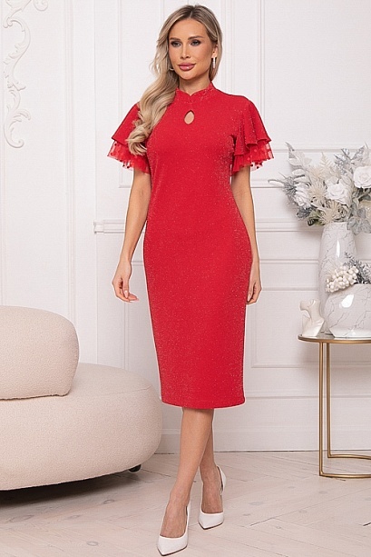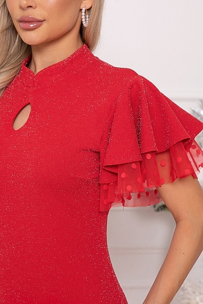 Нарядное платье из трикотажного полотна с легким люрексом полуприлегающего силуэта.Горловина с фигурной стойкой.По полочке эффектная капля.Романтический образ дополняют двойные рукава воланы,верхний из основного трикотажа,нижний из сетки.В среднем шве спинки застежка молния и шлица по низу.