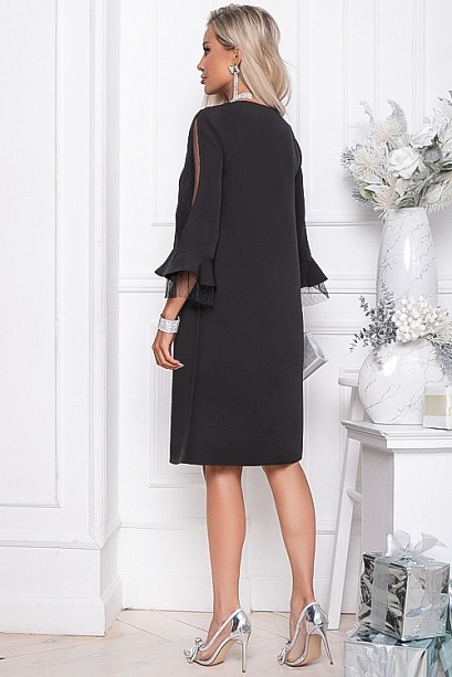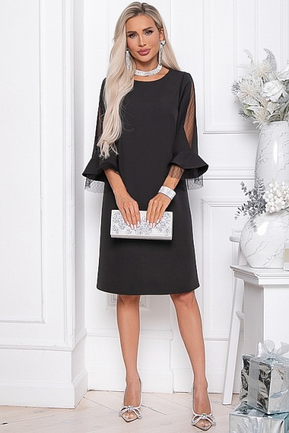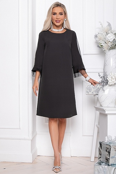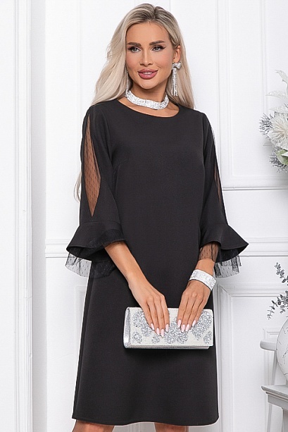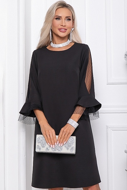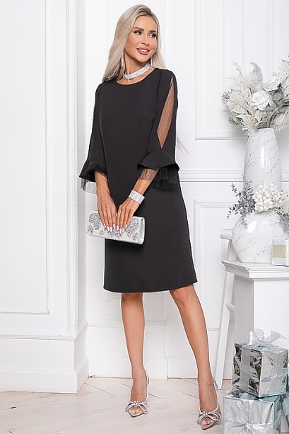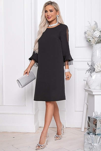 Платье А-образного силуэта из костюмной ткани.Рукав 3/4 с оригинальной вставкой из сетки и двойным воланом,верхний из основной ткани,нижний из сетки.