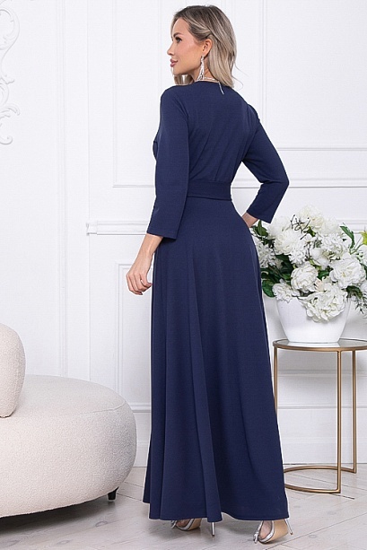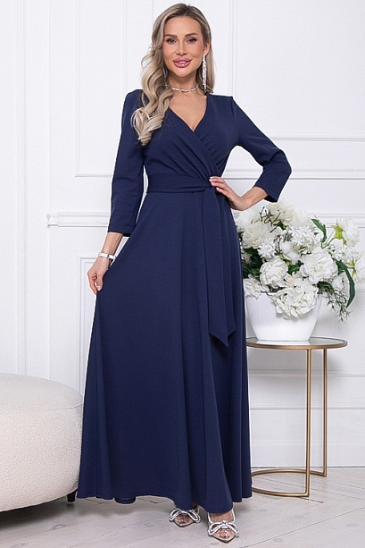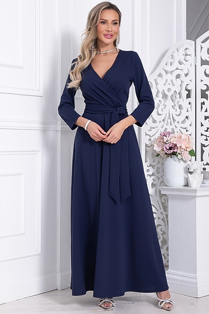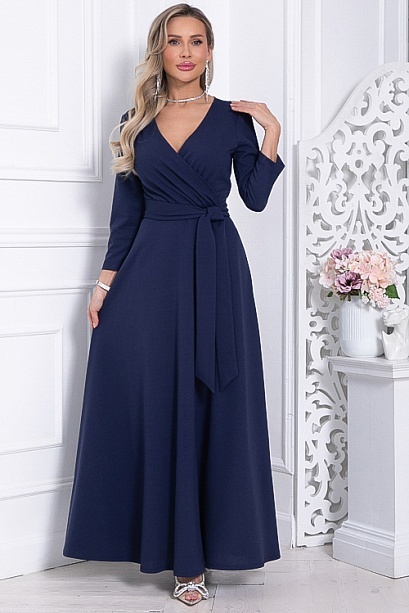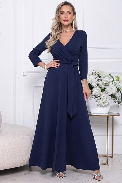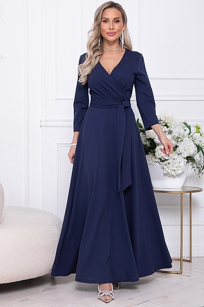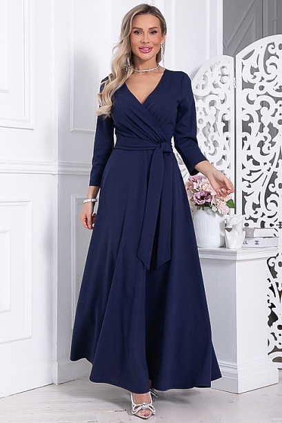 Нарядное элегантное платье из трикотажного полотна,отрезное по лини талии с расклешенной юбкой.Лиф платья с полным запахом,задрапированным по линии талии.Пояс из основной ткани в комплекте.