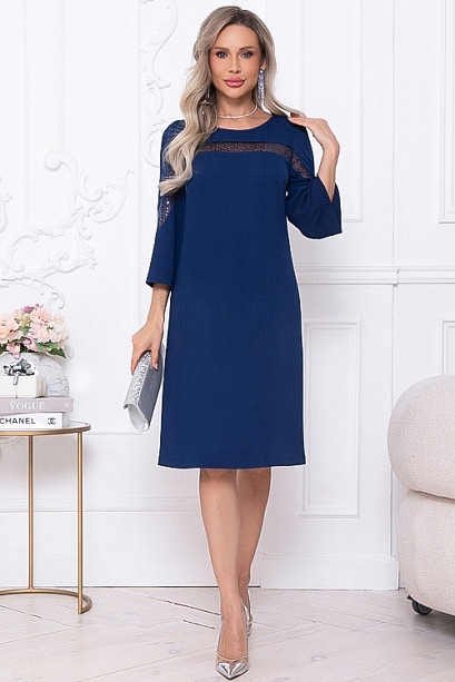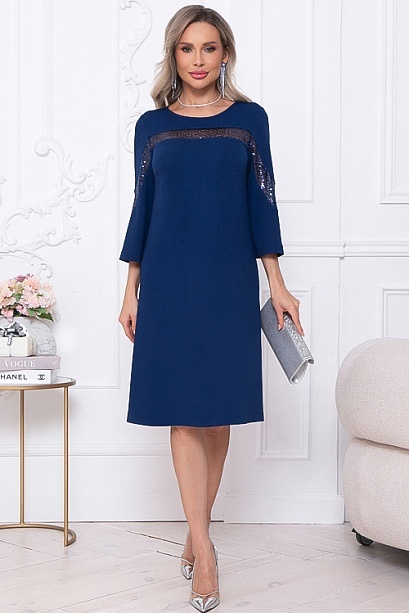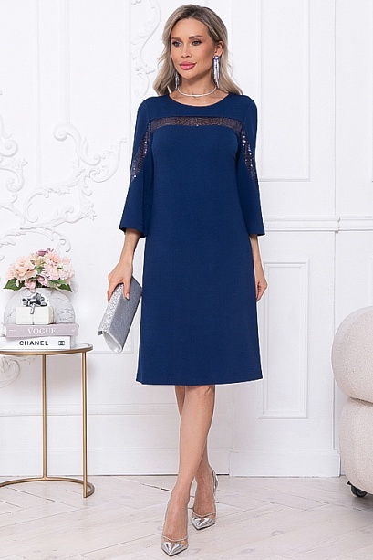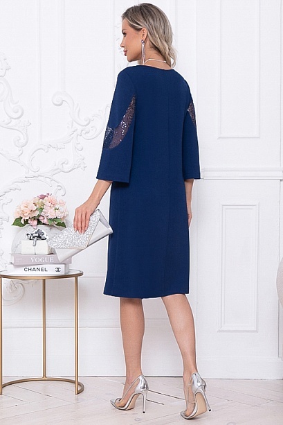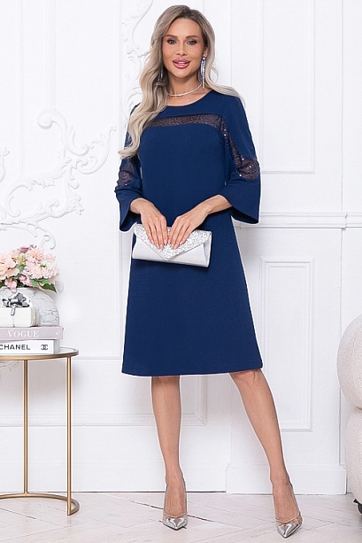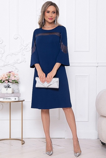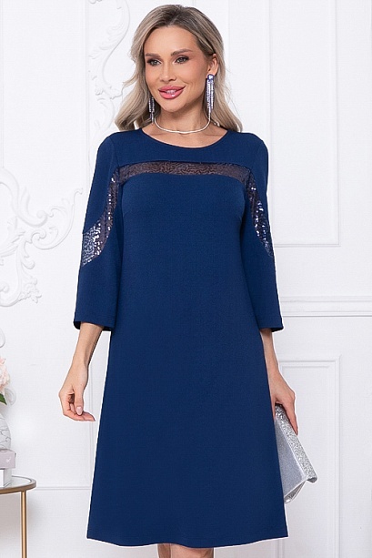 Платье из трикотажного полотна А-образного силуэта,по рукавам и полочке вставки из сетки с пайетками.