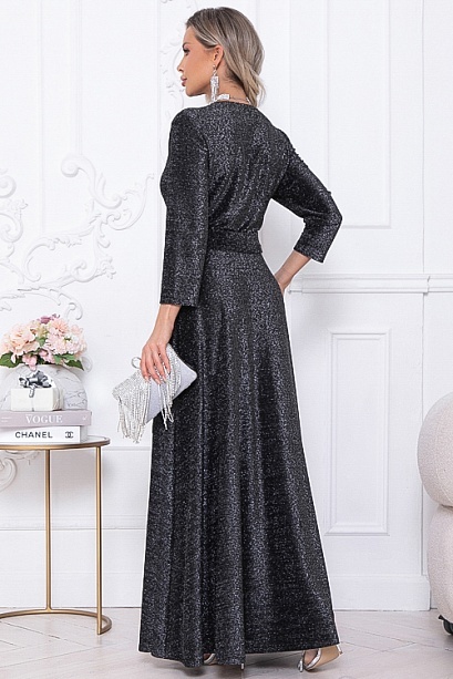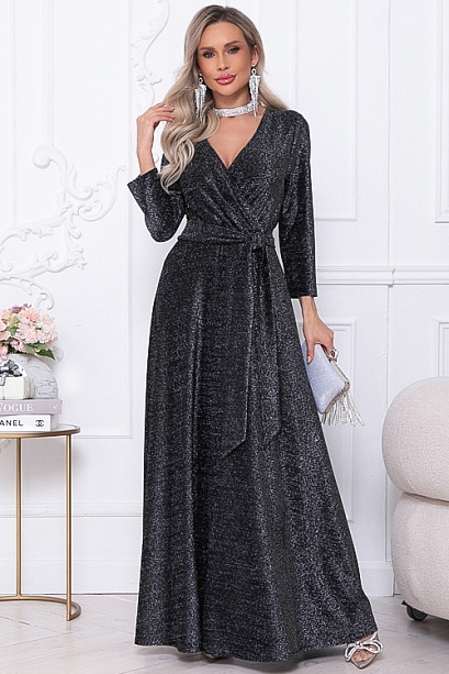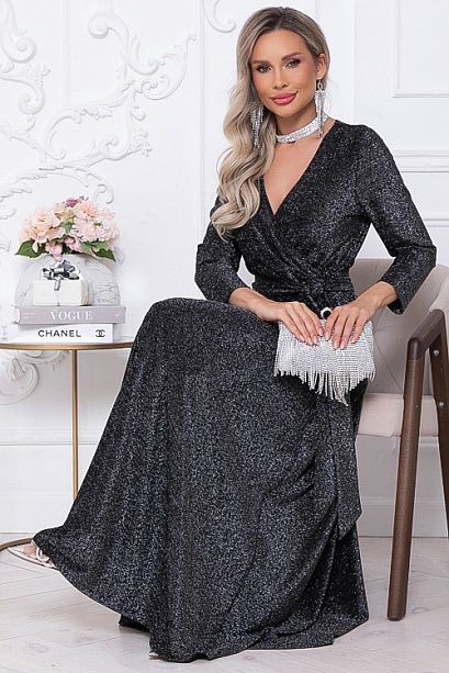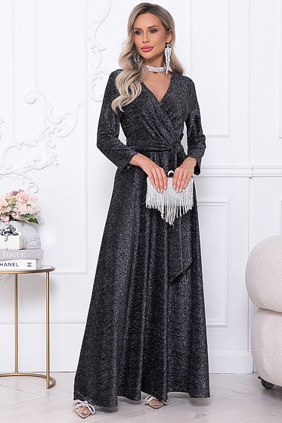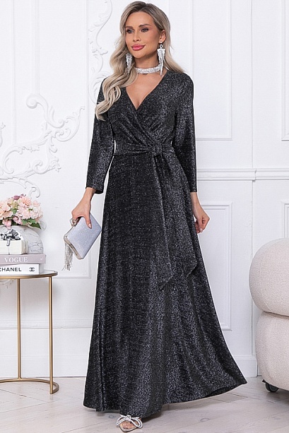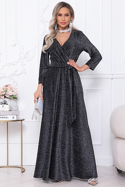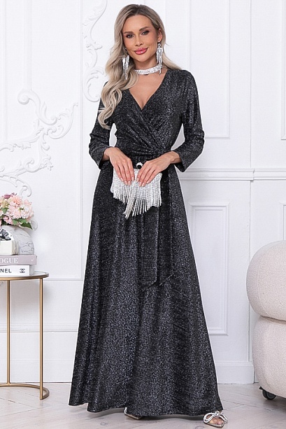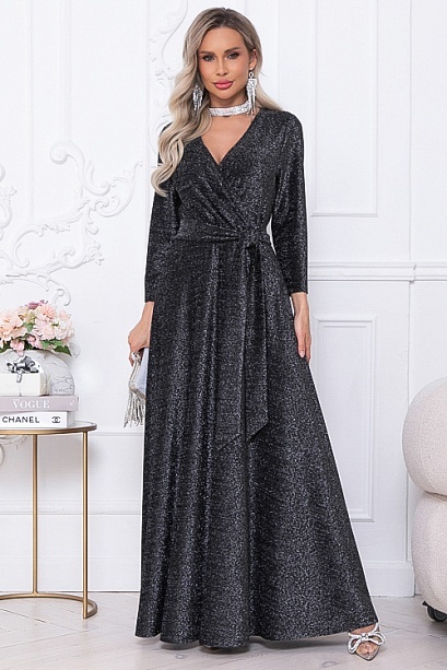 Нарядное элегантное платье из трикотажного полотна с люрексом,отрезное по лини талии с расклешенной юбкой.Лиф платья с полным запахом,задрапированным по линии талии.Пояс из основной ткани в комплекте.