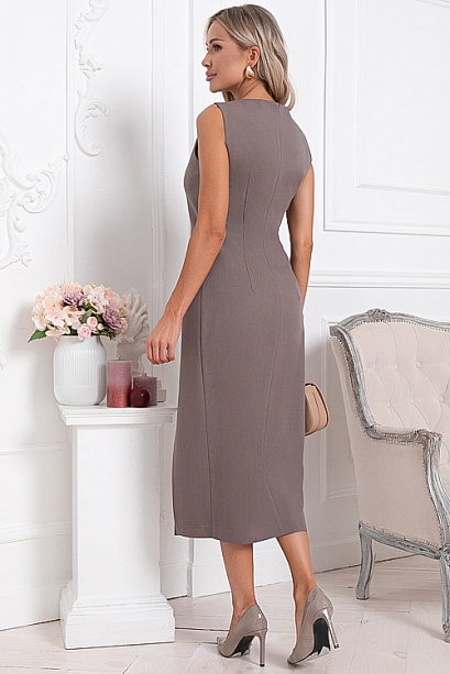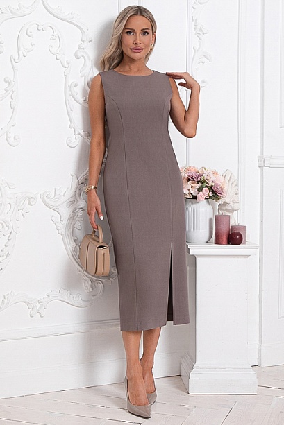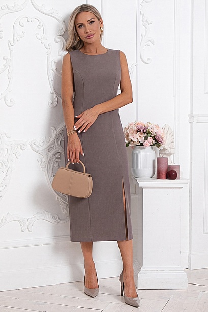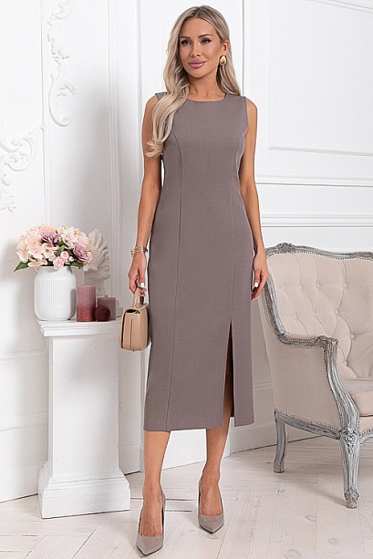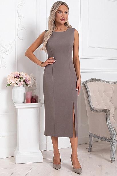 Платье полуприлегающего силуэта из костюмной ткани.Горловина лодочка,по переду рельефы и разрез по ноге.В среднем шве спинки потайная молния.