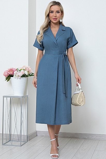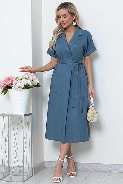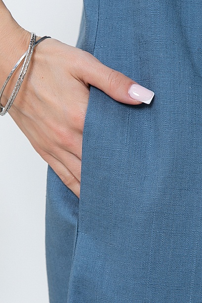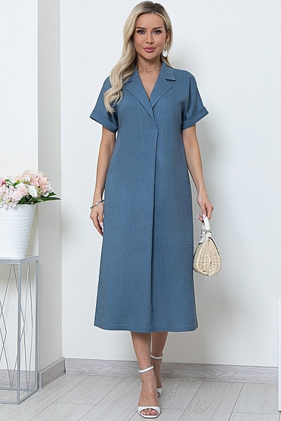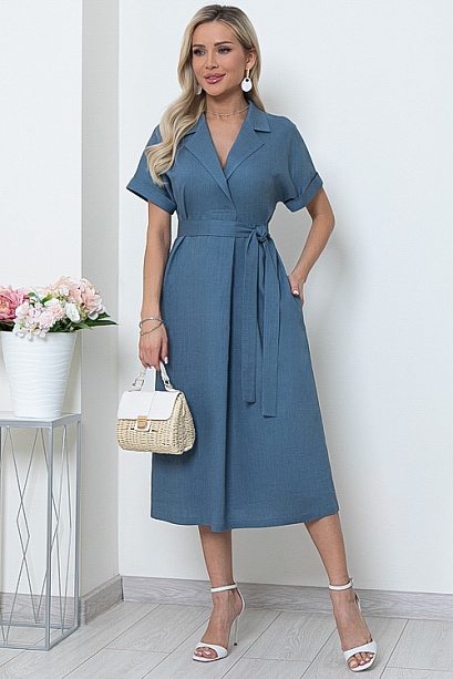 Льняное платье свободного А-образного силуэта с цельнокроеными рукавами.Воротник отложной с лацканами,переходящими в мягкую складку по центру переда.В боковых швах функциональные карманы.Пояс из основной ткани в комплекте.