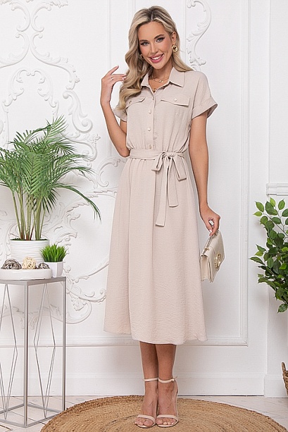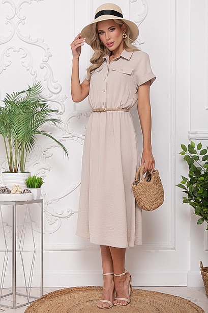 * Платье в стиле сафари из текстильного полотна,отрезное по линии талии с расклешенной юбкой присборенной на резину.Лиф с цельнокроеными рукавами и центральной застежкой до талии на пуговицы,по переду декоративные клапаны.Пояс из основной ткани в комплекте.