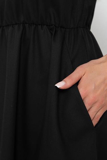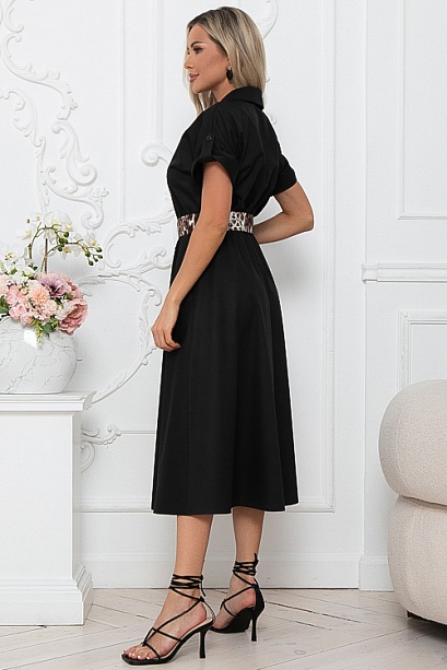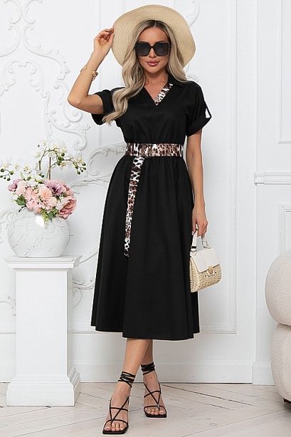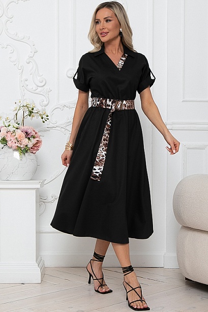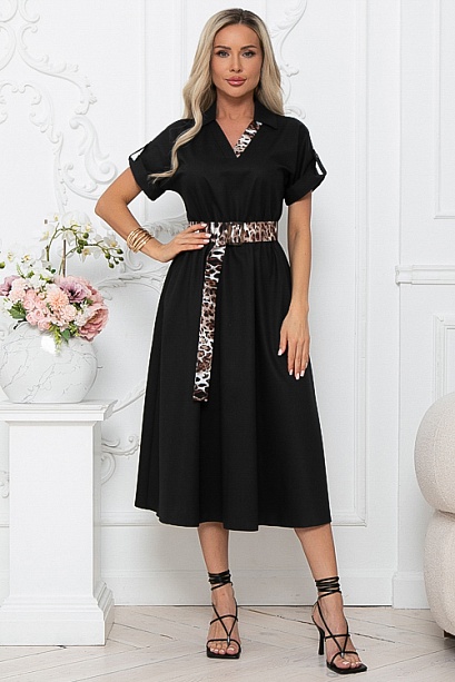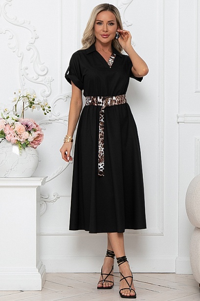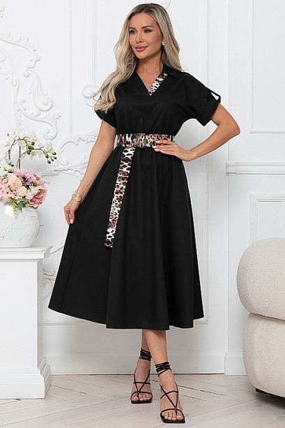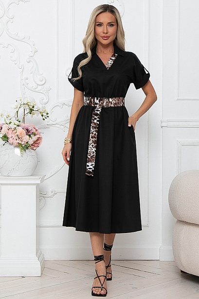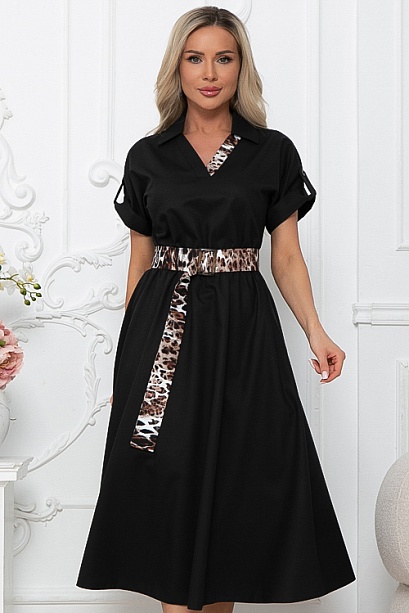 Платье из легкой костюмной ткани,отрезное по линии талии,присобрано на эластичную резину,с расклешенной юбкой.В боковых швах функциональные карманы.Лиф изделия с цельнокроеными рукавами с манжетой на пате.Горловина и пояс украшены декоративной леопардовой тканью(пояс с пряжкой в комплекте).