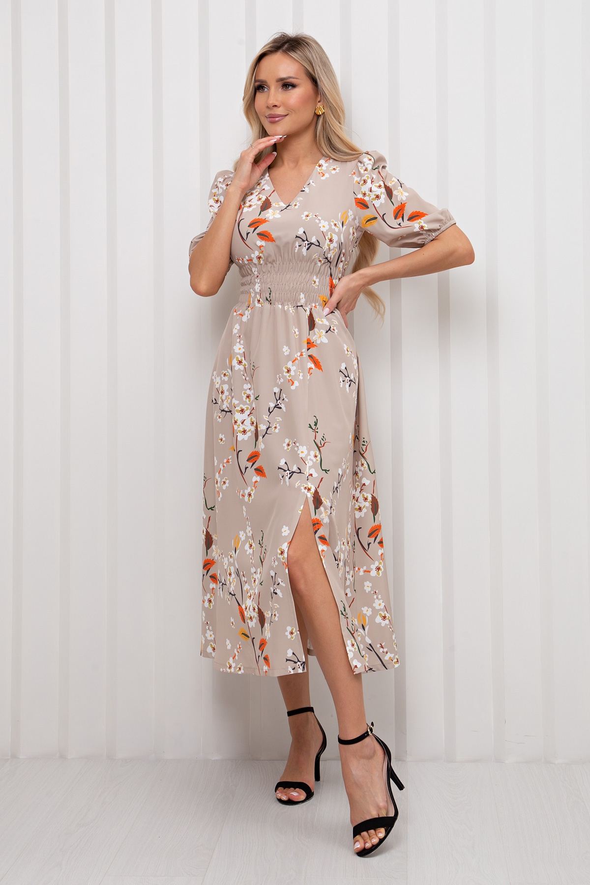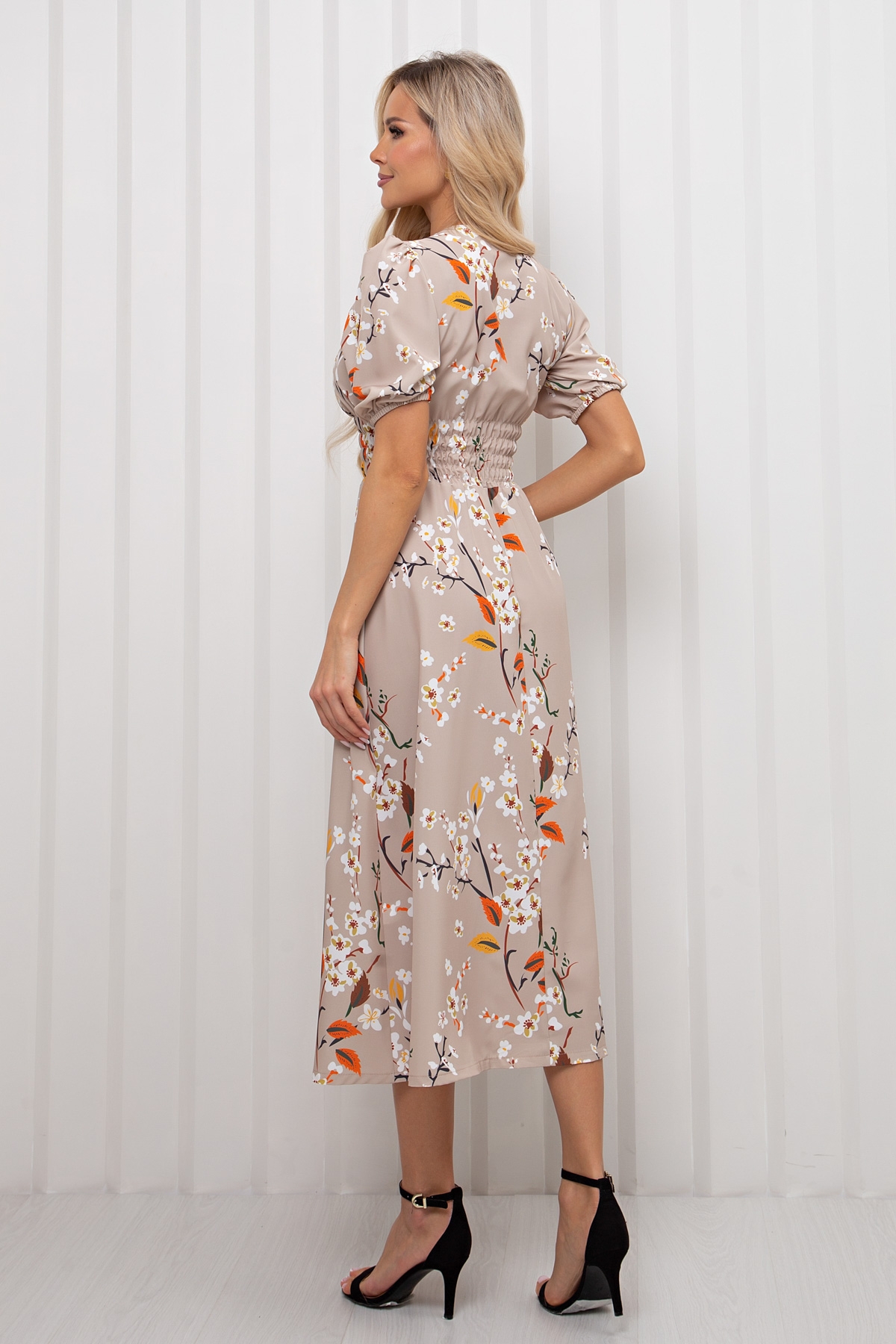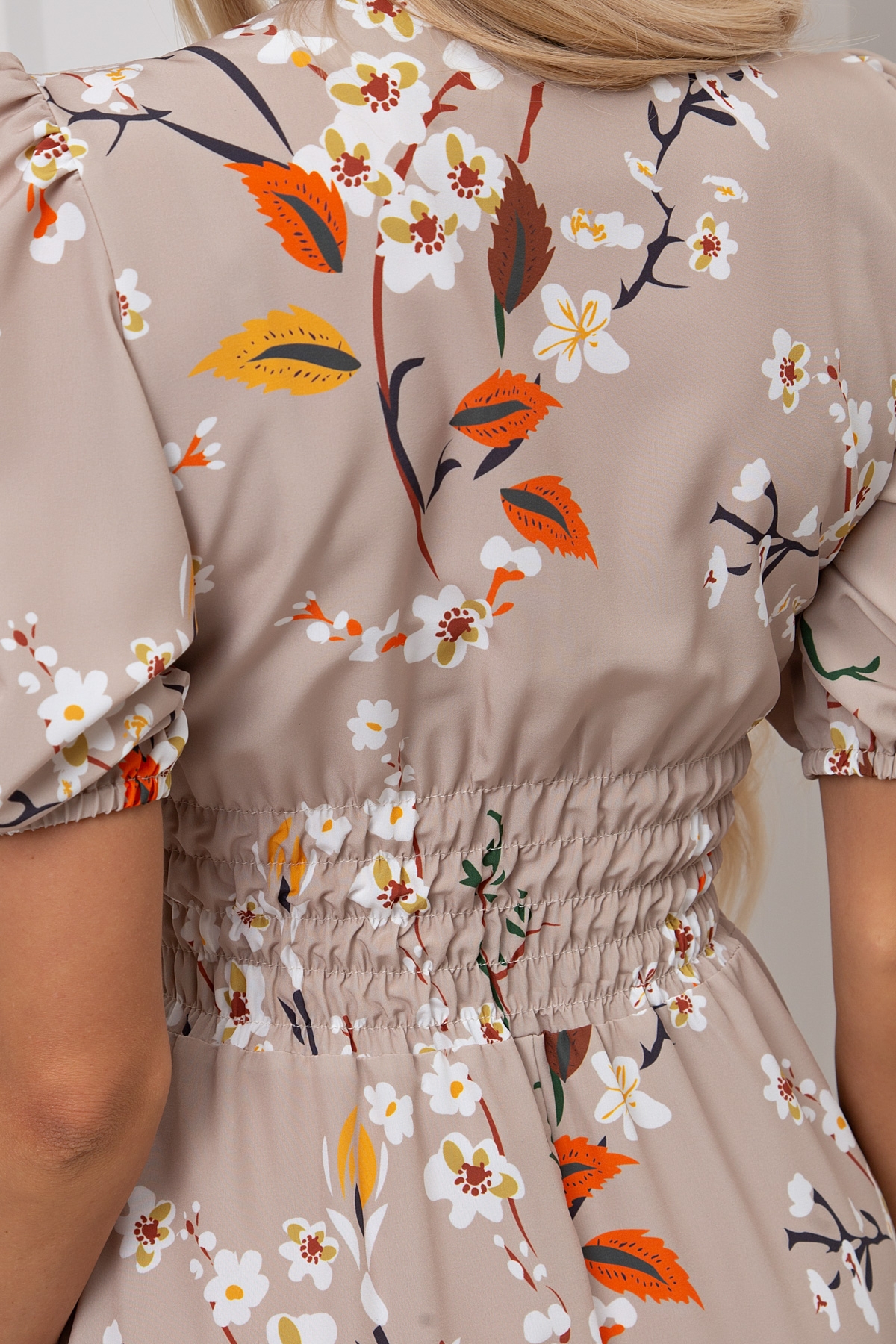 Легкое и воздушное платье из легкой ткани Ниагара. Присборенное по талии на эластичную резинку, создает эффект приталенного силуэта. V - образная горловина на внутренней обтачке. Короткий втачной рукав - фонарик на резинке. По переднему рельефу юбки разрез.