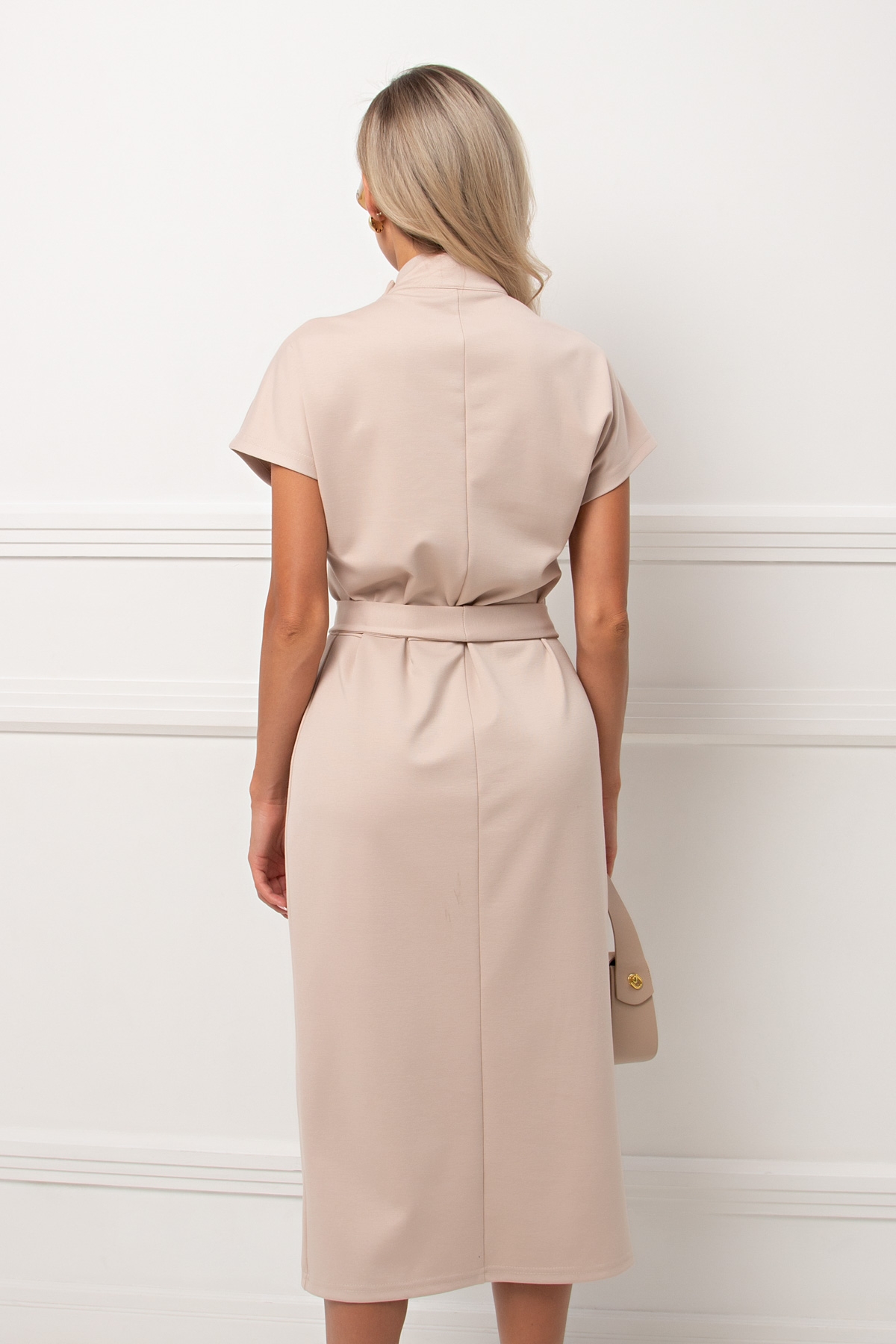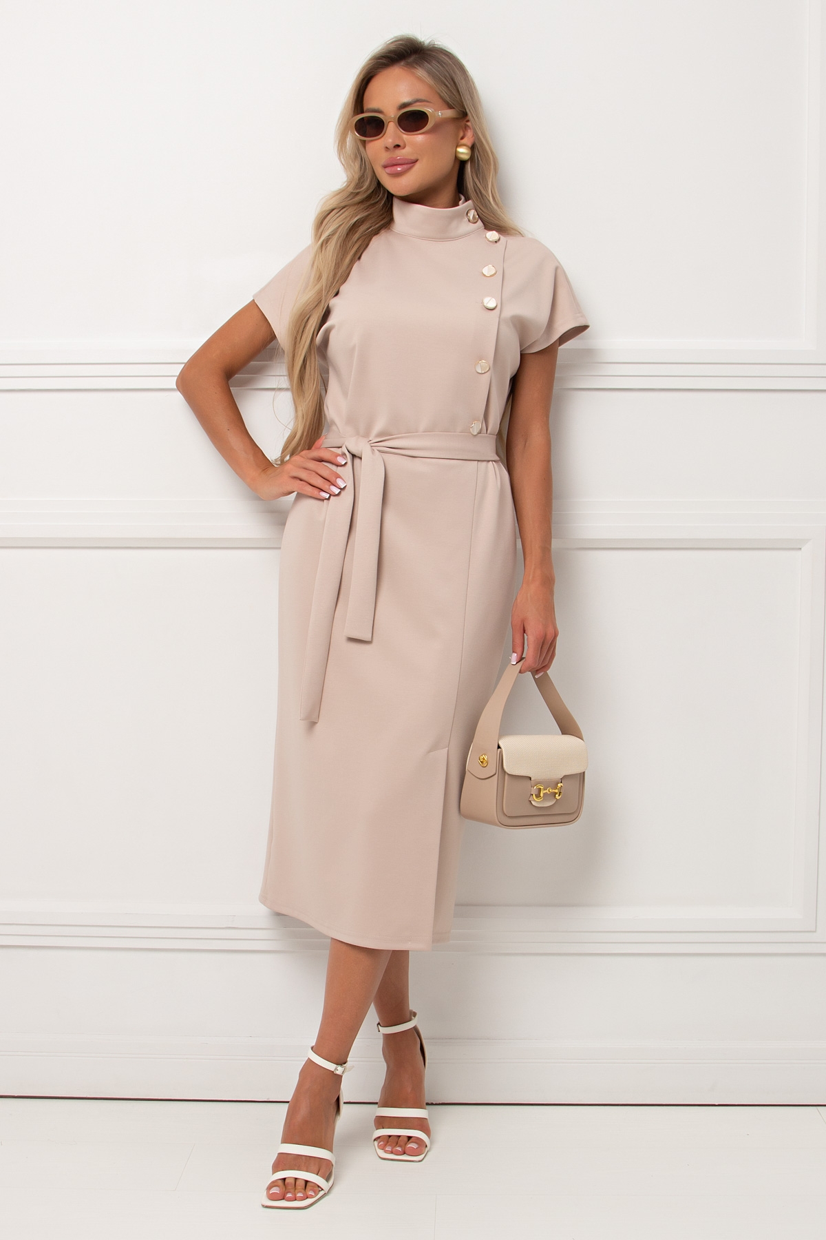 Стильное,элегантное платье прямого силуэта из трикотажного полотна. Короткий цельнокроеный рукав. Горловина оформлена воротником -стойка переходящая в планку с застежкой на петли и пуговицы. Модель отрезная по линии талии. Низ ровный,по переду шлица. Пояс из основной ткани в комплекте.